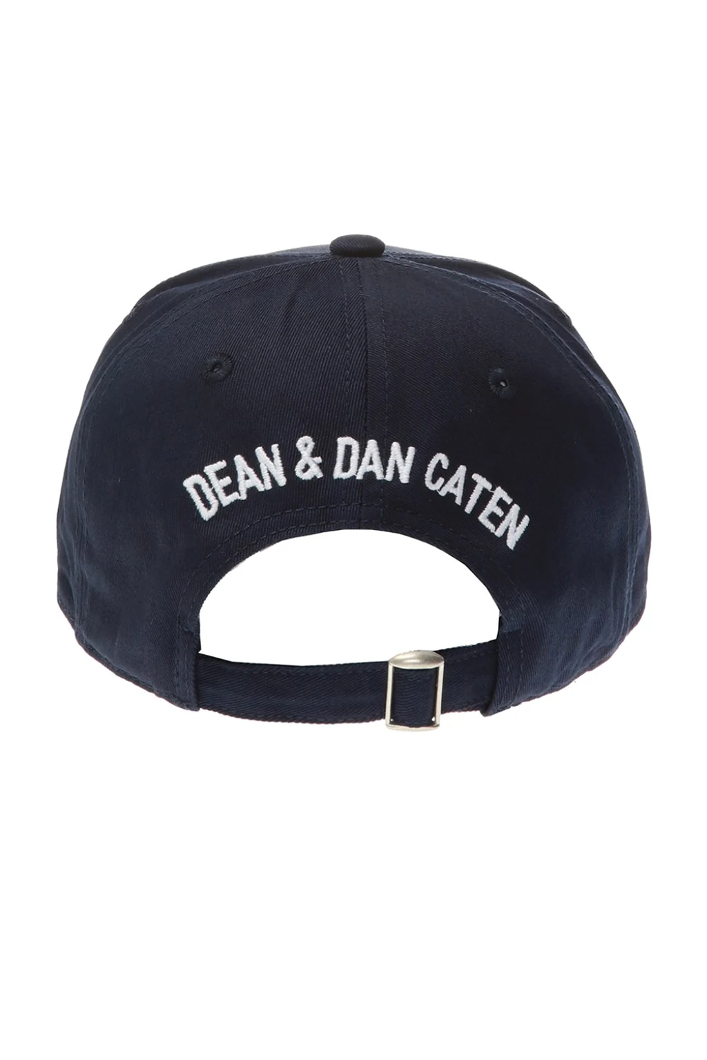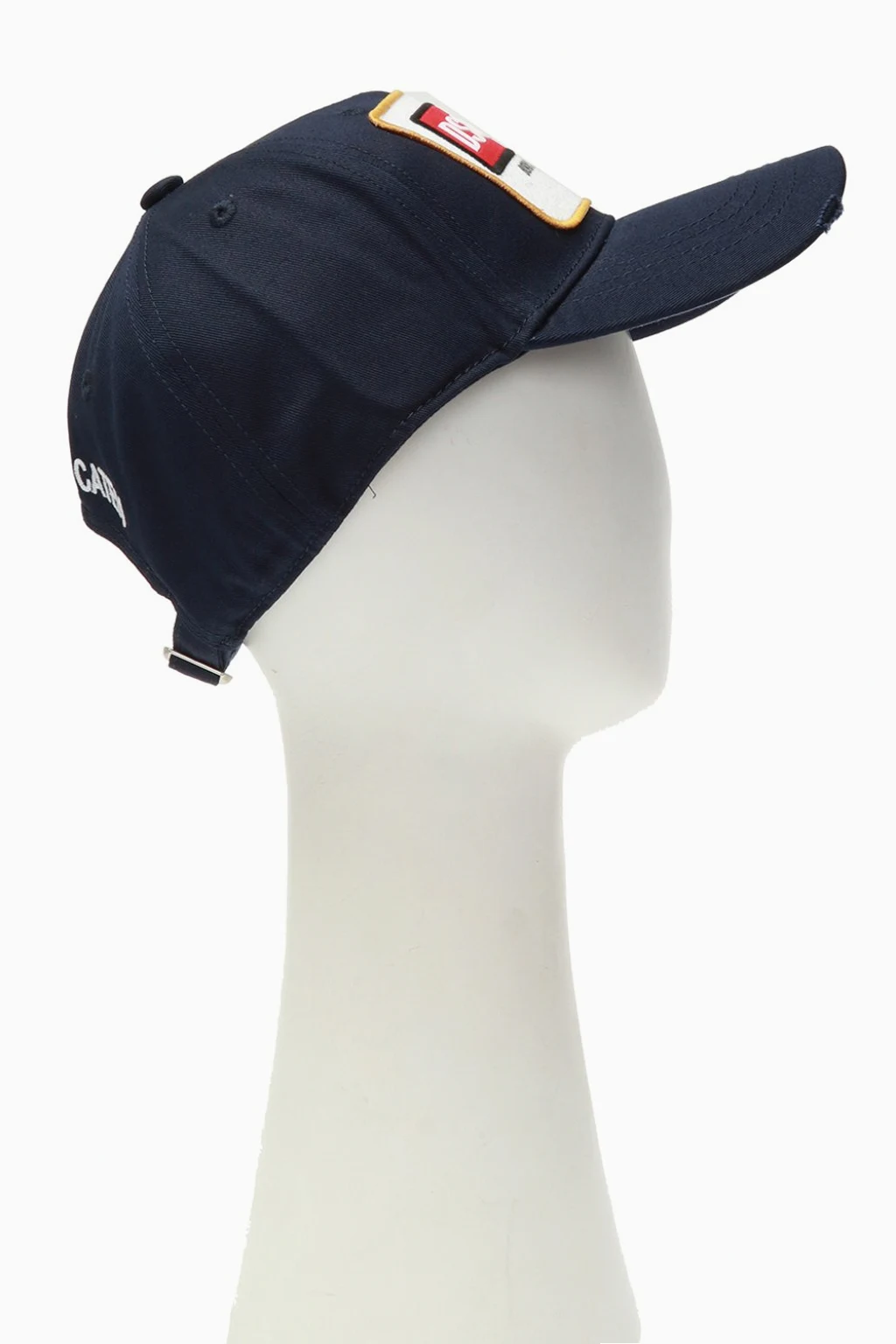 Navy distressed baseball cap from Dsquared2. Made of cotton. Front decorated with a colorful logo patch. White lettering sewn-on at the back.
