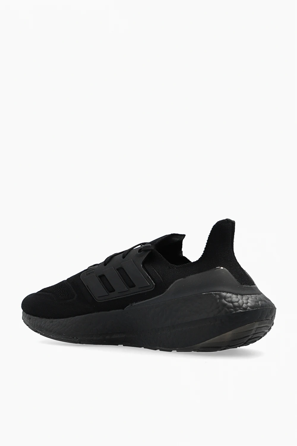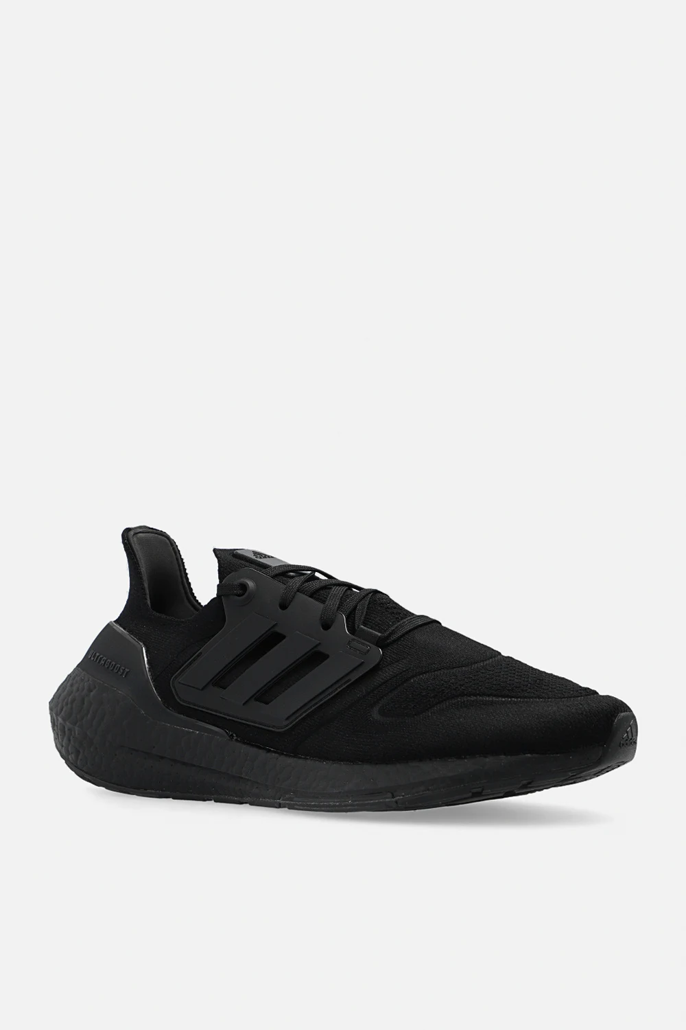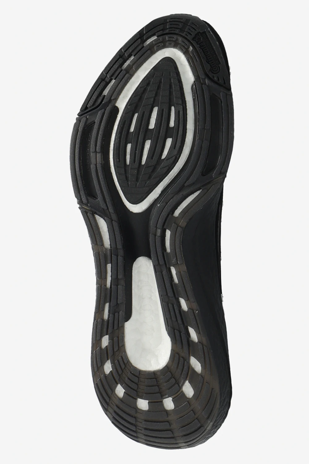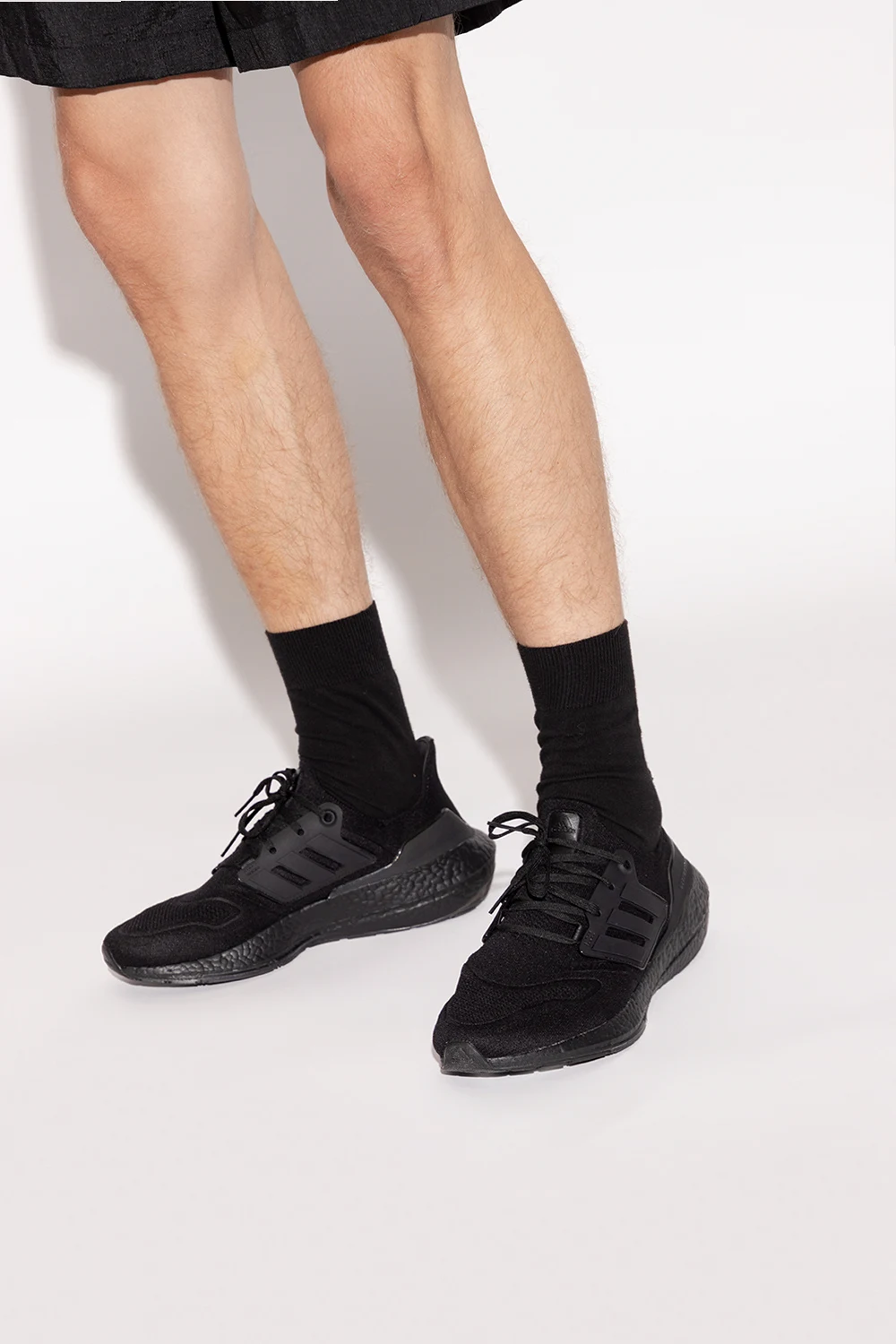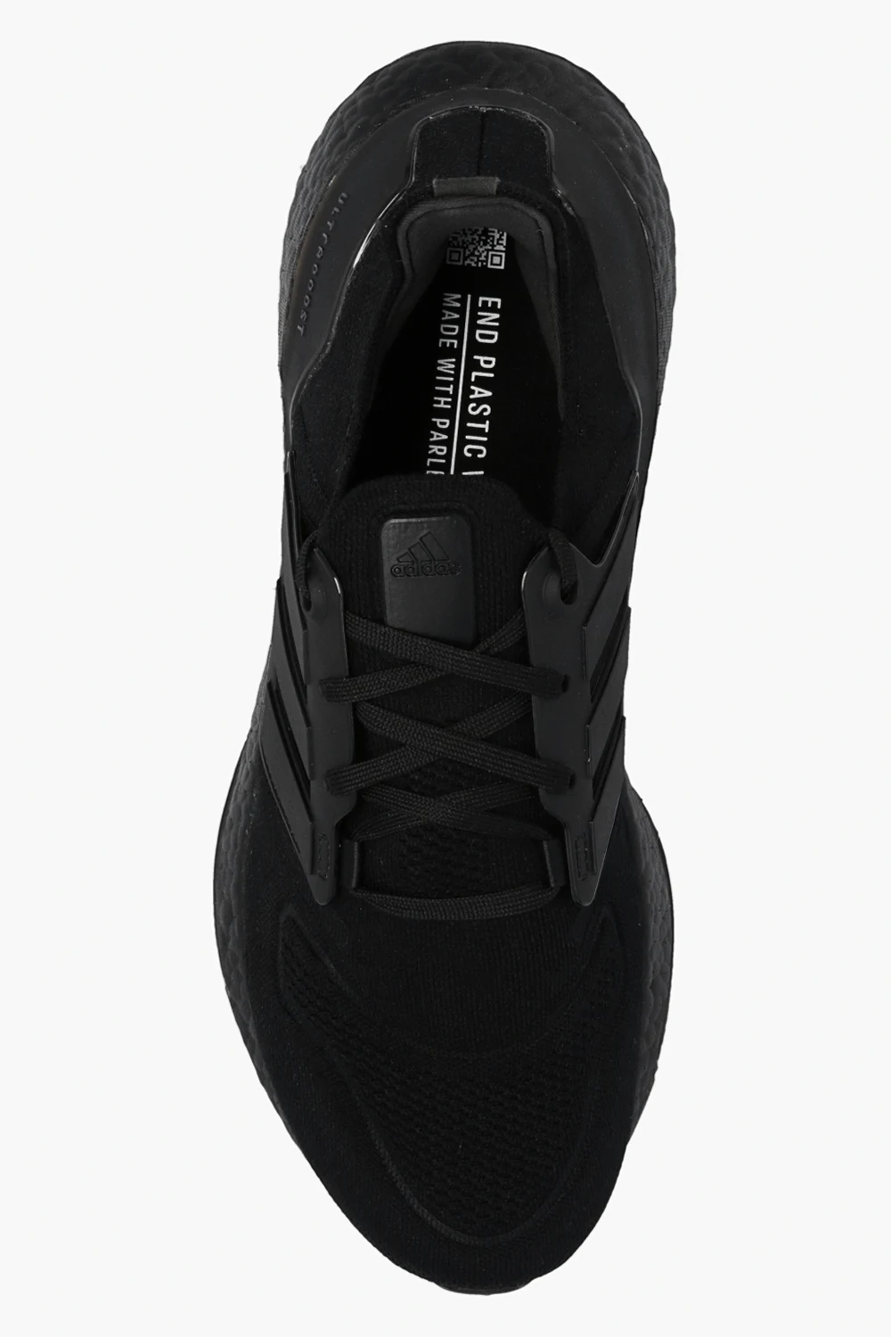 Black ‘Ultraboost 22’ sneakers from ADIDAS Originals. Made of fabric and rubber, this lace-up pair features a logo appliqué and rubber outsole sole in black and white. The adidas PRIMEKNIT upper includes foam around the heel to prevent blisters and is made with a high-performance Primeknit yarn which contains at least 50% Parley Ocean Plastic — reimagined plastic waste, intercepted on remote islands, beaches, coastal communities and shorelines, preventing it from polluting our ocean. The other 50% of the yarn is recycled polyester.