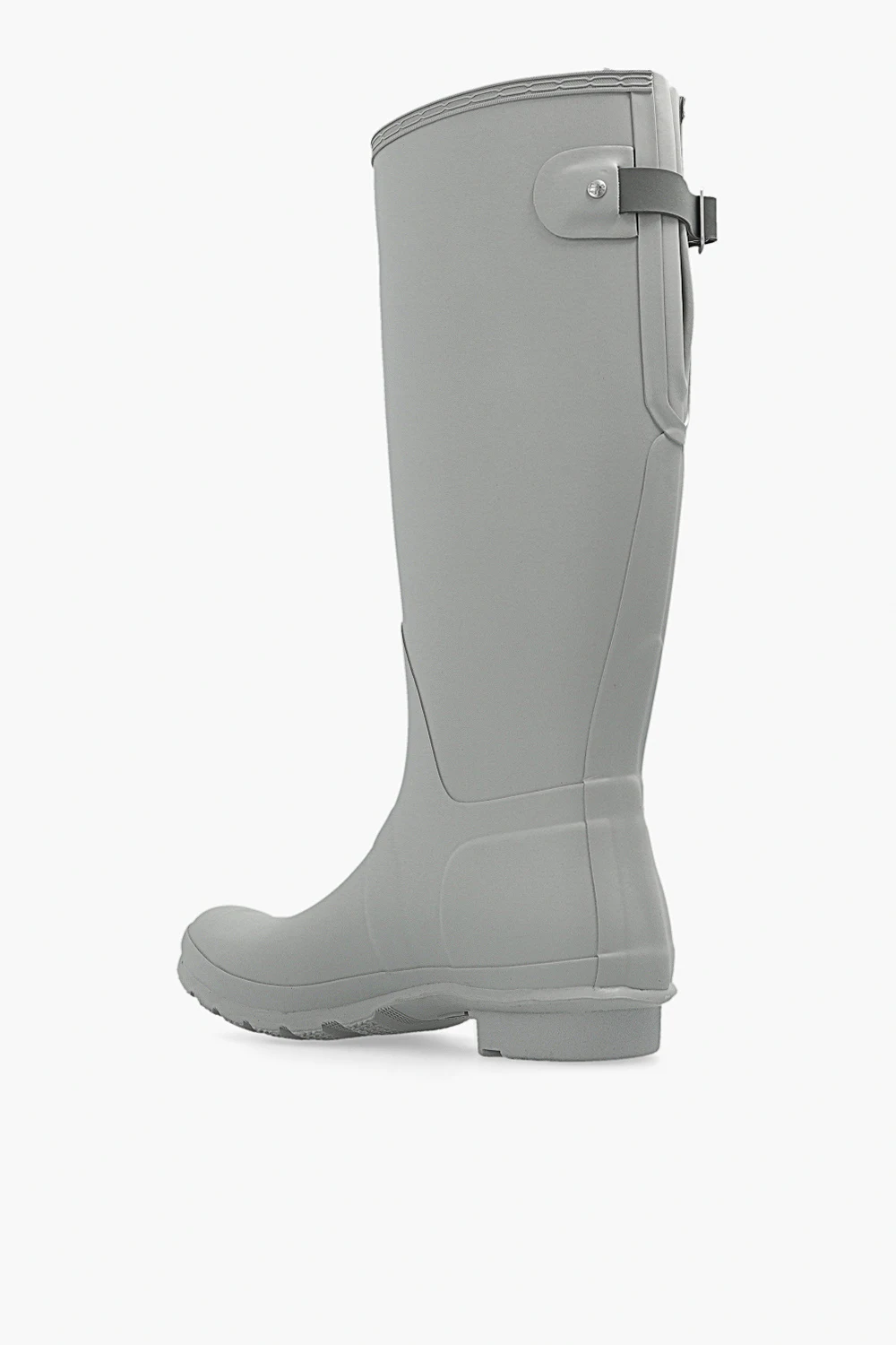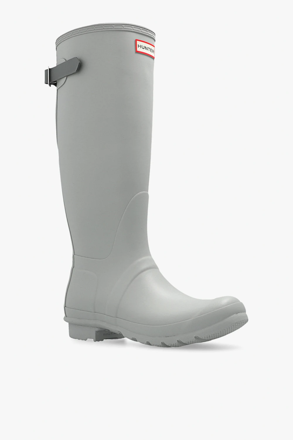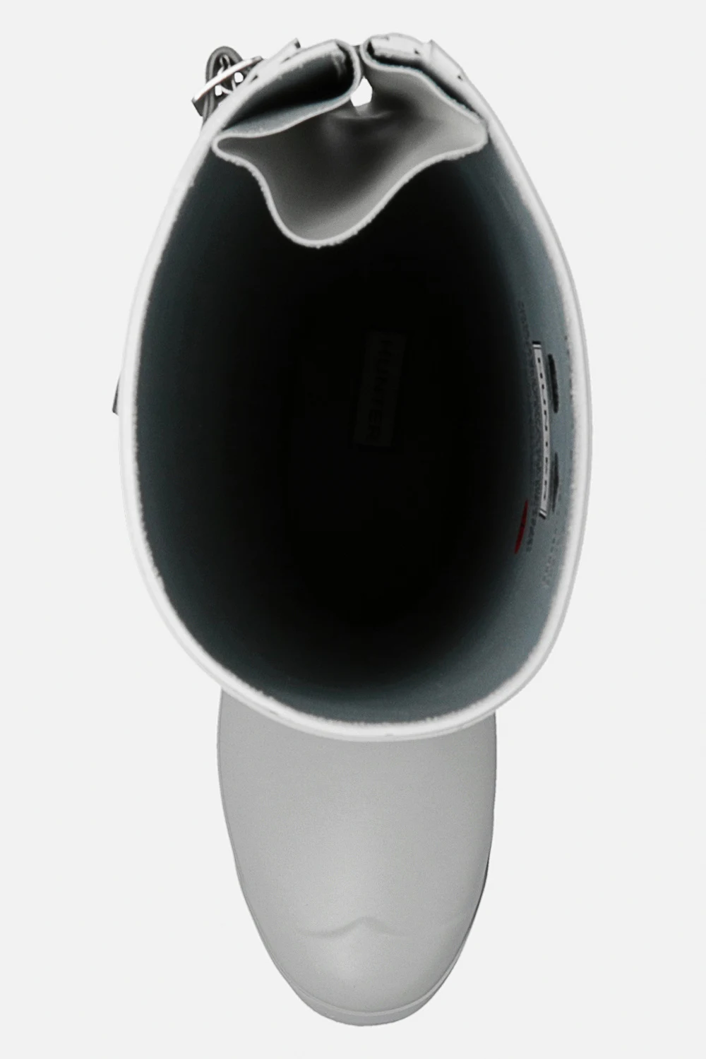 Light grey ‘Original Tall’ rain boots from Hunter. Handcrafted from 28 parts made of vulcanised rubber with matte finish, this pair features a logo appliqué, adjustable buckle strap to the side and rubber sole with Hunter Original tread pattern.