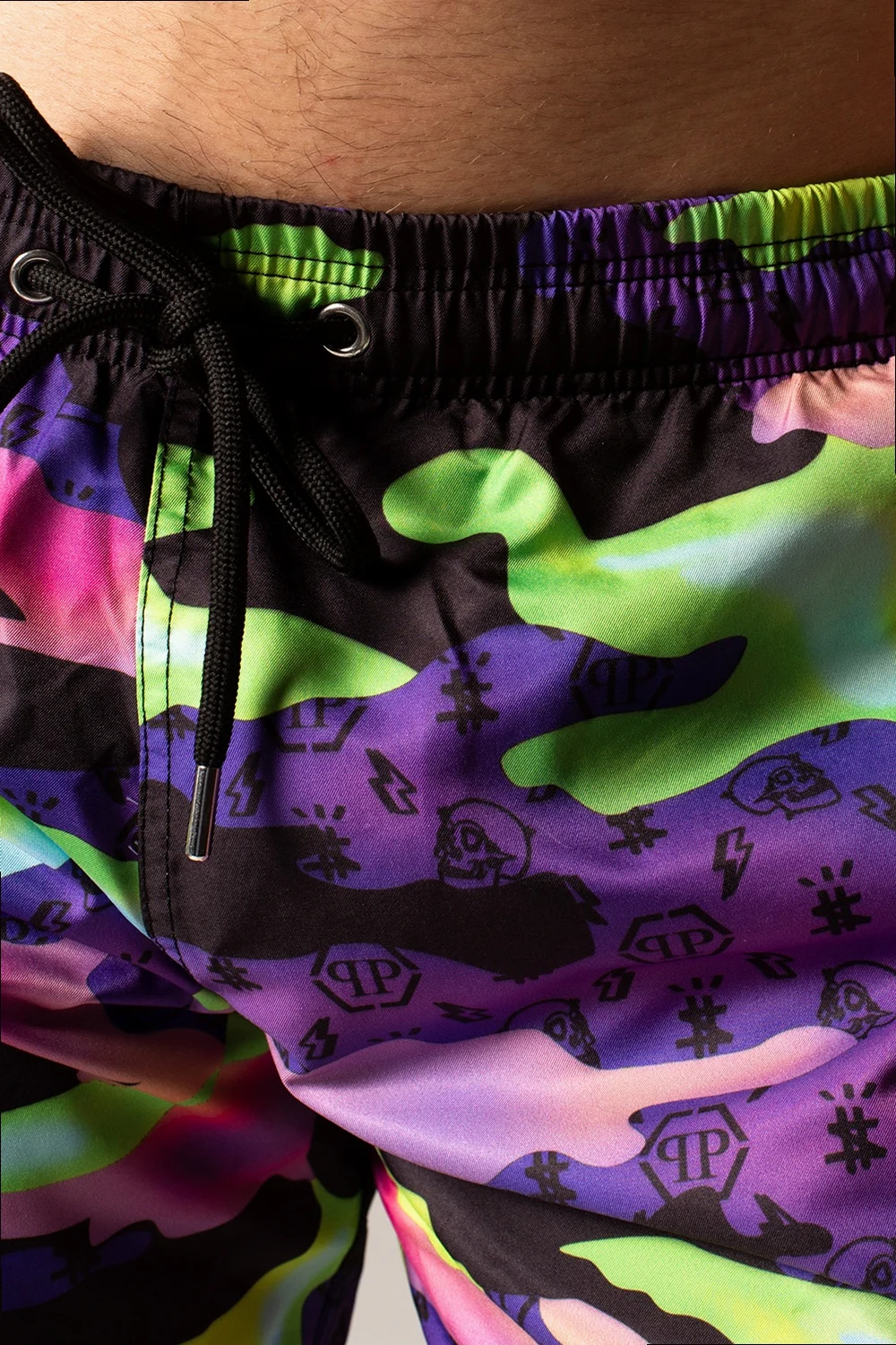 Purple and green swim shorts from Philipp Plein. Illustrated with a graphic print, this item features a drawcord-adjustable waist, two side seam pockets, one back welt pocket and a rubberised logo emblem.