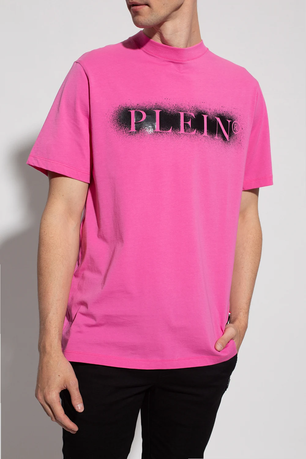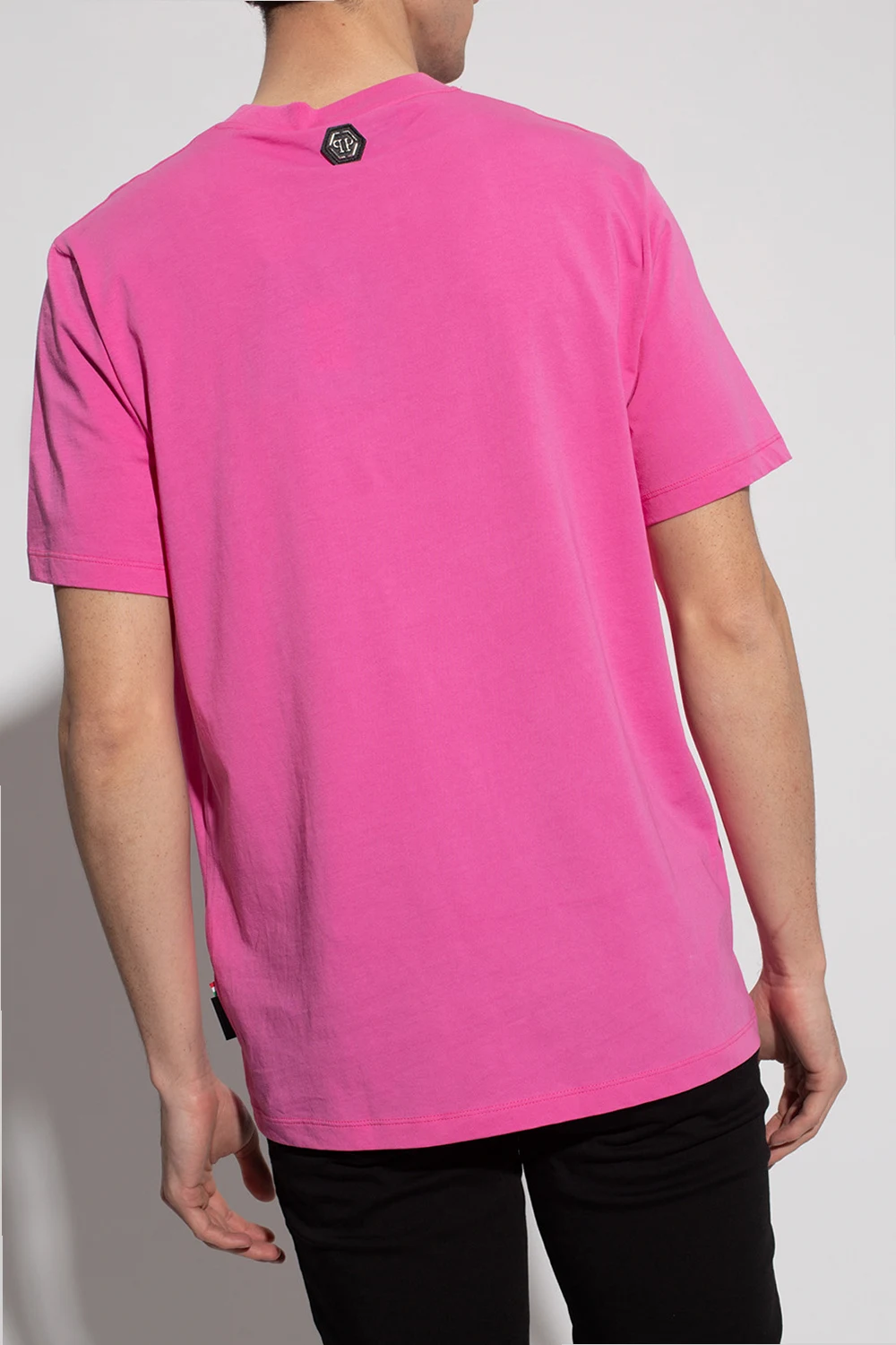 Pink crewneck T-shirt from Philipp Plein. Made of cotton, this style features short sleeves, rib detailing on the collar and a black graphic print with the brand's logo.