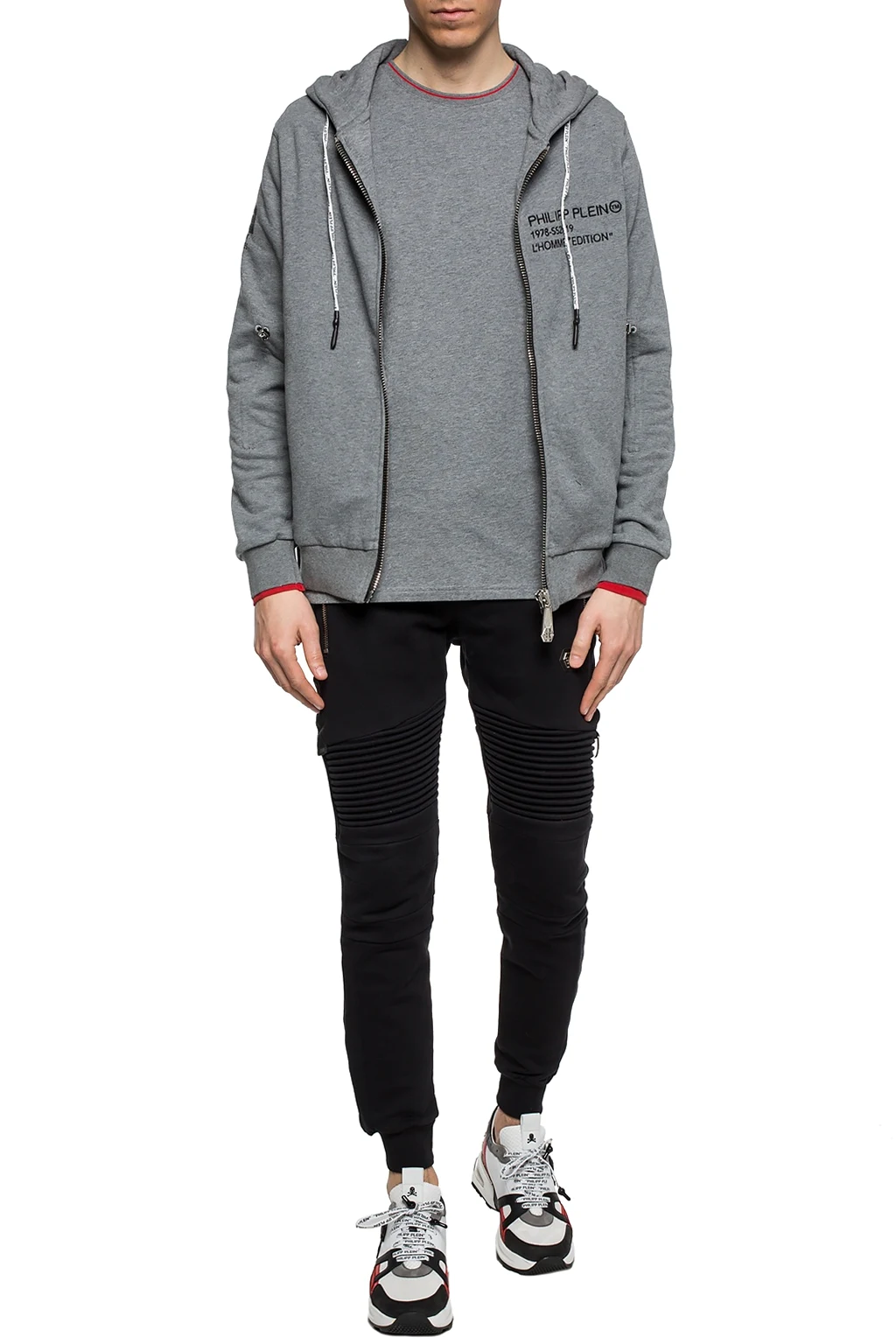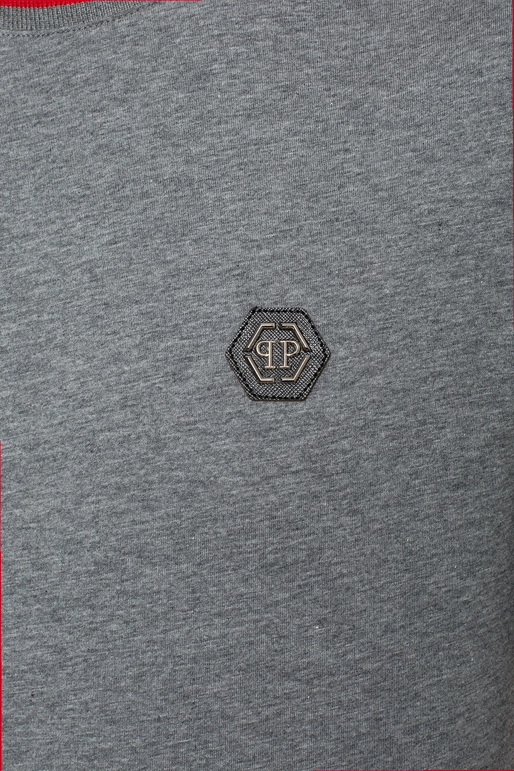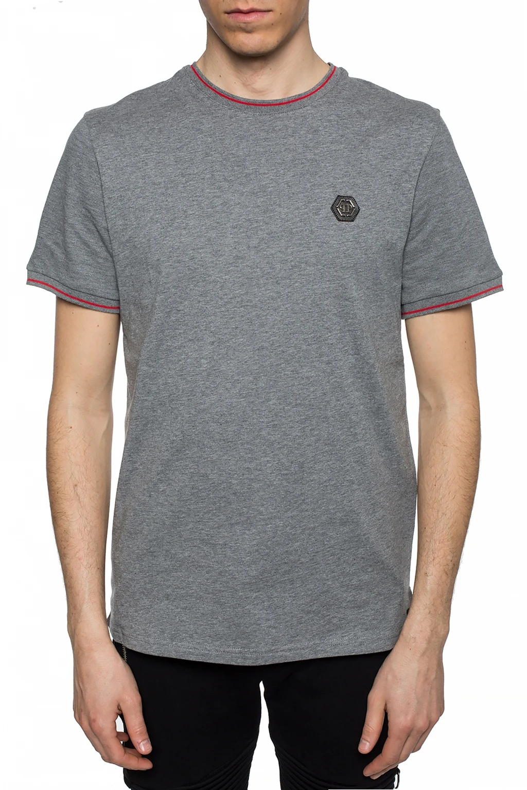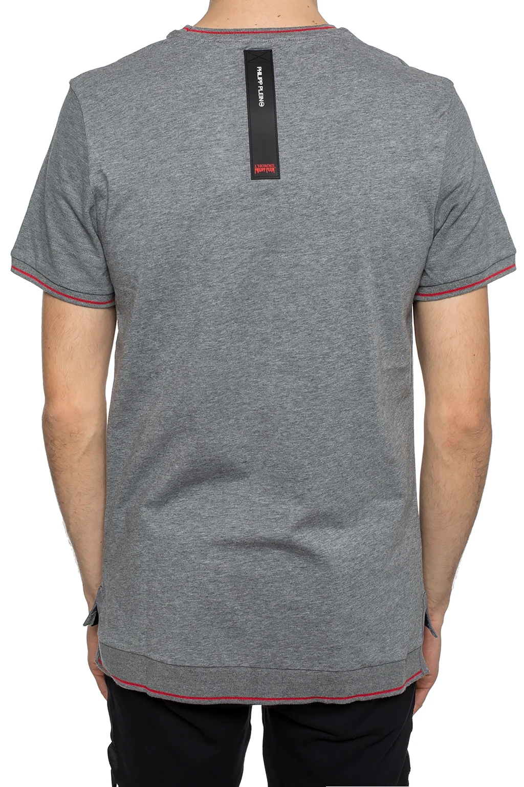 Grey crewneck T-shirt from Philipp Plein. Made of cotton. Enriched by black, silver-tone and red piping and logo plaque.