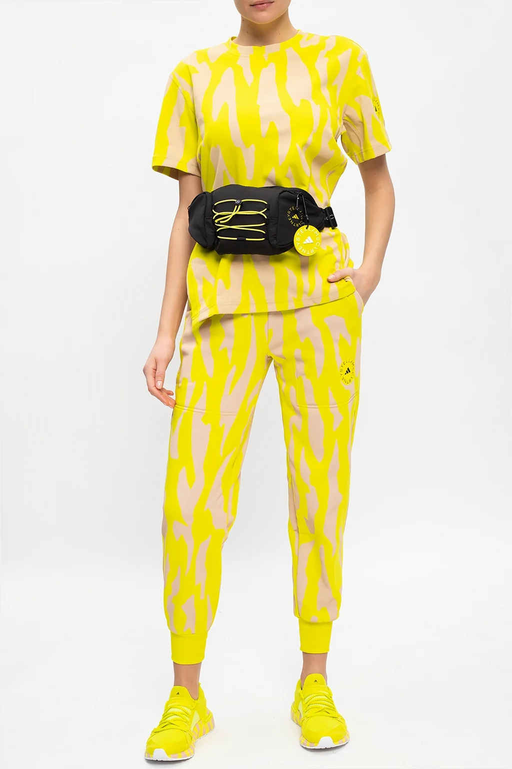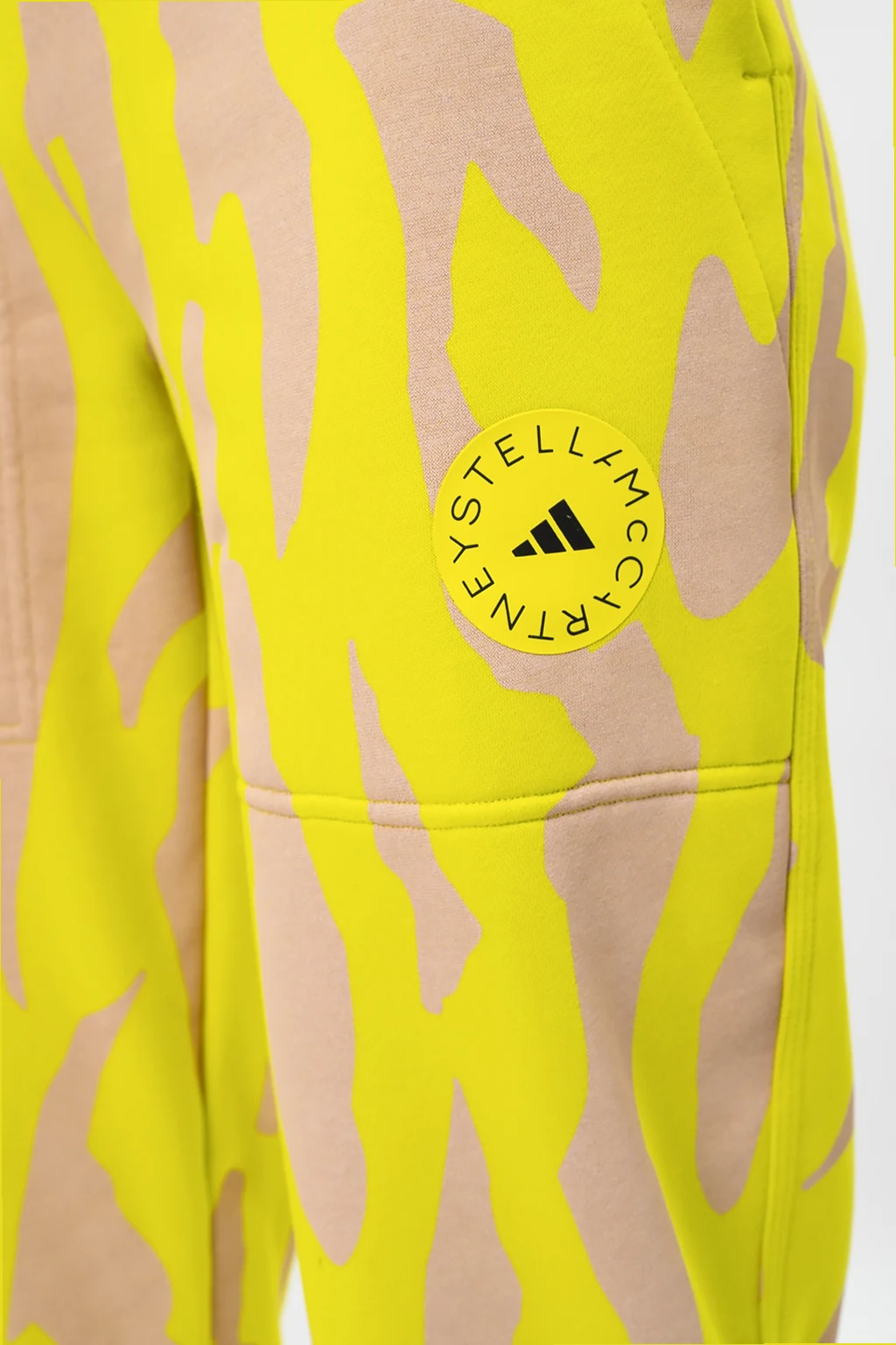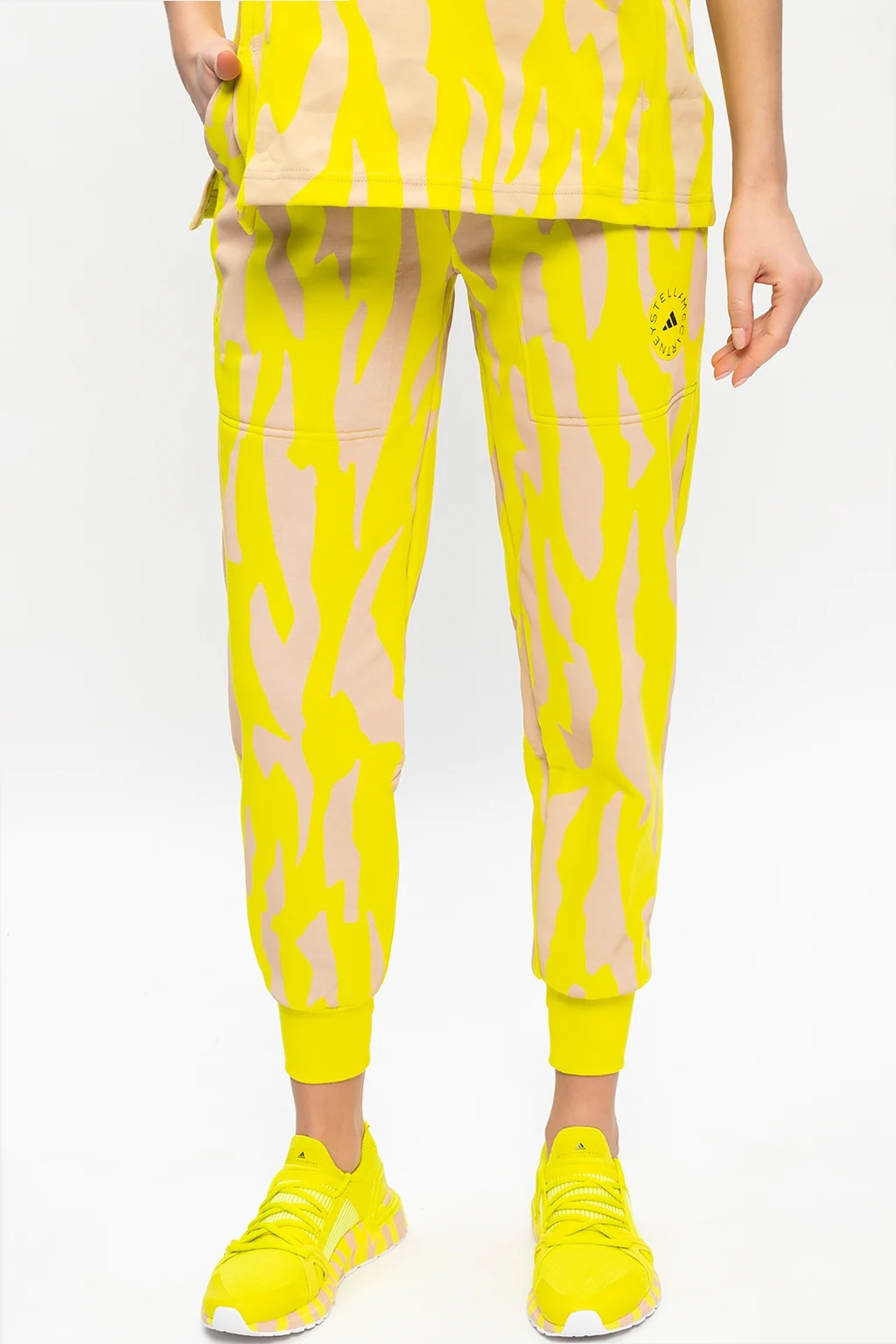 Neon yellow and beige sweatpants from ADIDAS by Stella McCartney. Made of cotton, this design is complete with a drawstring waist, logo patch, two slip pockets and ribbed cuffs.