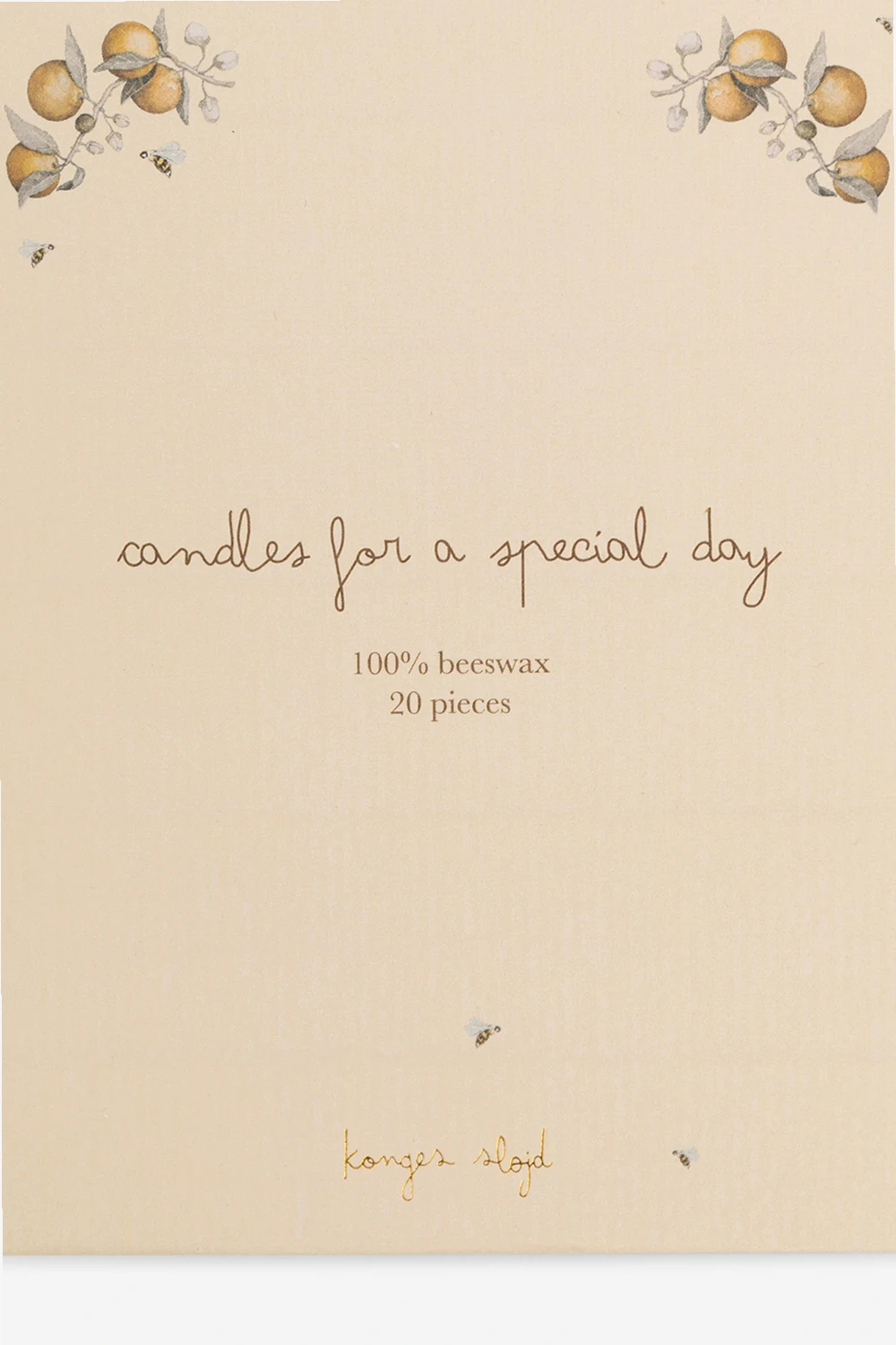 20-pack of natural colored birthday candles from Konges Slojd. Made of 100% natural beeswax with a cotton wick. Each candle burns for approximately 2 hours