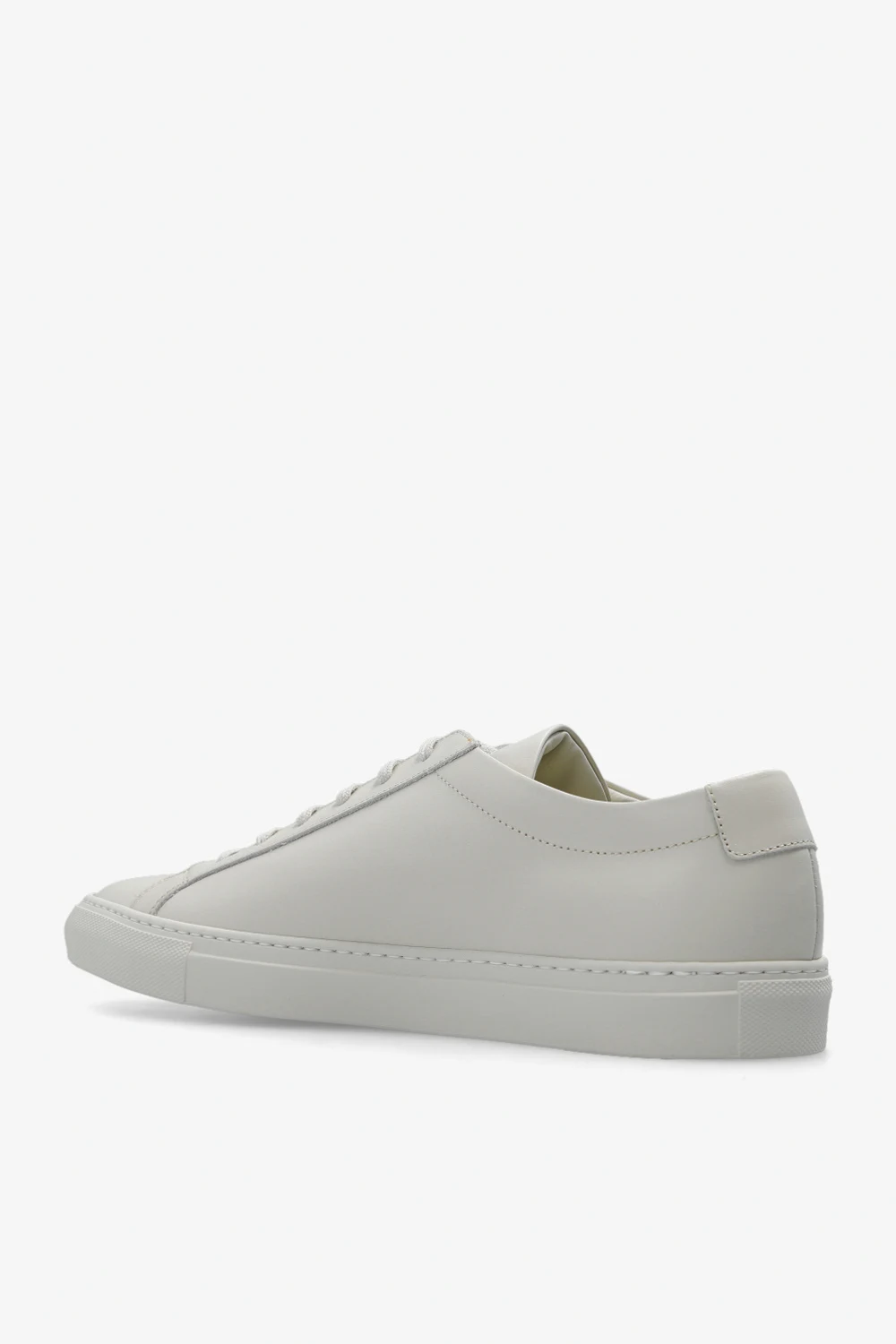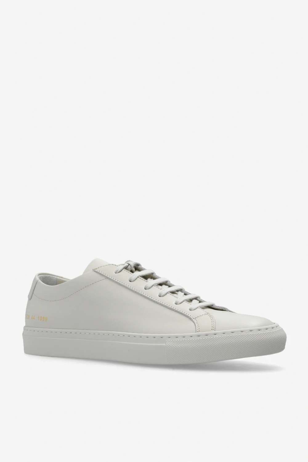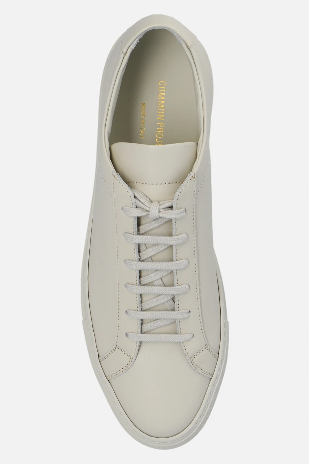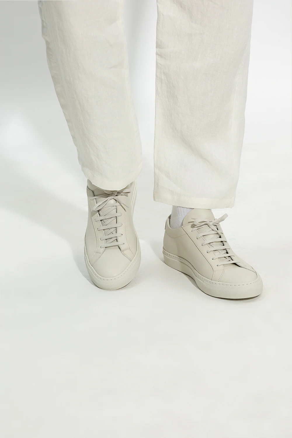 Cream ‘Original Achilles Low’ sneakers from Common Projects. Crafted from leather, this lace-up model sits on a cream rubber and showcases a signature gold-tone serial number stamped on the side.