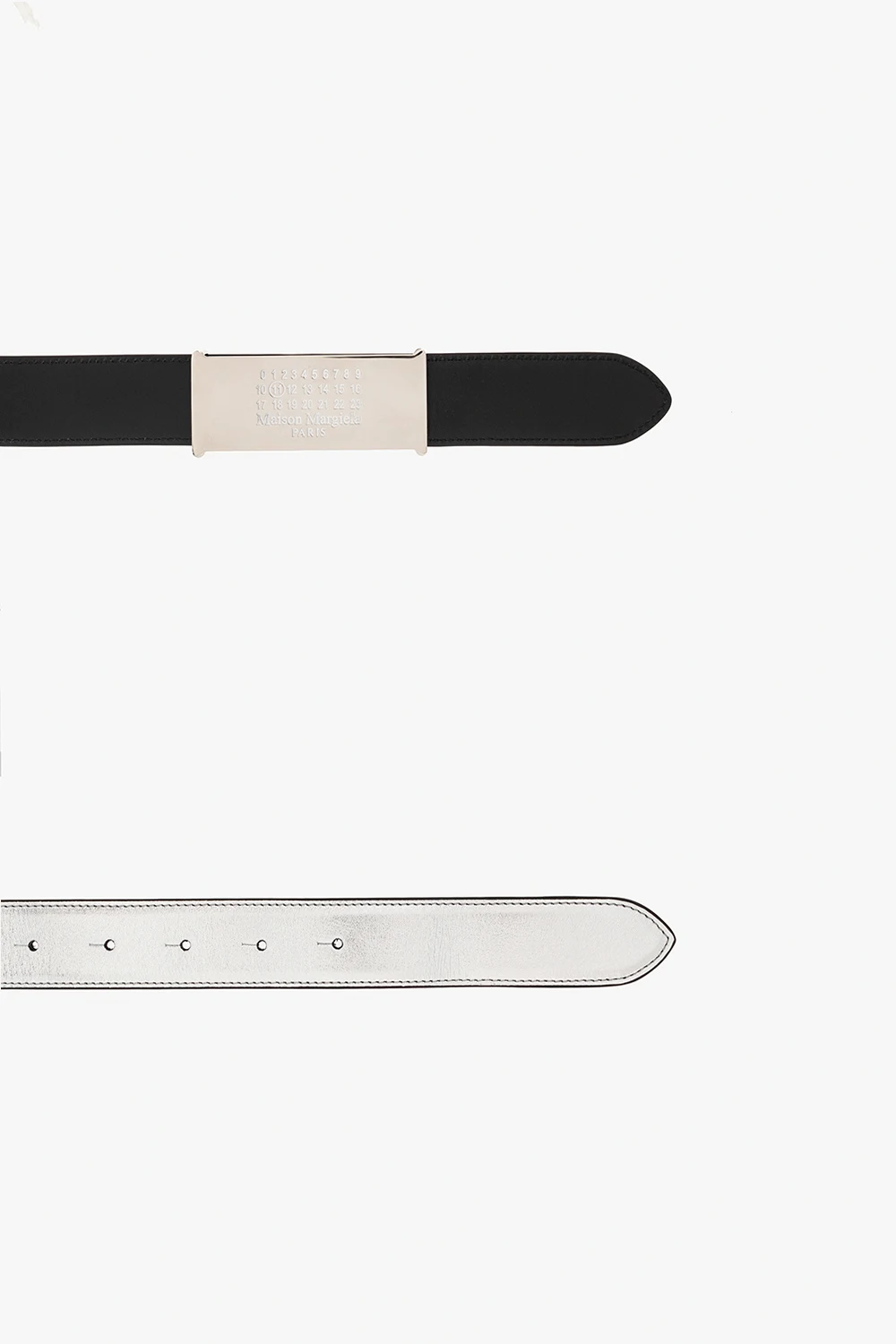 Silver-tone and black reversible belt from Maison Margiela. Crafted from calf leather, this item fastens with a silver-tone brass buckle with an engraved logo in white.