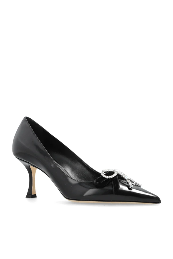The lustrous black finish is stunning in its simplicity, adorned with a dazzling crystal-embellished bow at the front, adding a whisper of opulence. A signature designer logo graces the comfortable inner lining, underscoring the shoe's exclusive pedigree. A contrasting light-hued sole provides a subtle, distinctive touch, enhancing their unique charm.
