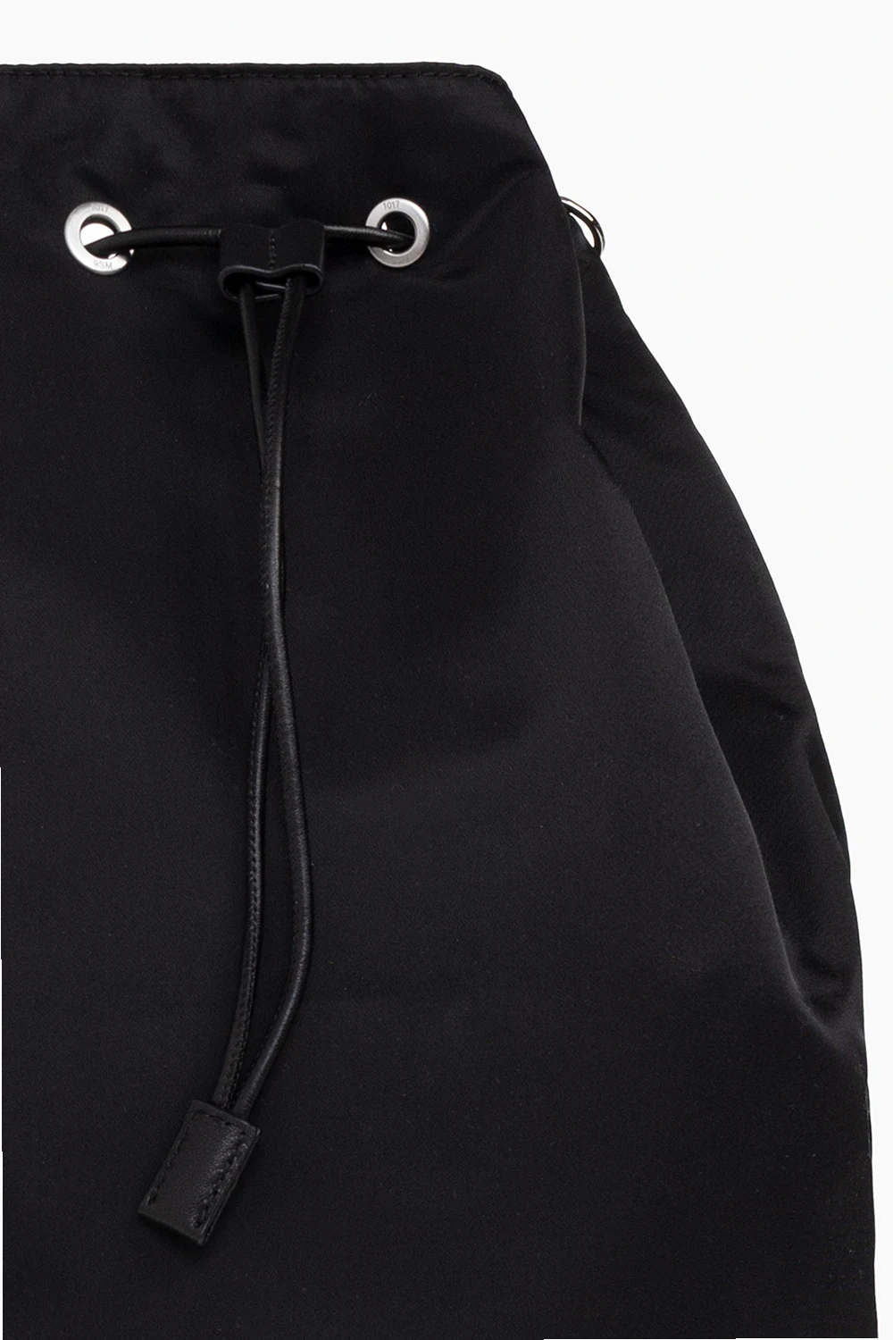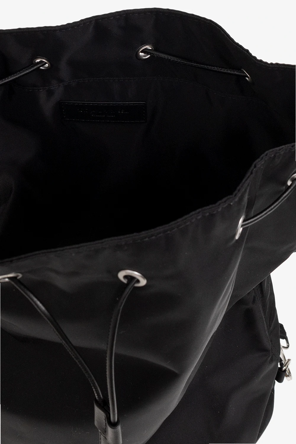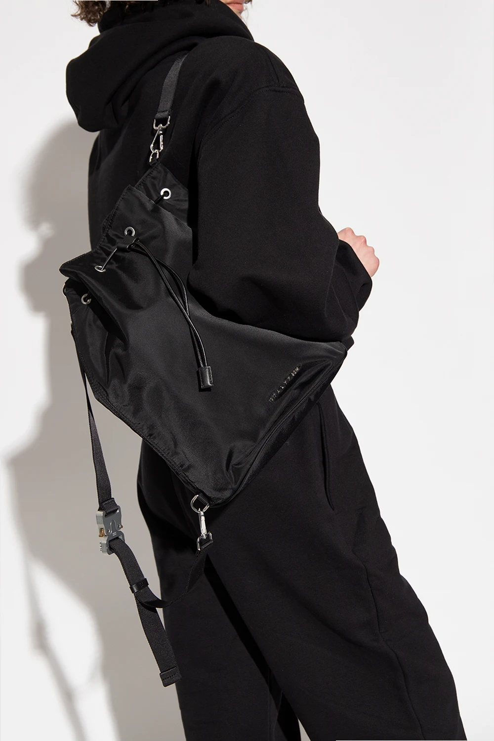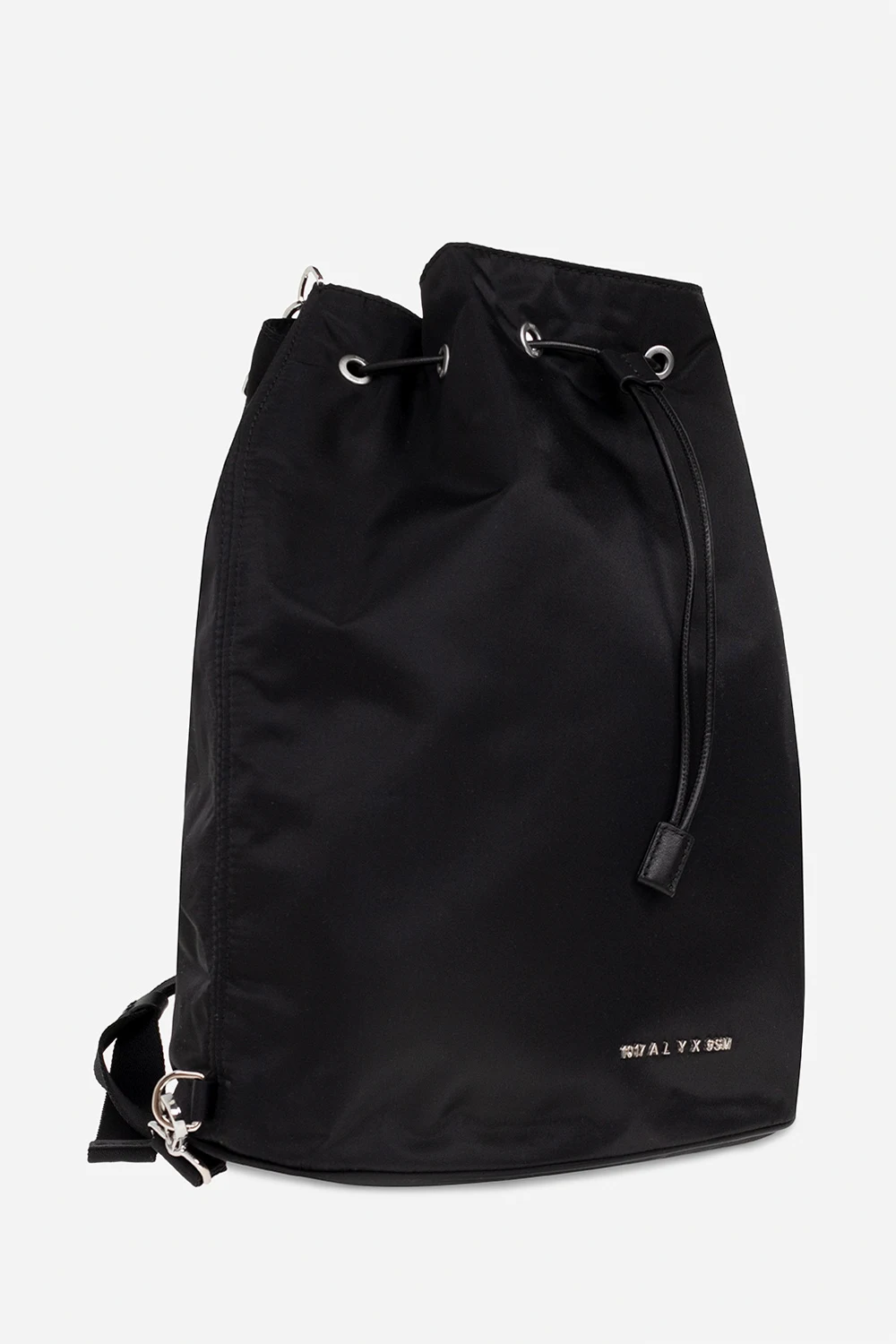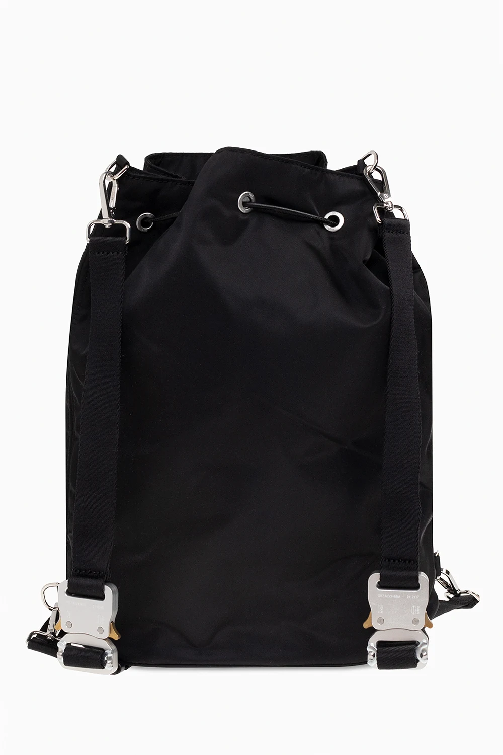 Black backpack from 1017 ALYX 9SM. Fastened with drawstrings, this model features a metal logo detail, detachable and adjustable shoulder straps with a buckle, one internal compartment and metal buckle in silver-tone and gold-tone.