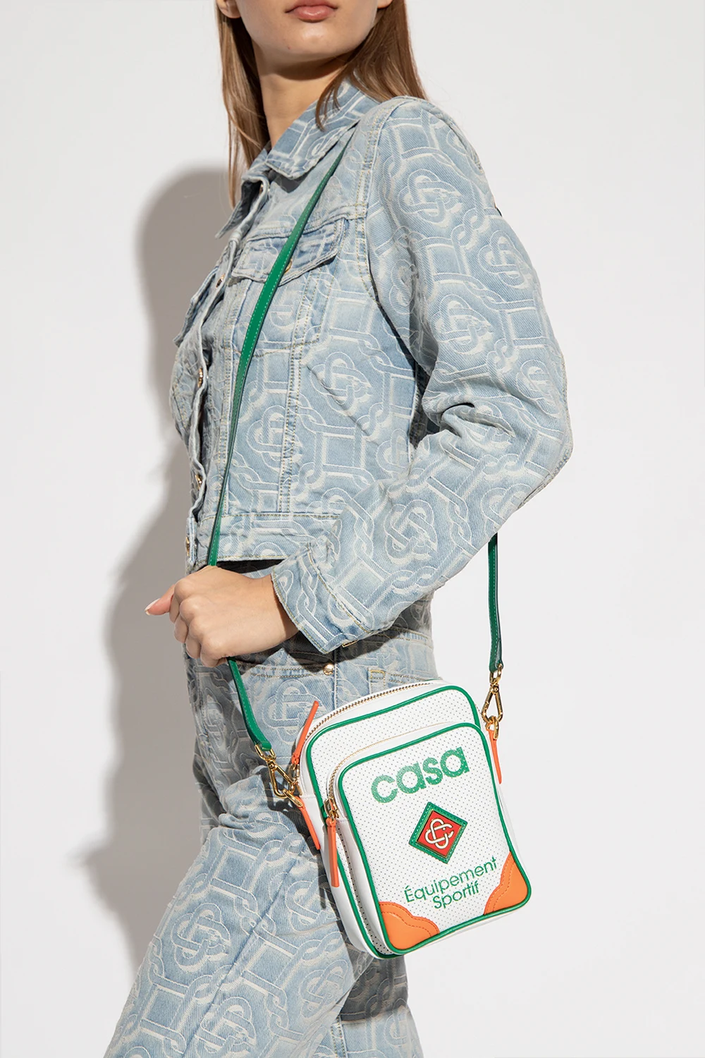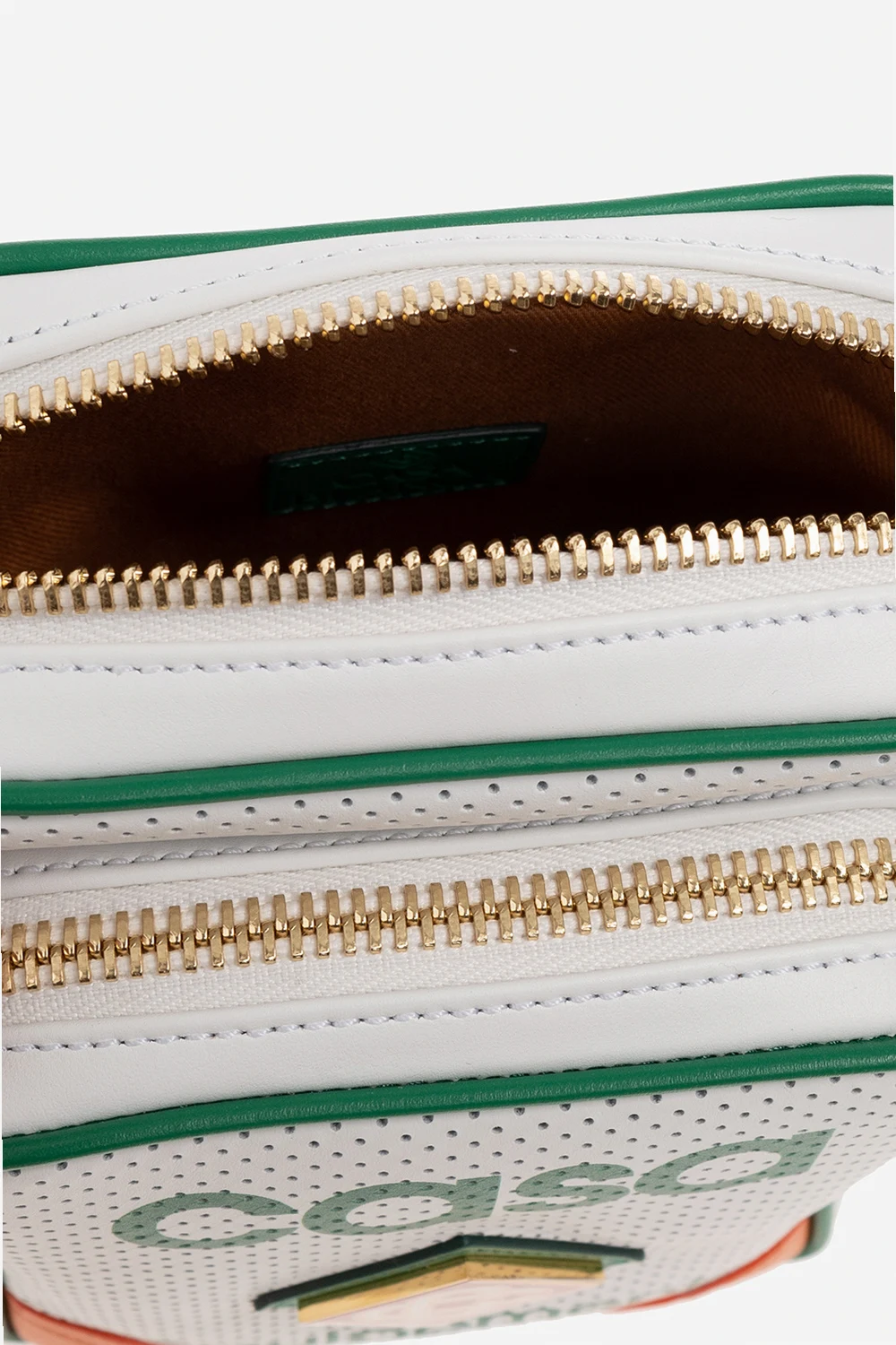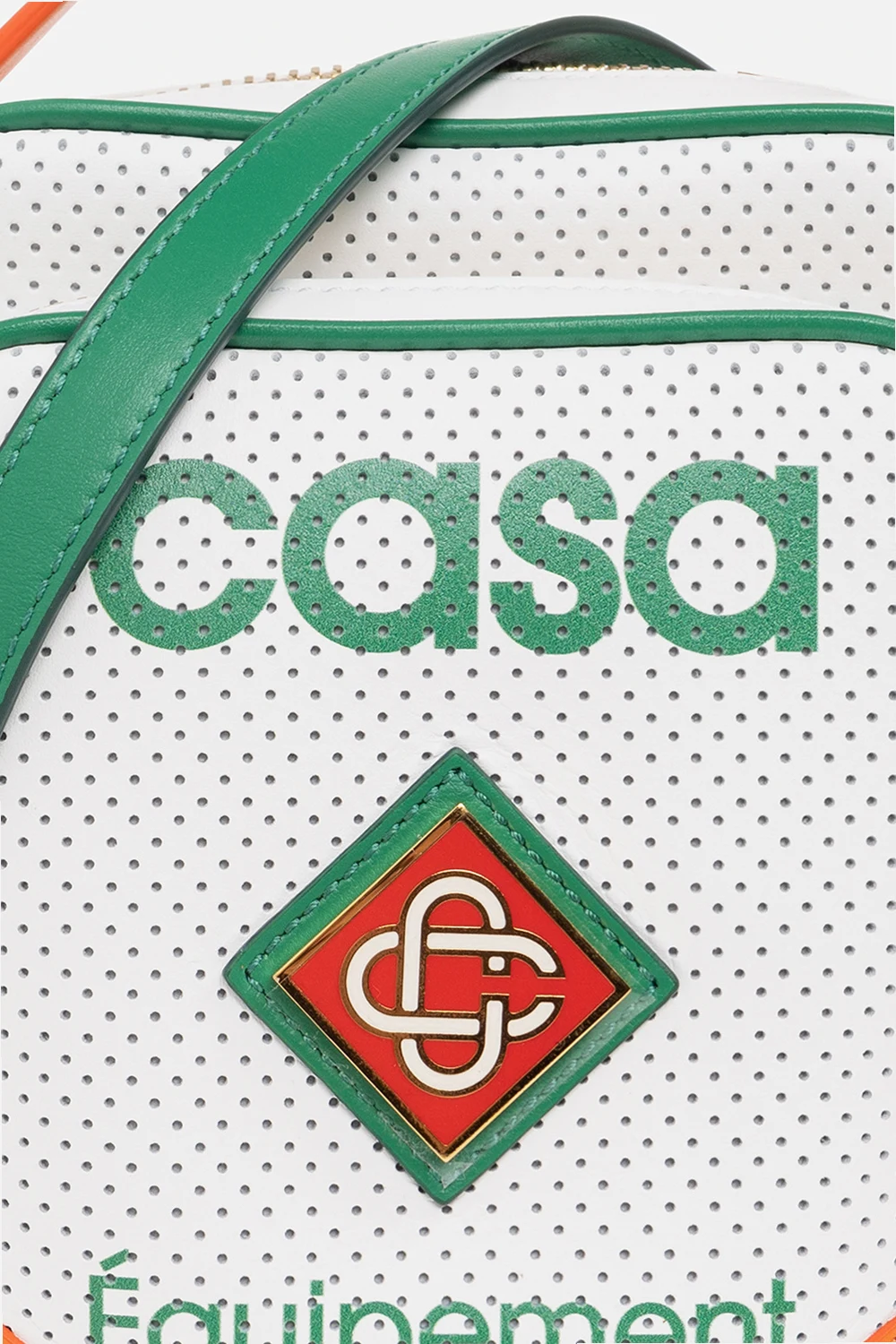 White, orange and green perforated shoulder bag from Casablanca. Made of leather, this model features one internal compartment, front zip pocket, logo print, red monogram appliqué, detachable and adjustable shoulder strap and gold-tone metal hardware.