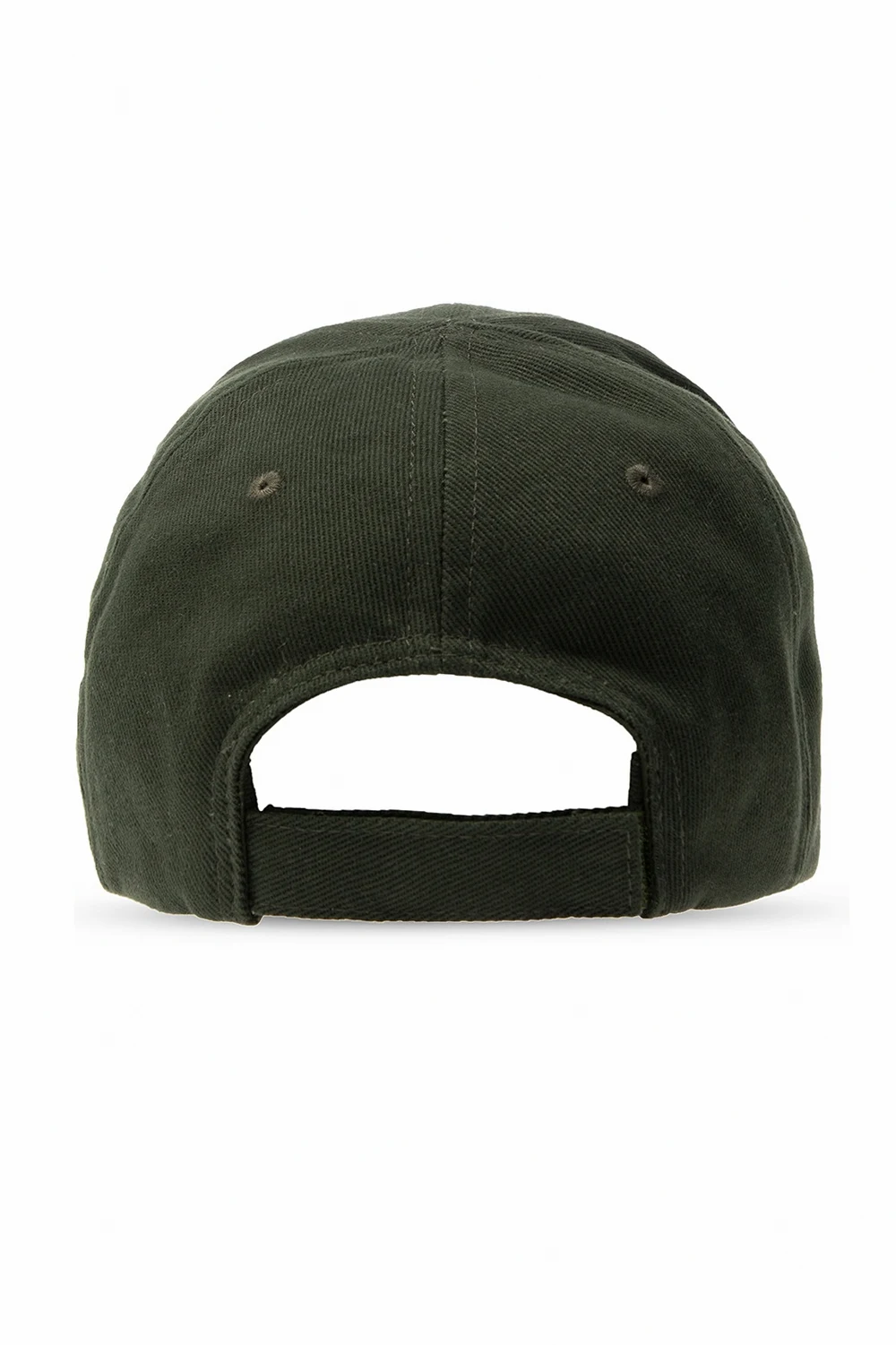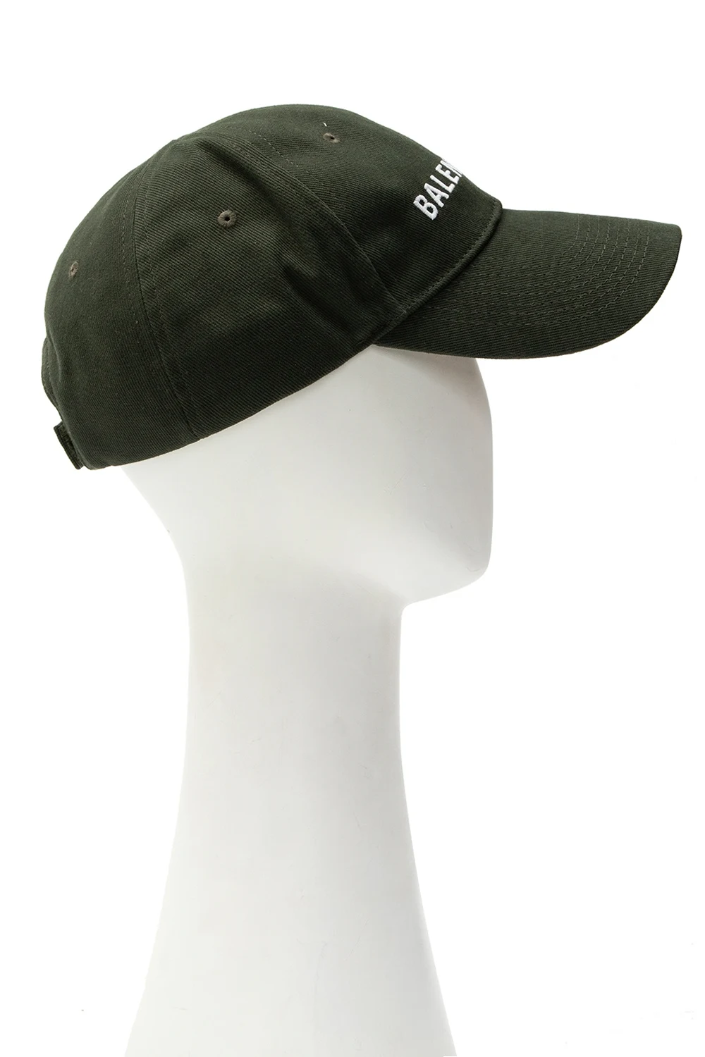 Black baseball cap from Balenciaga. Crafted from cotton, this accessory is decorated with a white logo embroidery and employs a velcro fastener at the back.