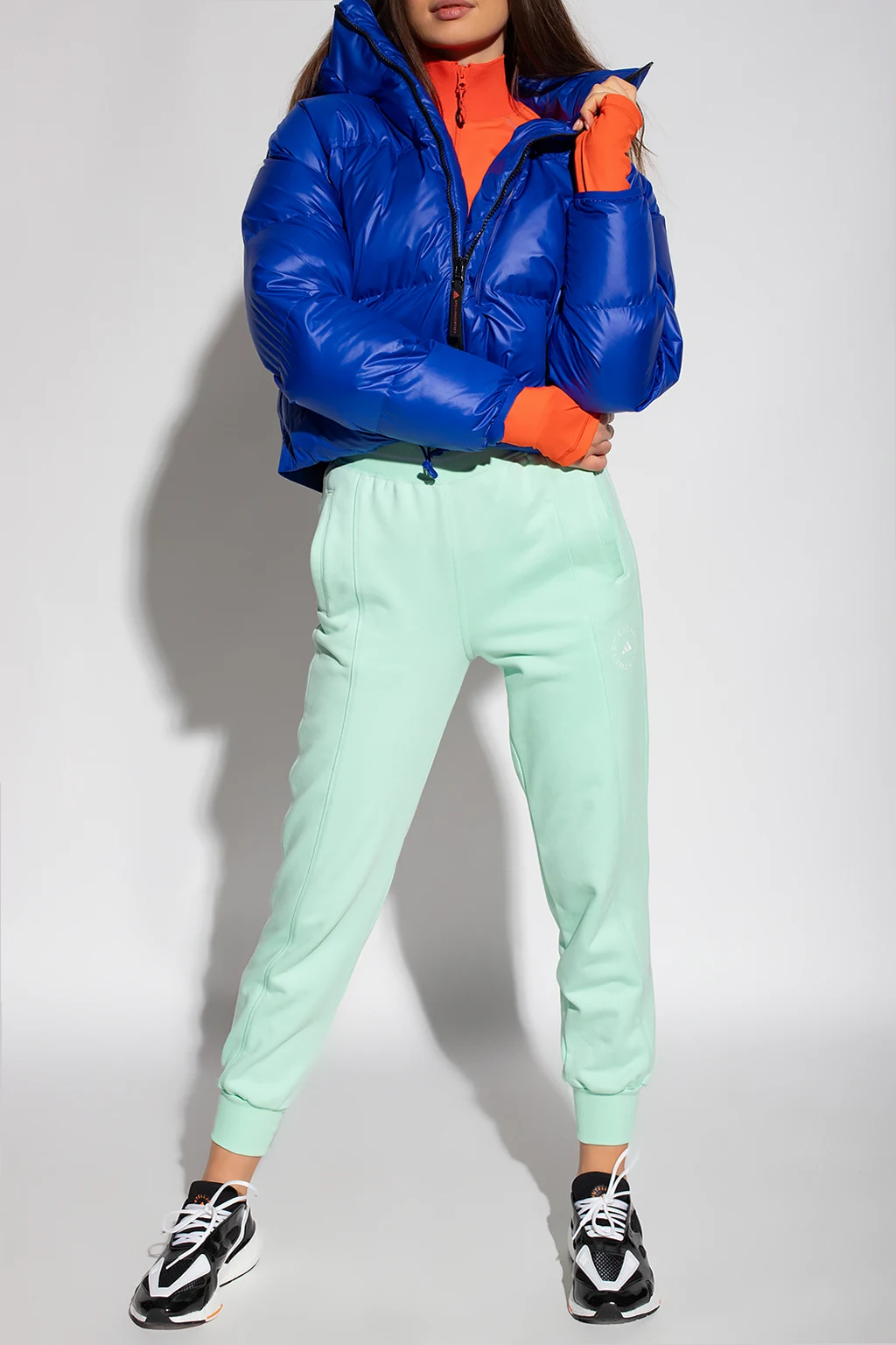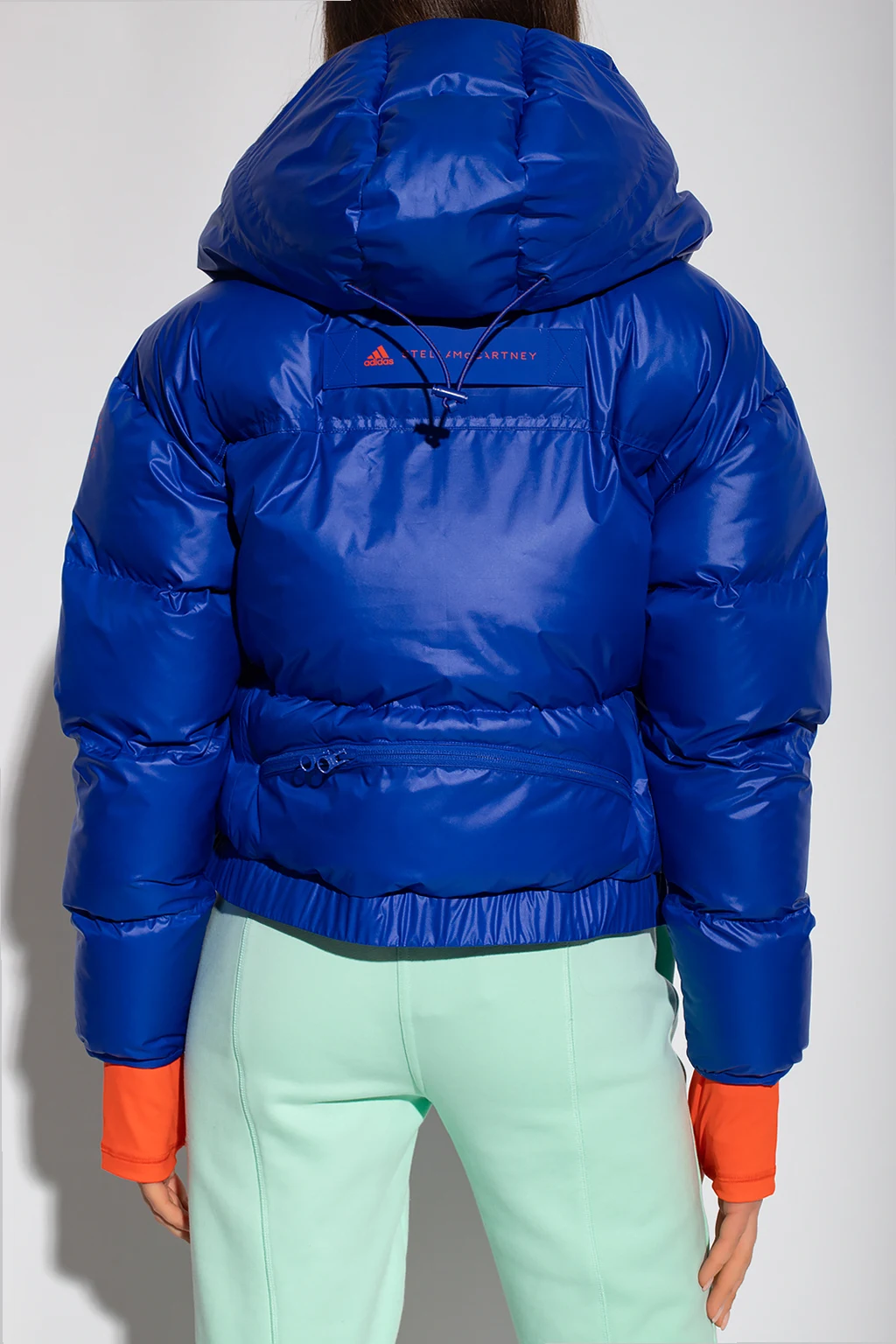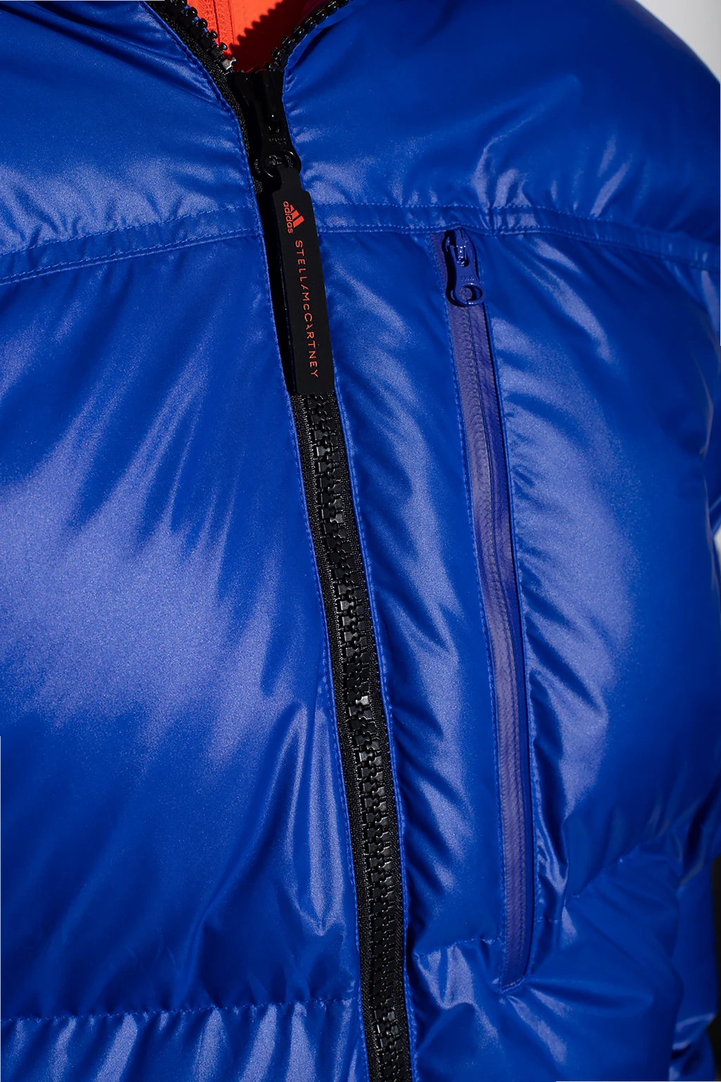 Dark blue insulated jacket from ADIDAS by Stella McCartney, the ‘End Plastic Waste line. Made of Primegreen, a series of high-efficient recycled materials fabric, this style features quilted detailing, a two-way zip fastening, an orange logo application at the back, four zip pockets, a detachable drawstring hood, an elasticated bottom hem and cuffs and adjustable internal suspenders with embroidered repeated logos.