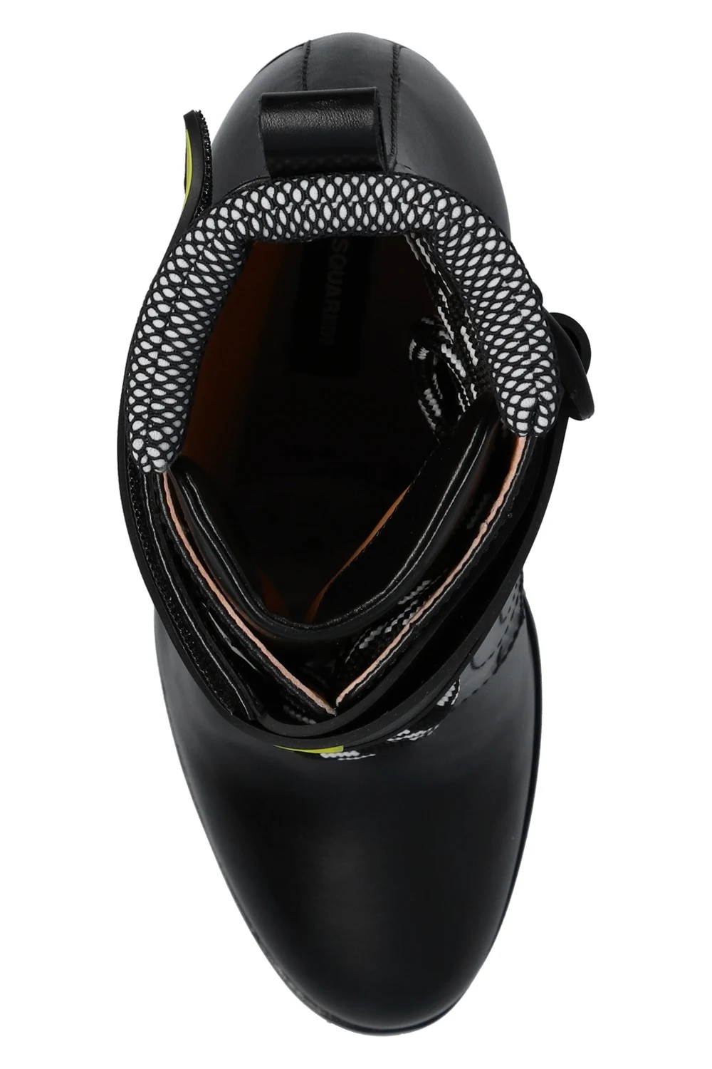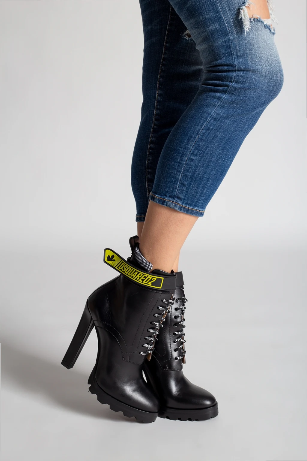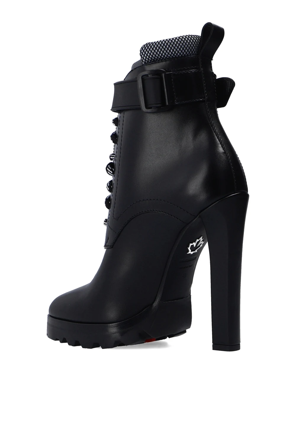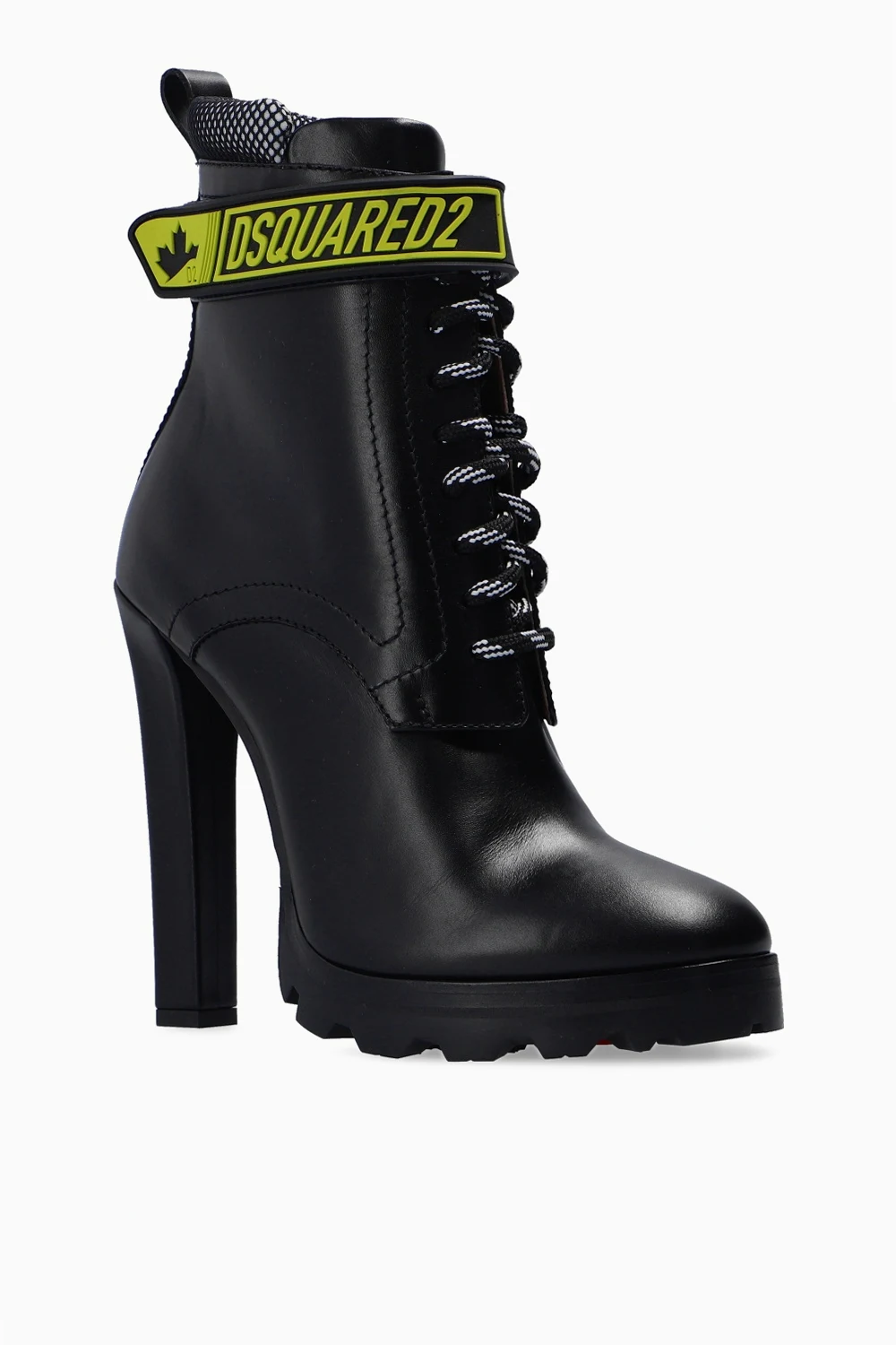 Black heeled ankle boots from Dsquared2. Crafted from leather, this lace-up pair sits on a black and red rubber sole and features a velcro fastener with an embossed green logo.