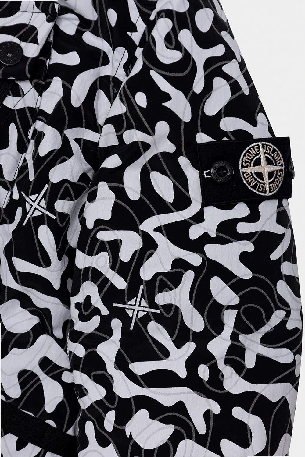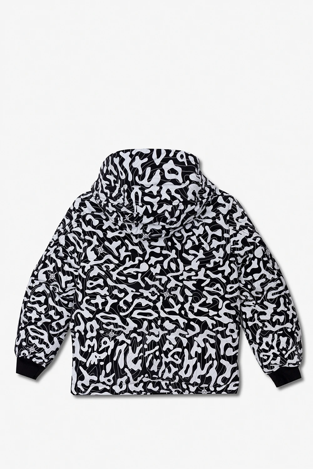 Black and white down jacket with a hood from Stone Island Kids. Emblazoned with a reflective pattern, this style secures with a zipper and snaps and features a removable logo patch on the sleeve, one snap-fastened flapped pocket, two zip pockets and long sleeves with elasticated cuffs.