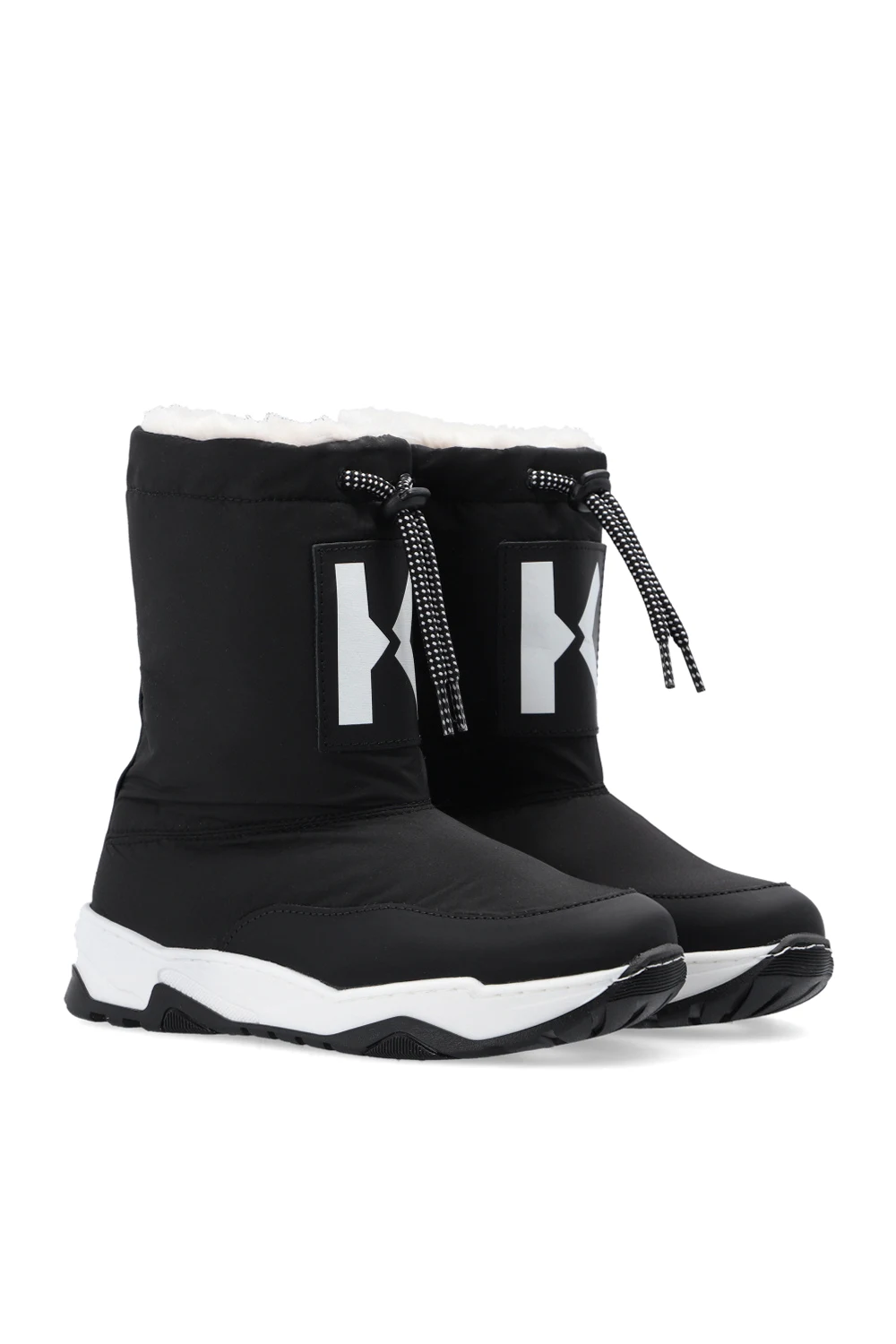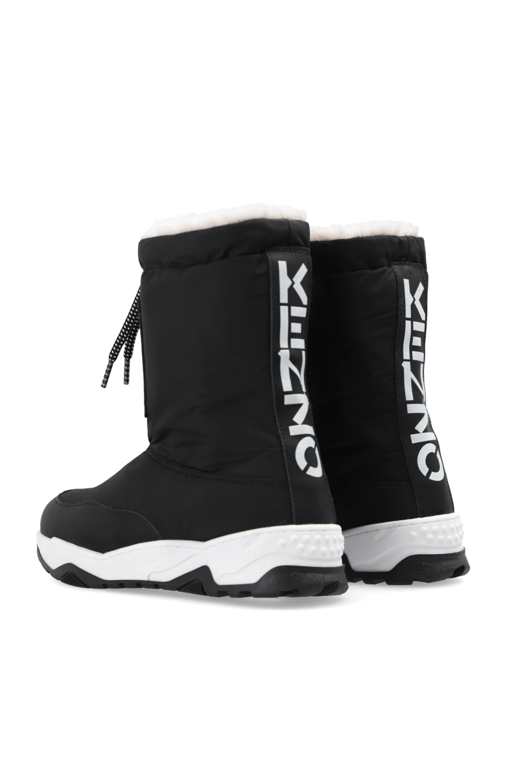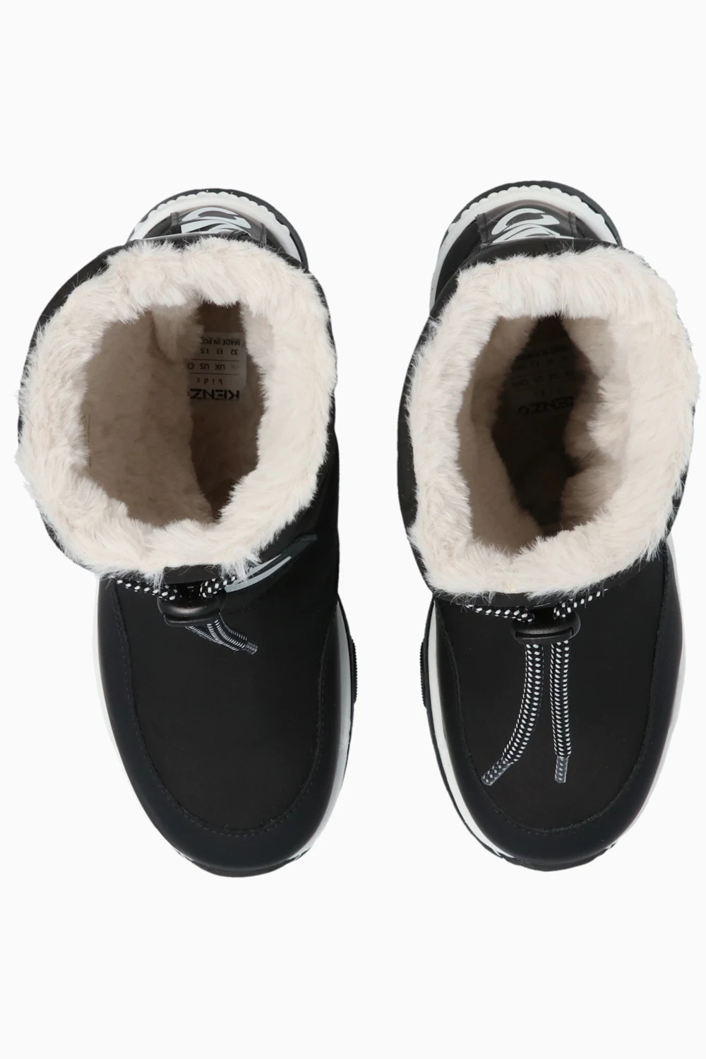 Black snow boots from Kenzo Kids. Fastened with drawstrings, this pair features a white logo print, faux fur lining and rubber sole in black and white.