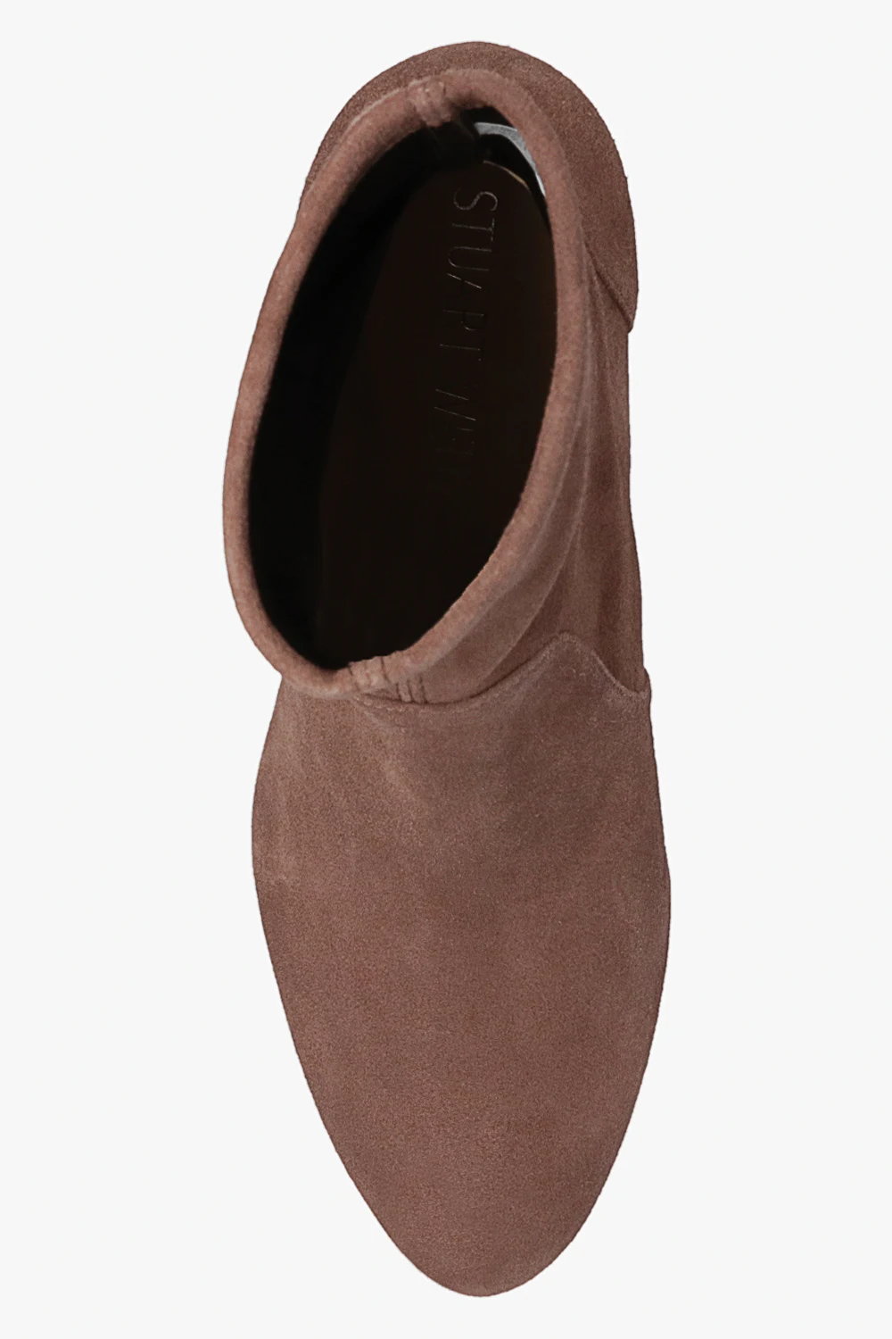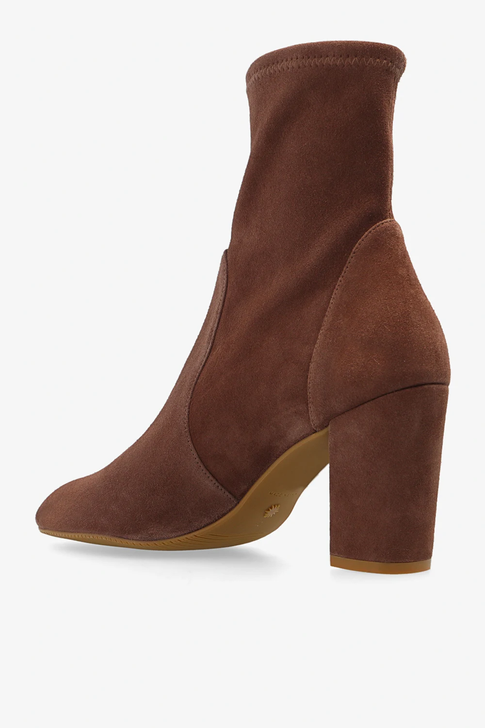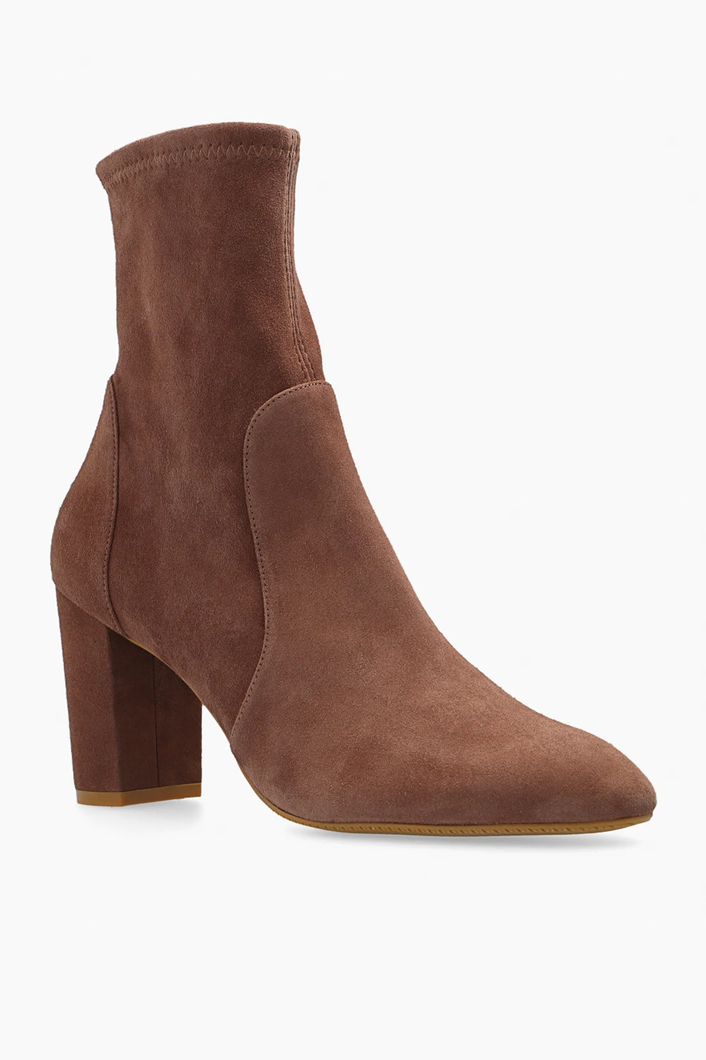Brown ‘Yuliana’ heeled ankle boots from Stuart Weitzman. Made from the designer's signature stretchy suede with a slip-on silhouette, this model features a round toe and a beige rubber sole.