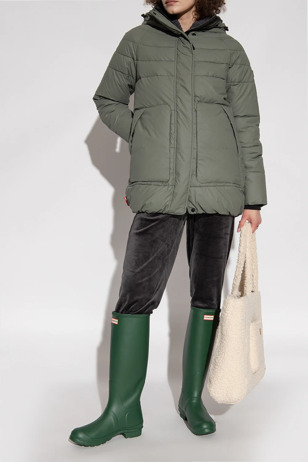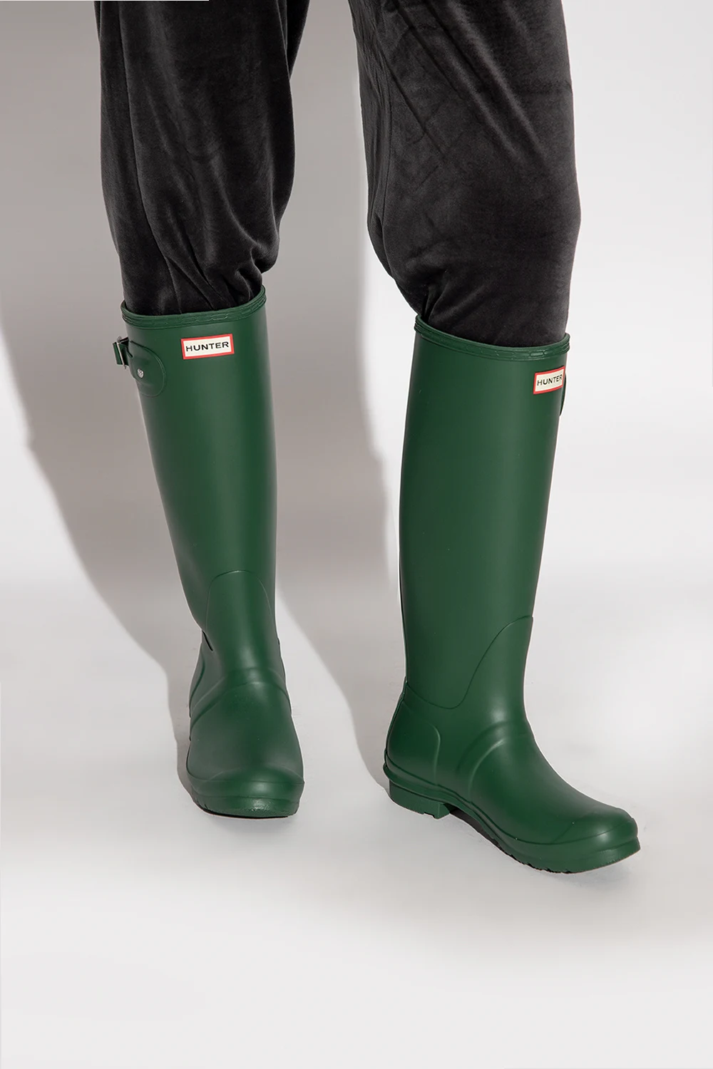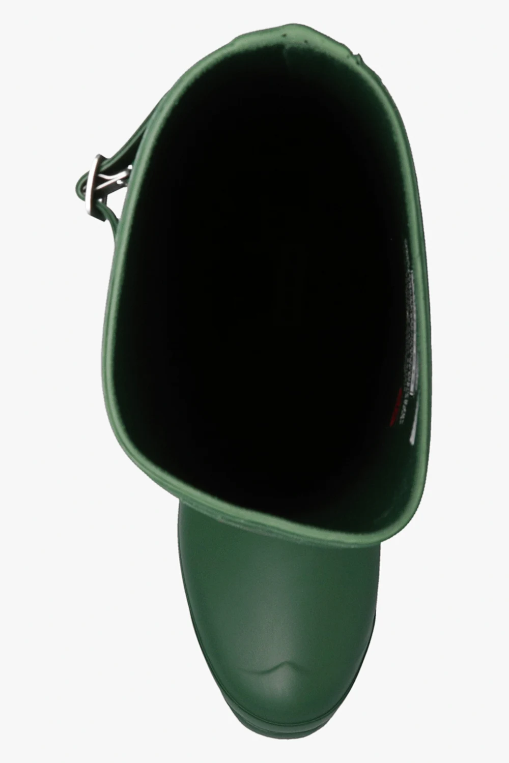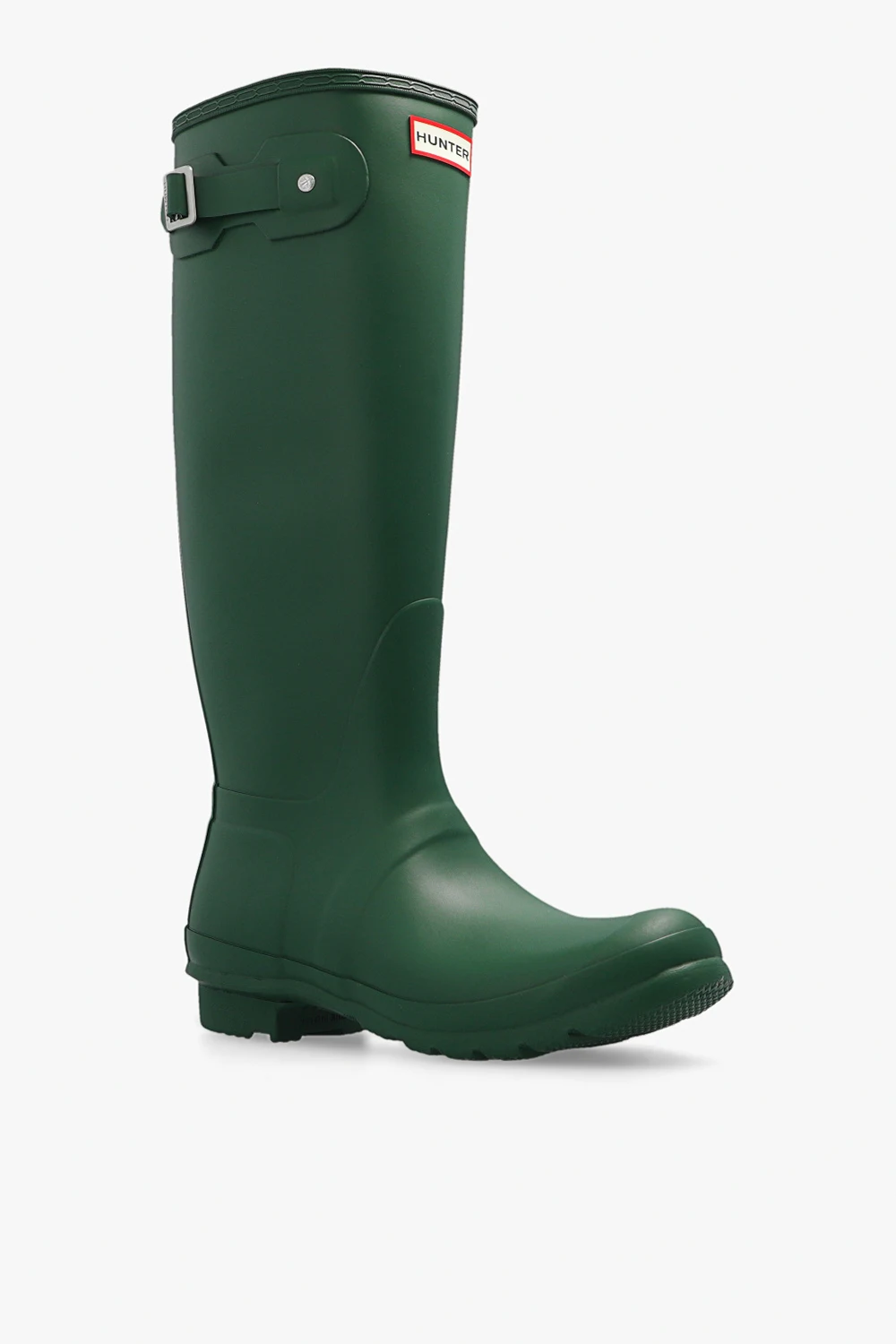 Dark green ‘Original Tall’ rain boots from Hunter. Handcrafted from 28 parts made of vulcanised rubber with matte finish, this pair features a logo appliqué, adjustable buckle strap to the side and rubber sole with Hunter Original tread pattern.