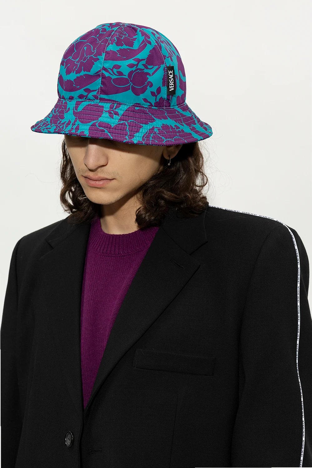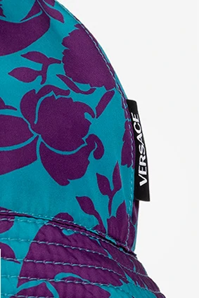 Blue and purple bucket hat from Versace. Embellished with the brand's ‘Barocco Silhouette’ pattern, this item features a logo patch and a silk lining.