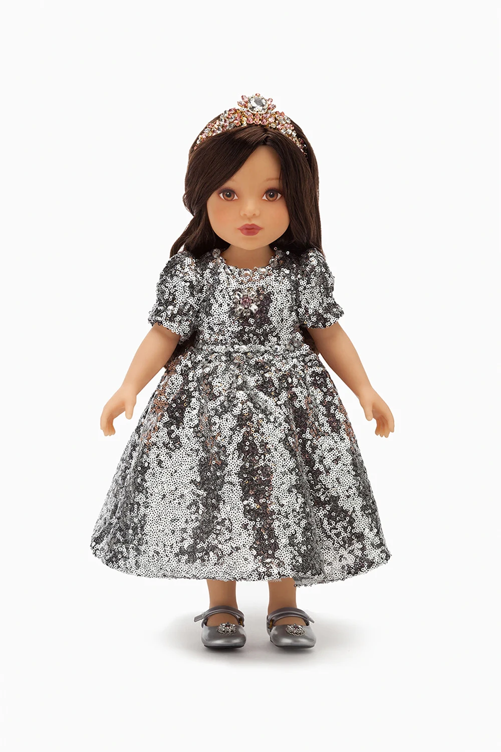 Doll from the ‘Dolls Special Project’ collection by Dolce & Gabbana. Arriving with dedicated colourful packaging, this item is 49cm tall and is made from a special soft-to-the-touch material. Its facial features were designed by a specialized team using the colour palette selected by Dolce&Gabbana’s make-up artists. Long dark brown hair are made from a special fibre that makes it silky and shiny. It is wearing a silver-tone sequinned maxi dress, two pieces of white satin underwear, an embellished hairband and ballet flats with an applique.
