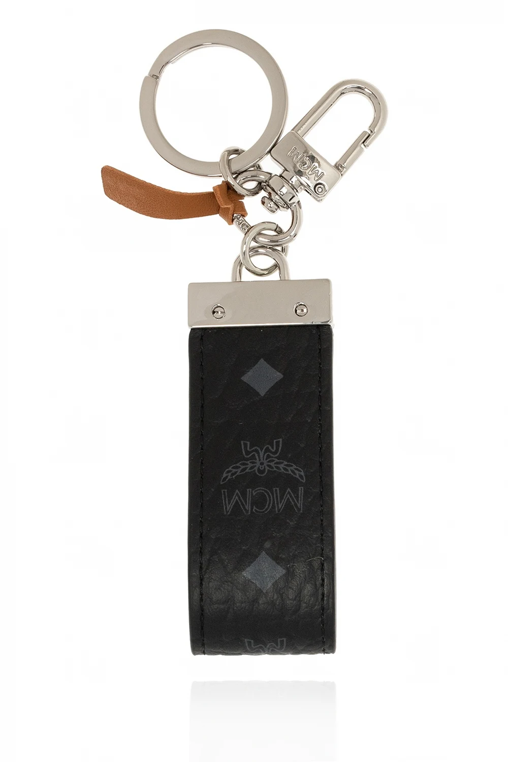 Black keyring from MCM. Crafted from canvas, this accessory features a grey logo print, silver-tone metal hardware and comes with a ring and carabiner.