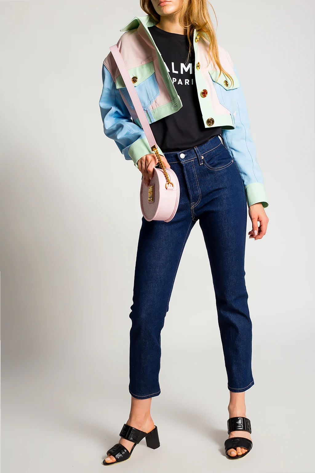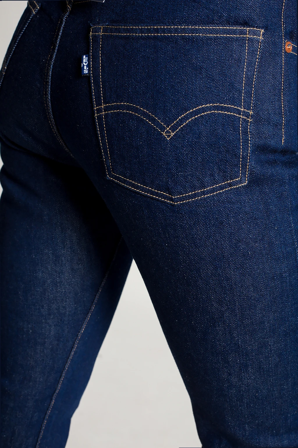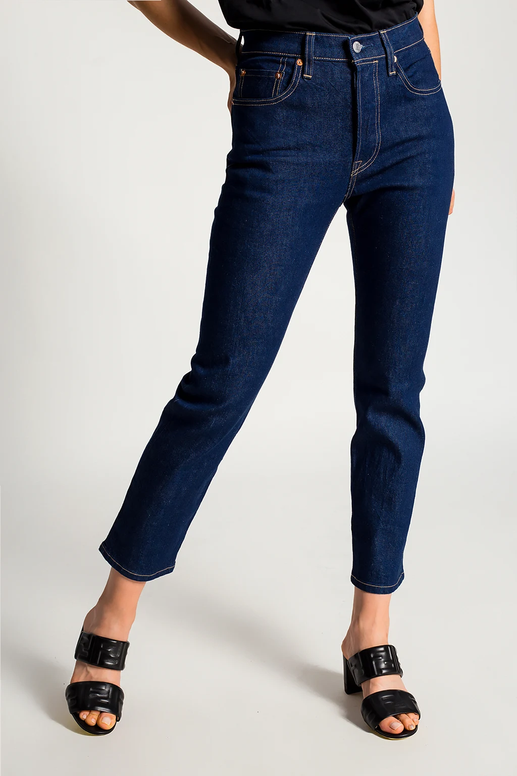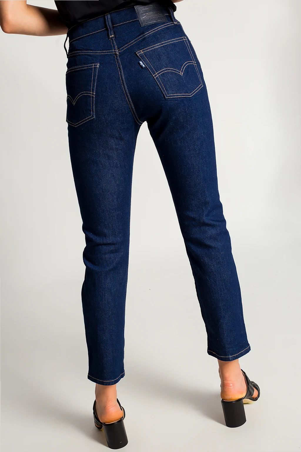 Navy ‘501 Crop’ jeans from Levi’s, the ‘Made & Crafted ®’ collection. Fastened with buttons, this pair falls down with cropped tapered legs and features yellow stitching details, a black logo patch, three front pockets and two back pockets.