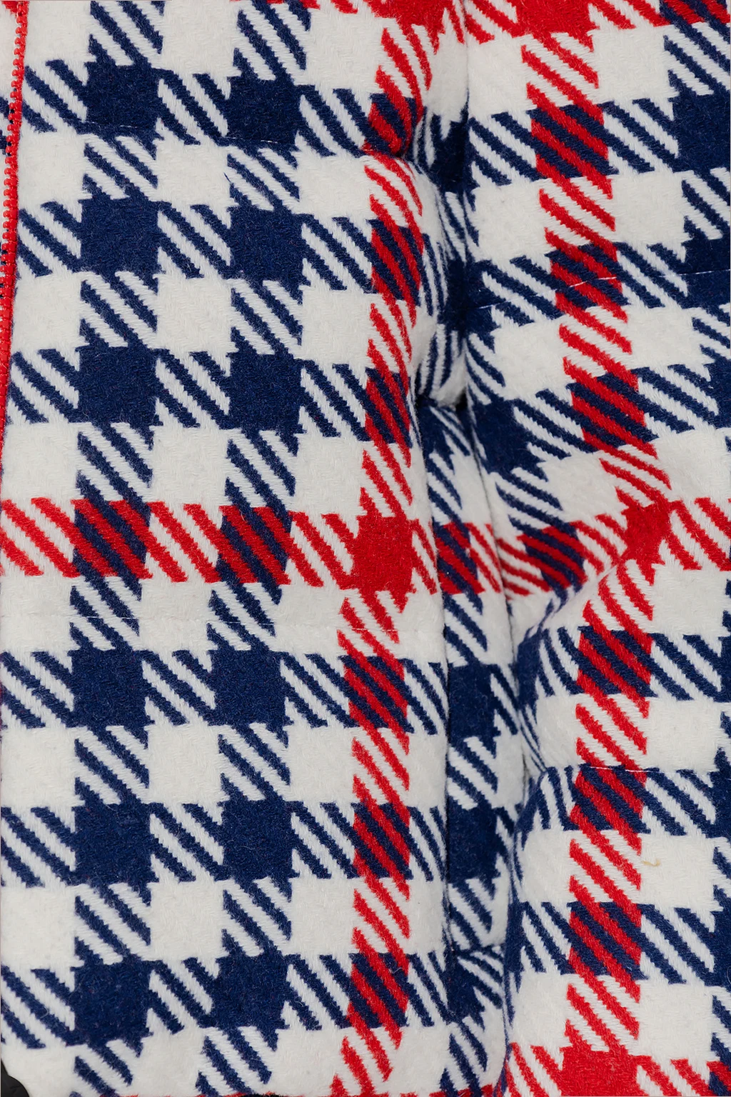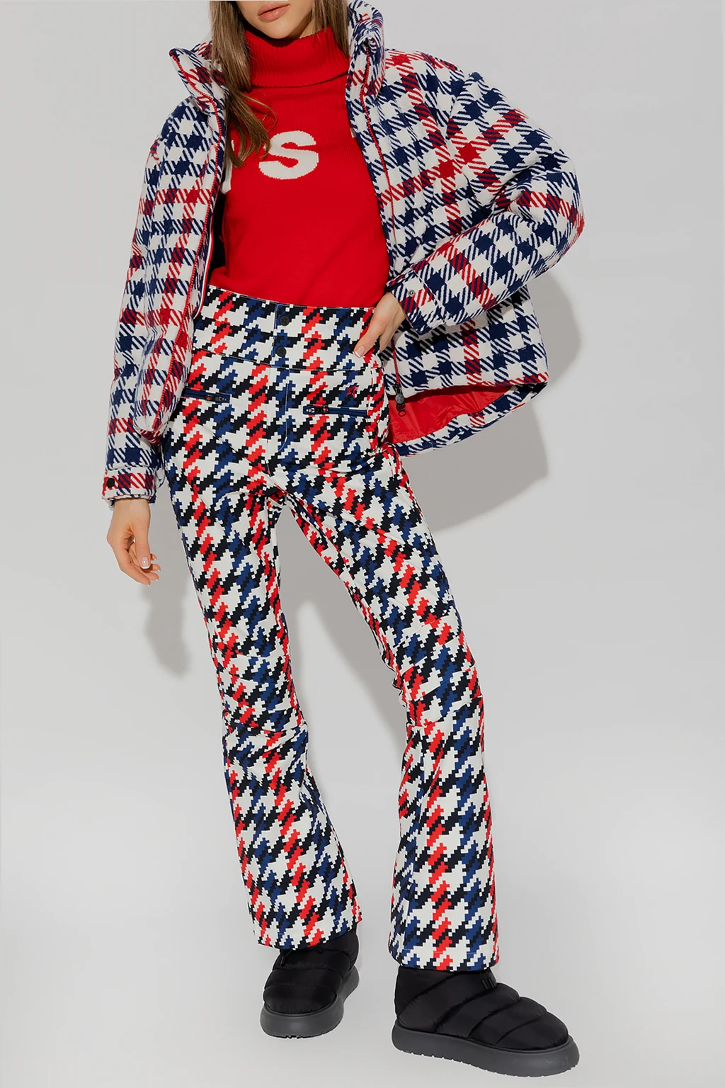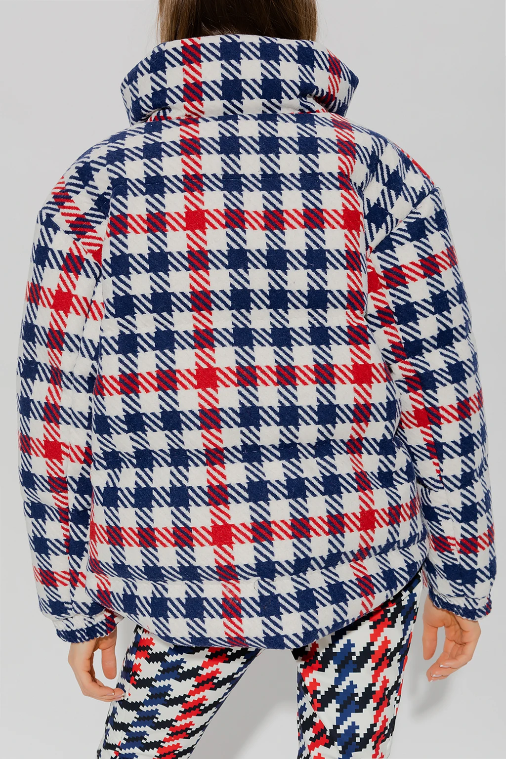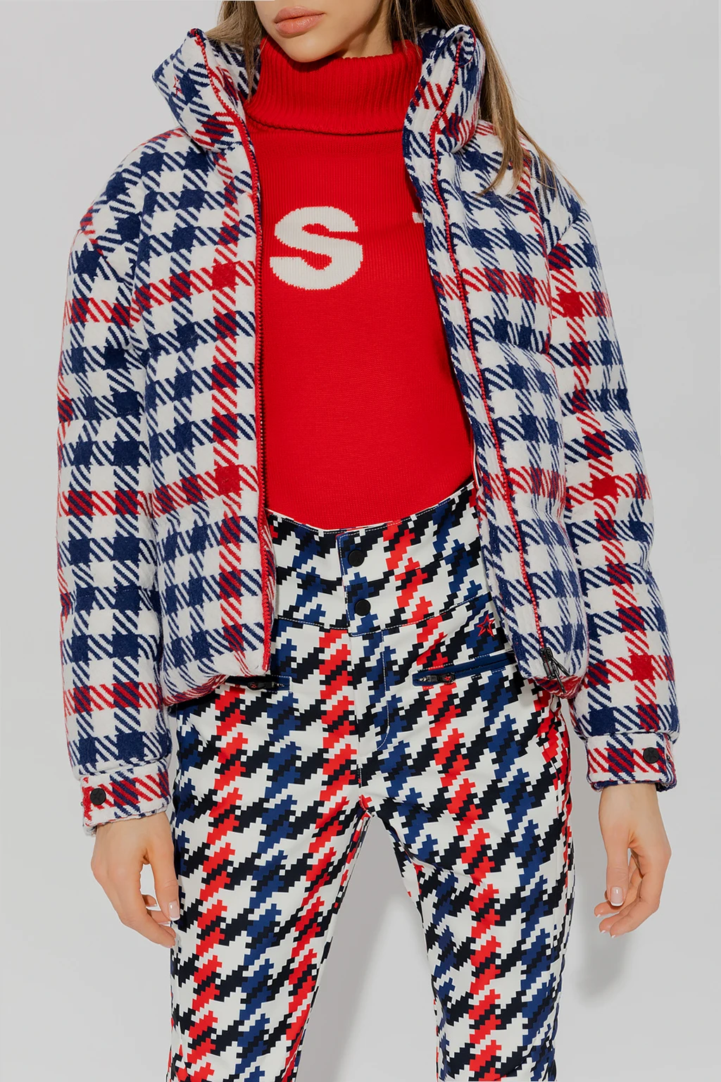 White, red and navy ‘Star Gingham’ down ski jacket from Perfect Moment. Padded with down from sustainable sources, this garment features a two-way zip, check pattern, two front zip pockets and long sleeves with adjustable snap fastenings.