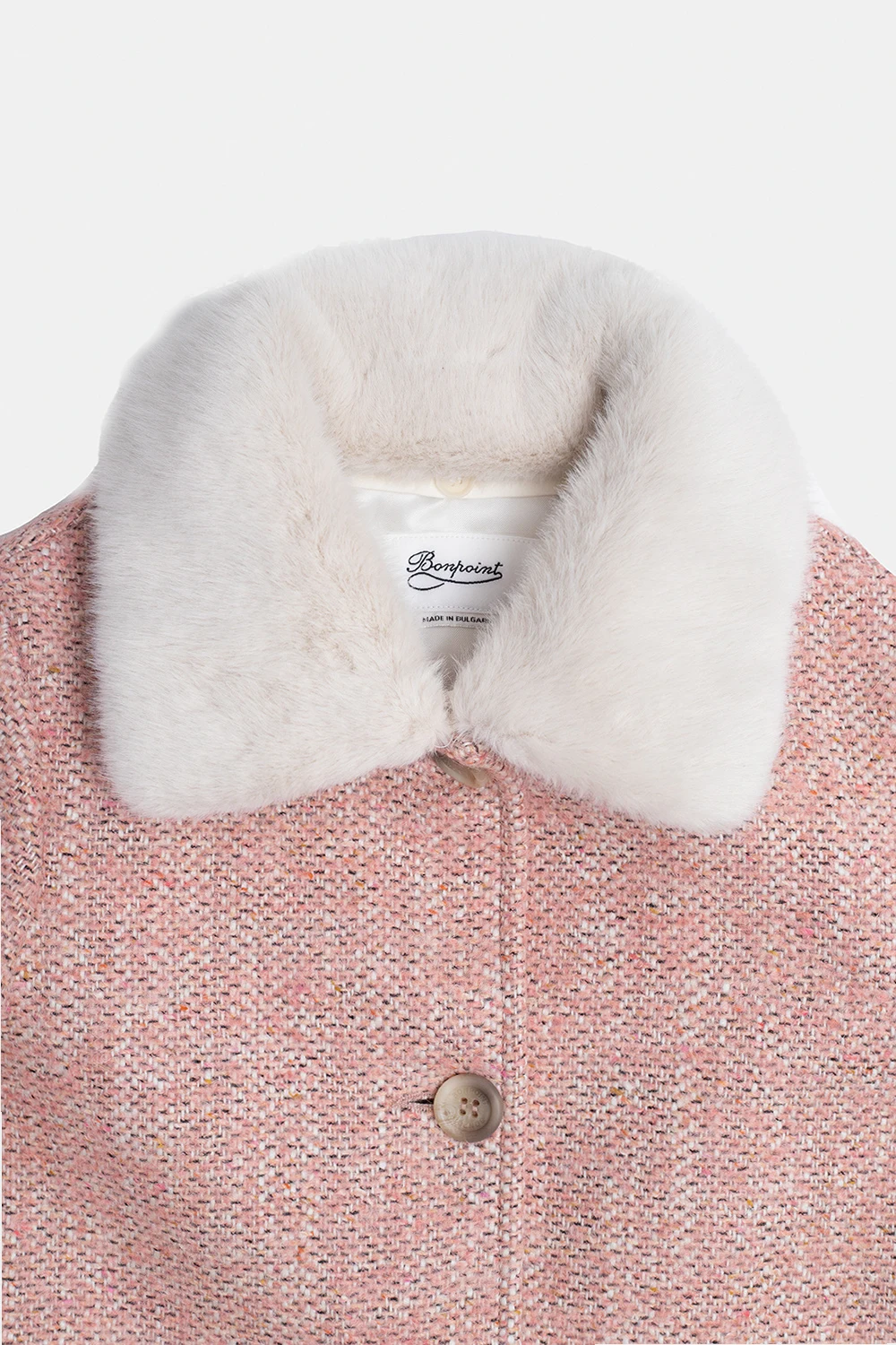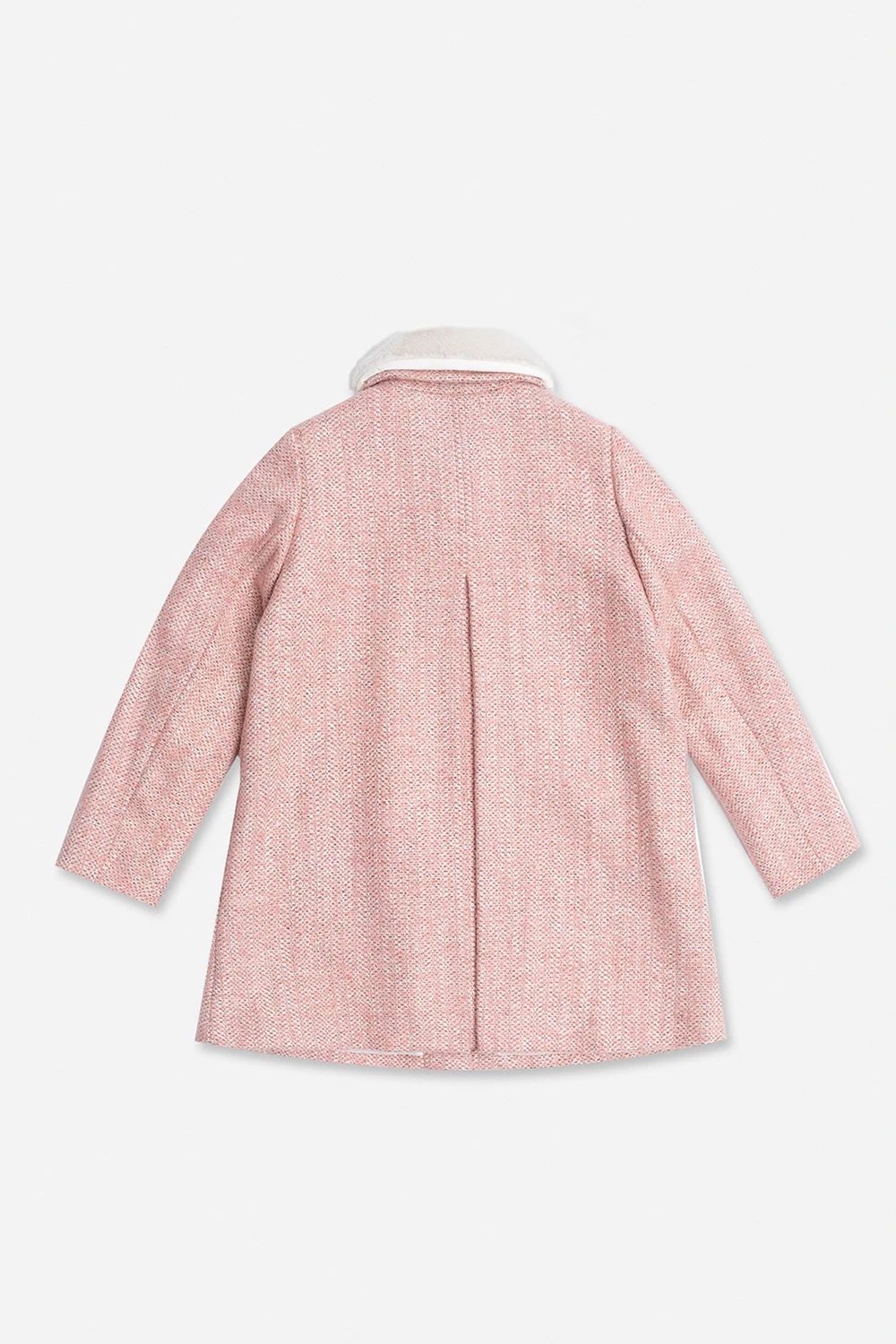 Pink coat from Bonpoint. Crafted from a wool and alpaca blend, this design features a white detachable faux fur collar, two slip pockets, long sleeves and decorative pleat at the back.