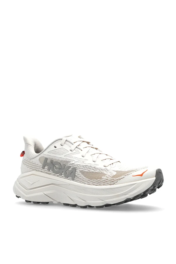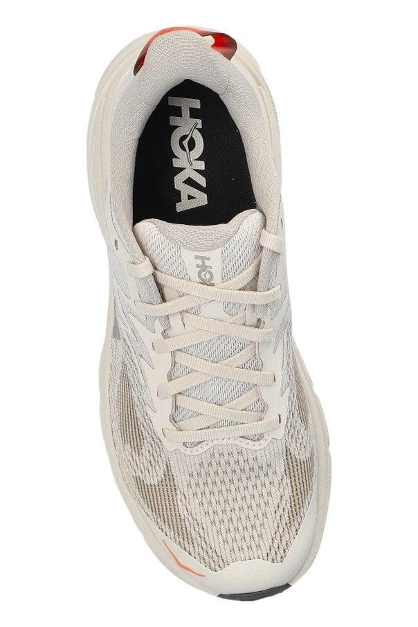 Crafted from lightweight, breathable synthetic mesh, the paneled upper guarantees optimal airflow, complemented by strategic reinforcements at the lacing and heel for enduring durability. Subtle orange accents on the front sole and heel loop lend a modern, understated touch, while the prominent HOKA logo on the sides and insole provide distinguished designer detailing.