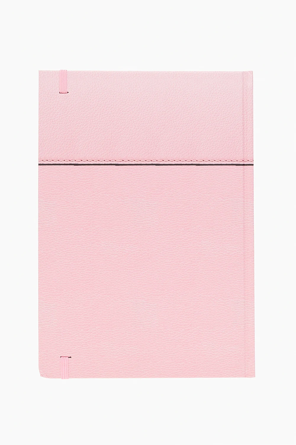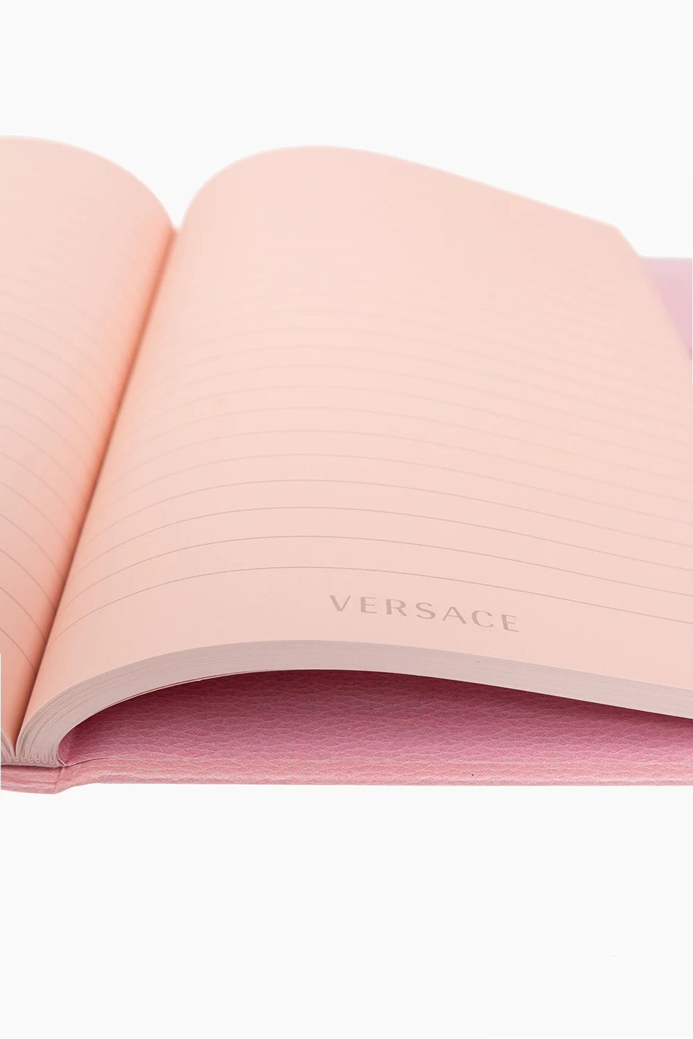 Light pink A5 notebook from Versace Home. Made from stone paper in collaboration with Paper on the Rocks with responsibly designed packaging to help protect forests and nature by saving 20 litres of water for each notebook. It features the brand's signature Medusa printed on the front. The standard A5 format has ruled pages with logo accents, a pink ribbon and an elastic band detail.