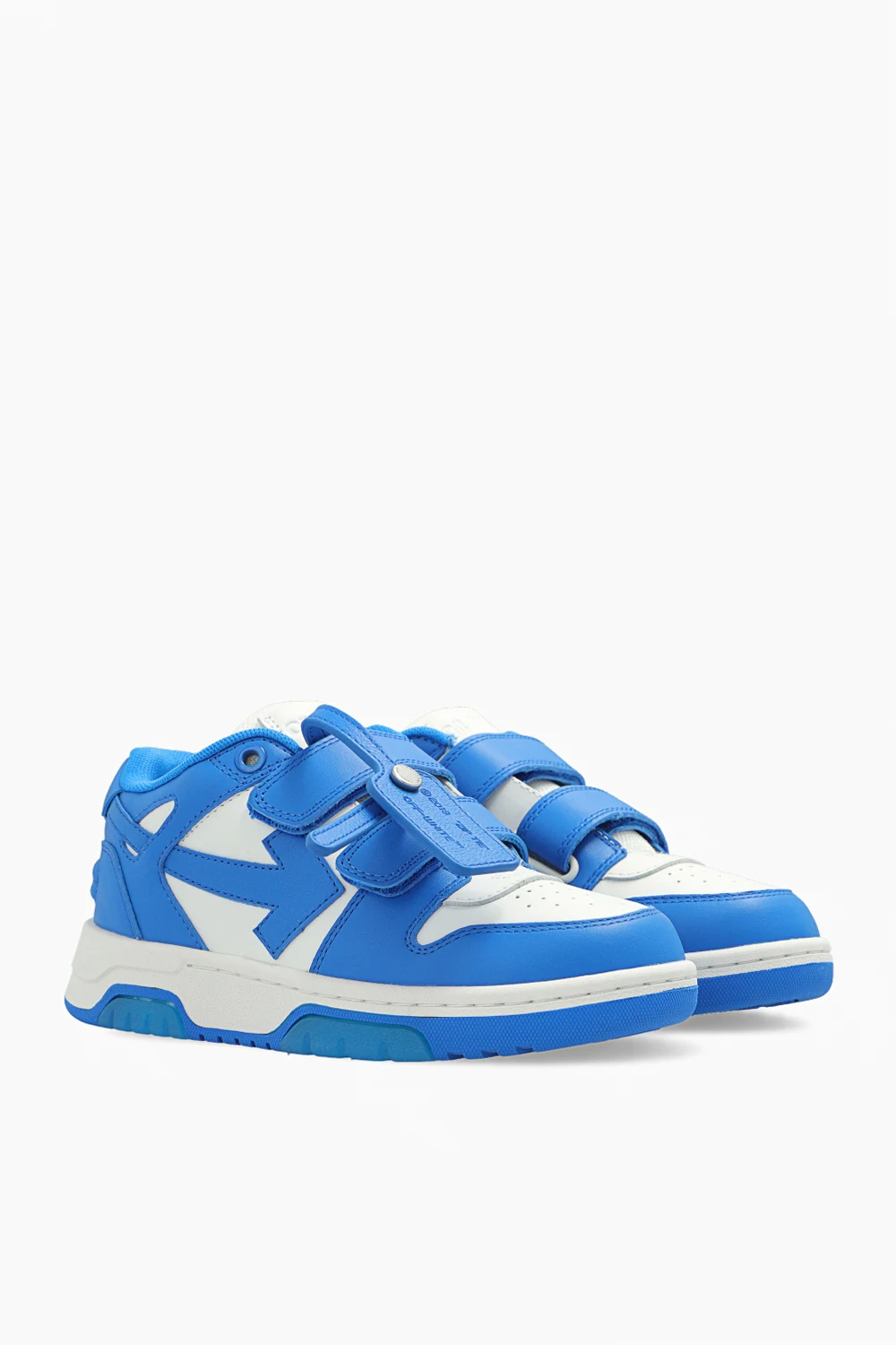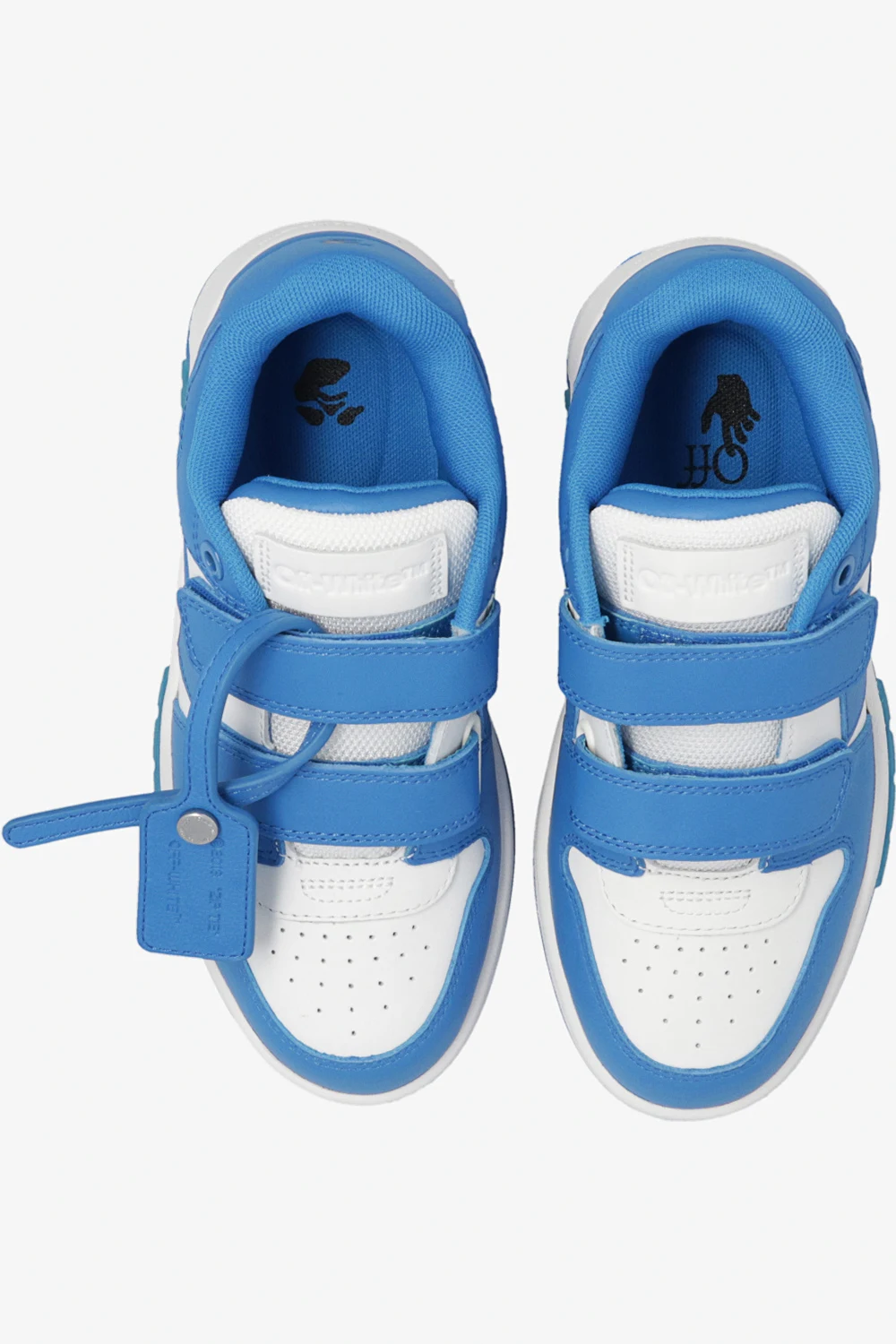 White and blue ‘Out Of Office’ sneakers from Off-White. Crafted from leather and fabric, this lace-up pair features a logo patch, decorative appliqué and blue rubber sole.