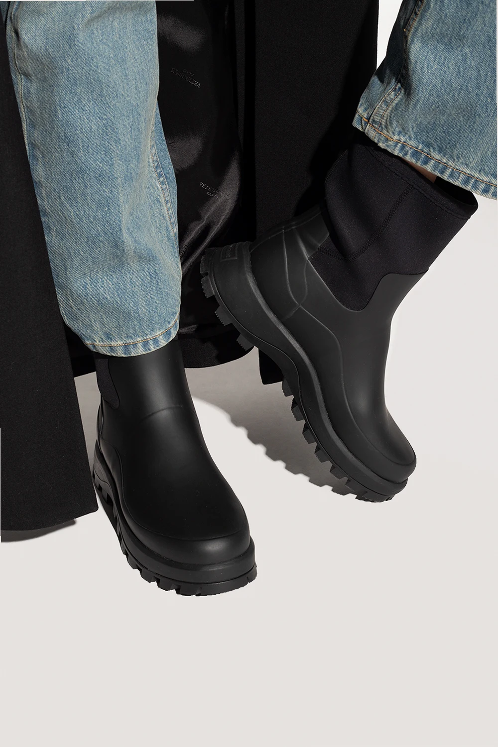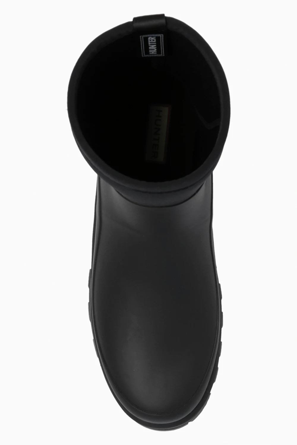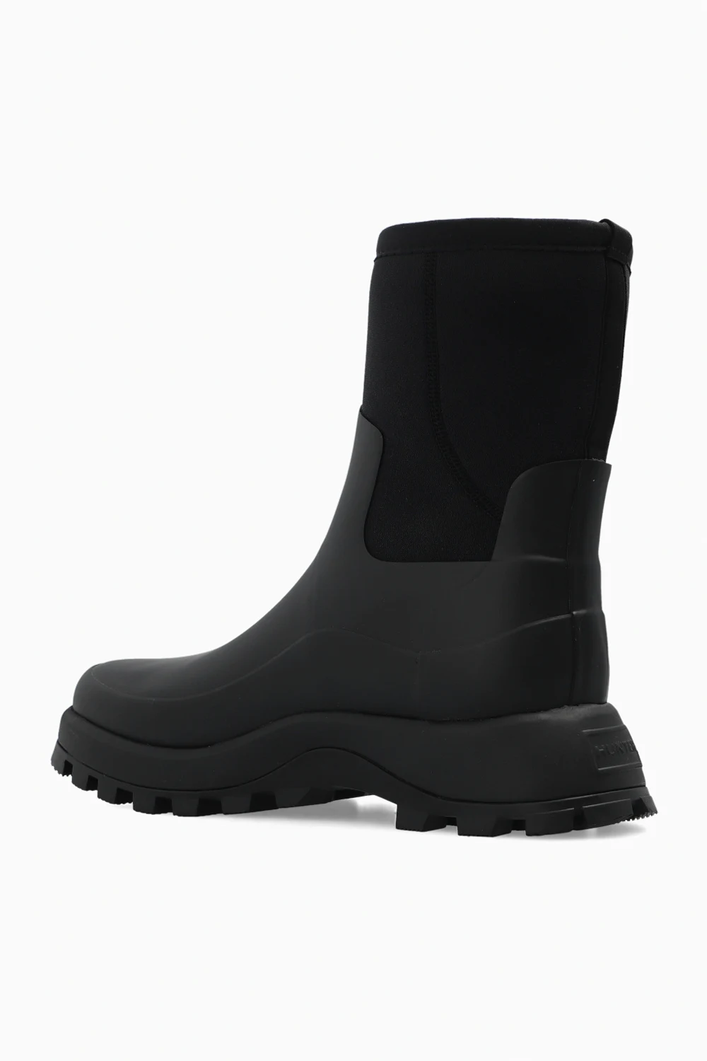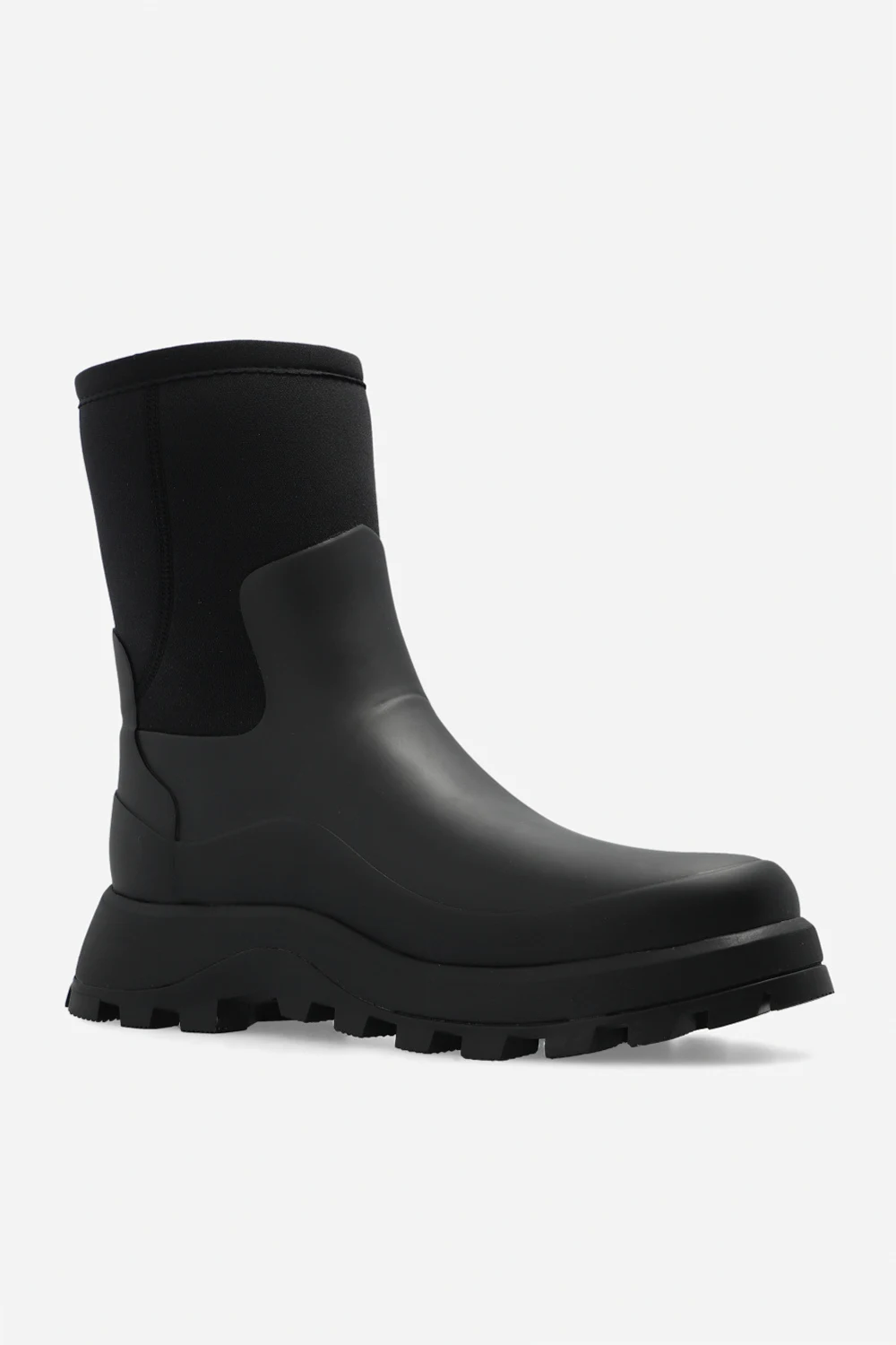 Black ‘City Explorer’ rain boots from Hunter. Crafted from natural rubber and stretchy neoprene, this design features 100% recycled polyester lining and insole, raised logo at the back and black rubber sole.