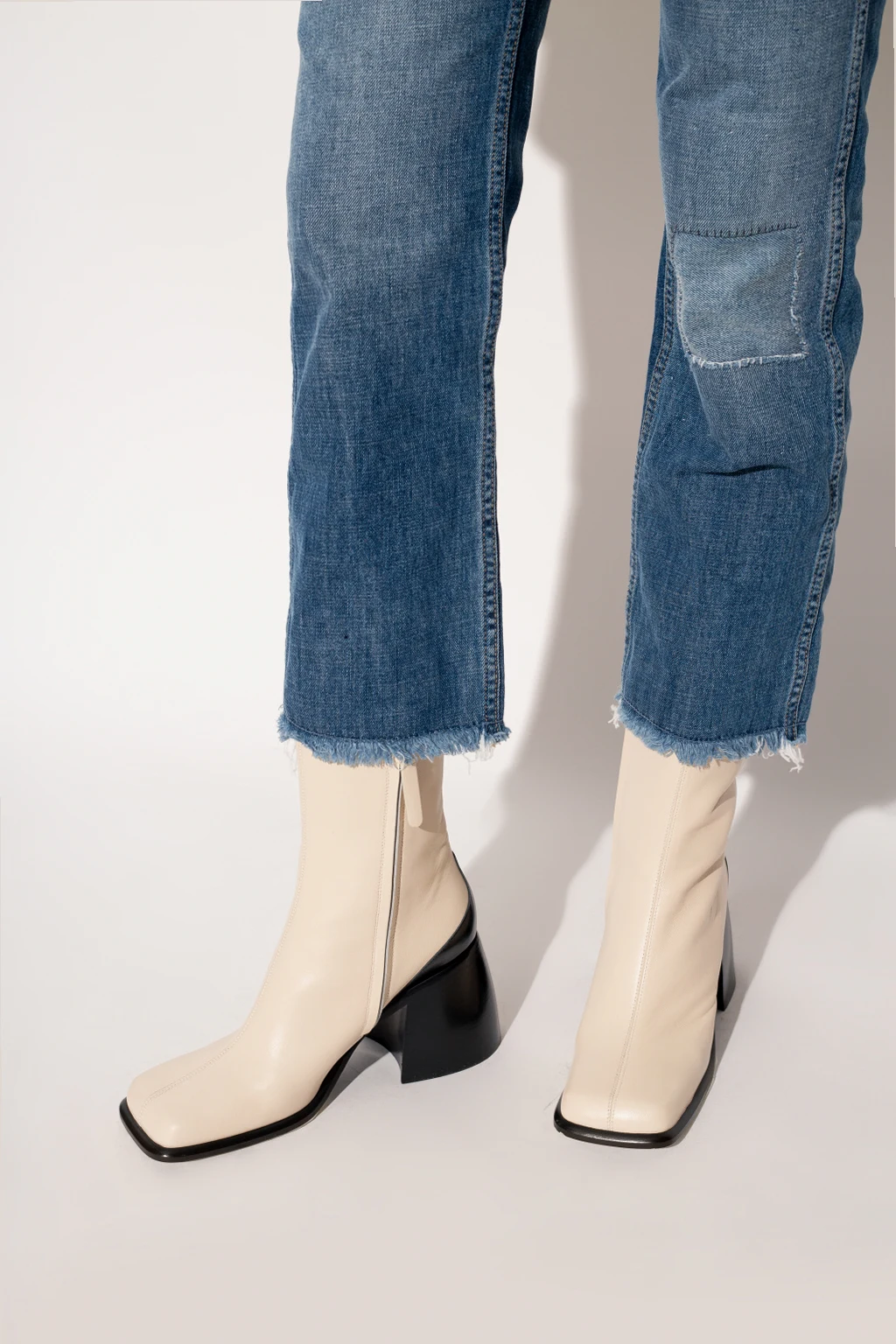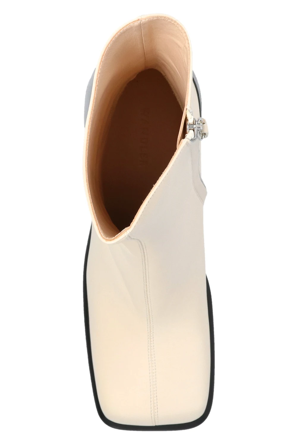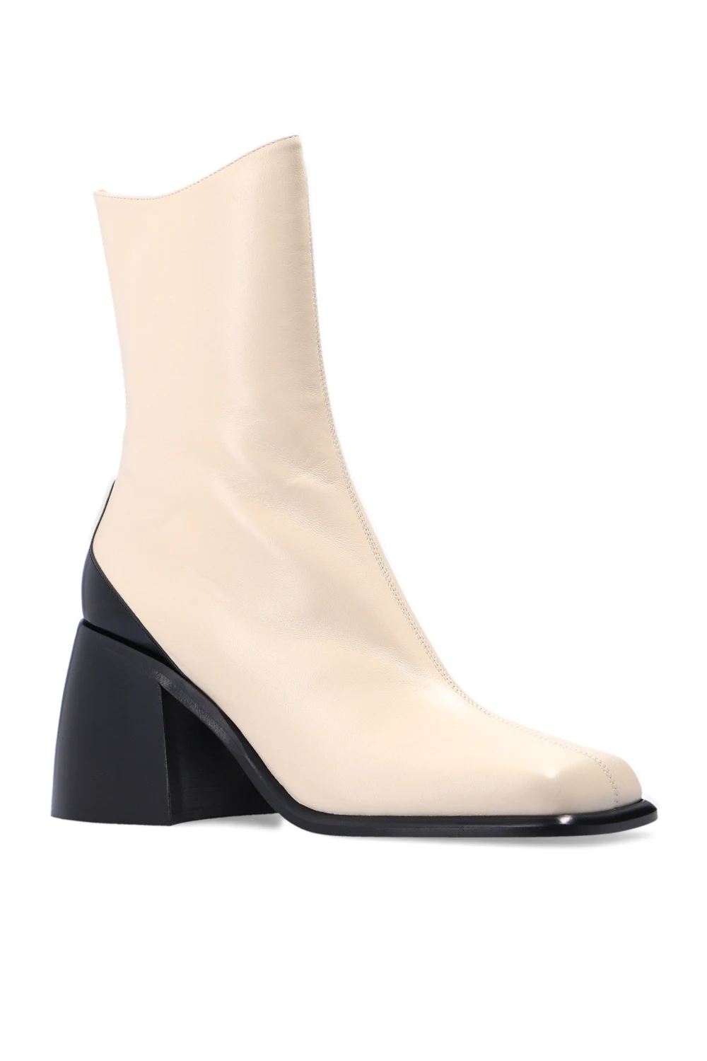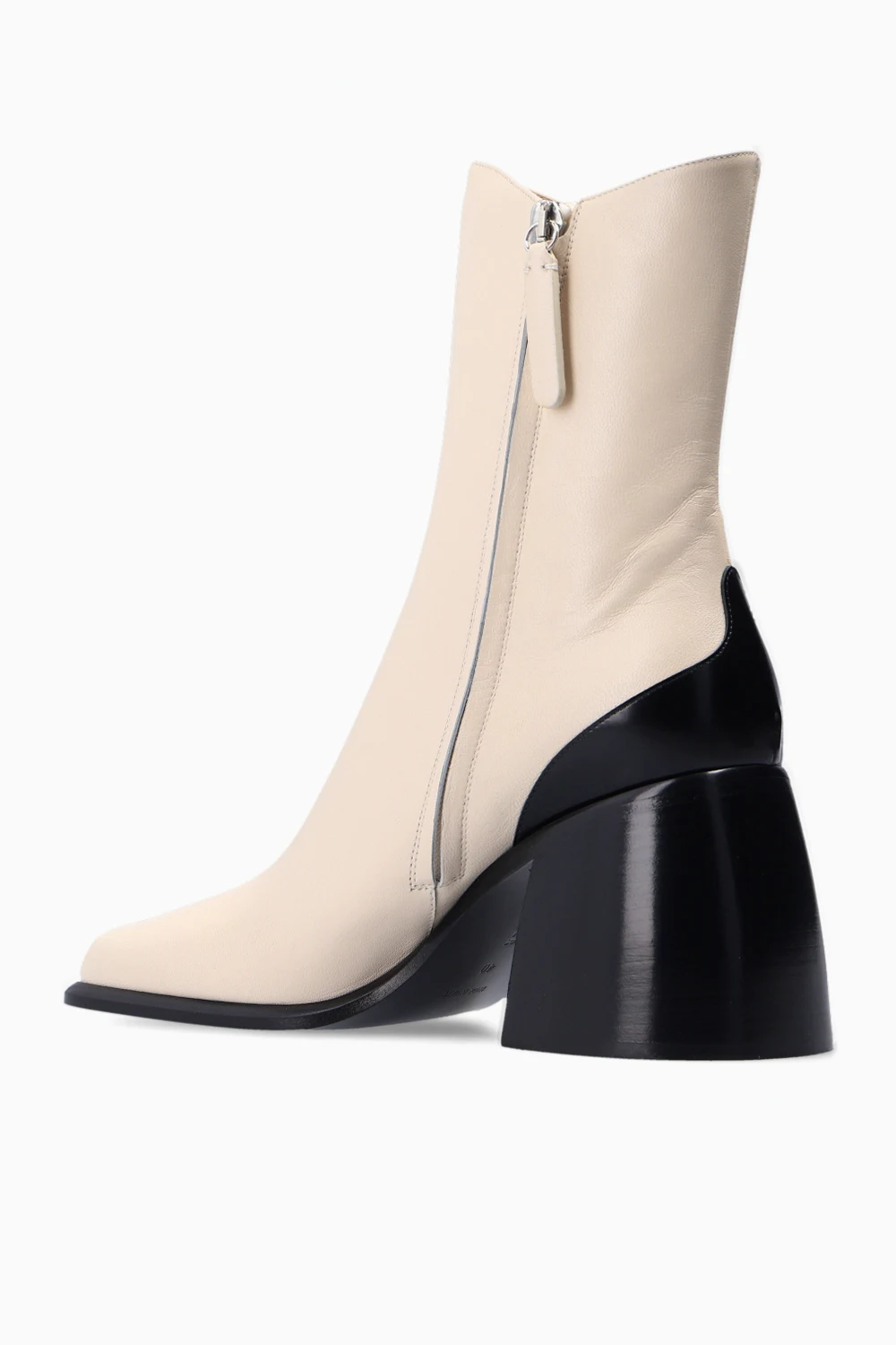 Cream ‘Ella’ heeled ankle boots from Wandler. Crafted from goat leather, this model showcases a square toe, a side zip closure, a black leather sole and a cream lining.