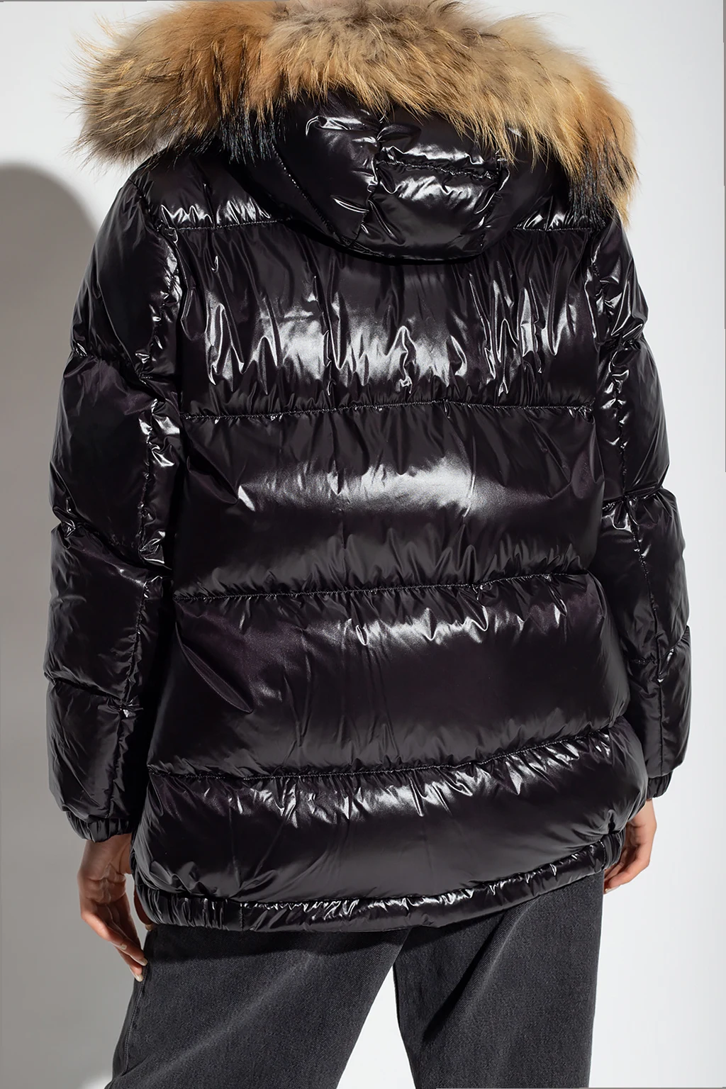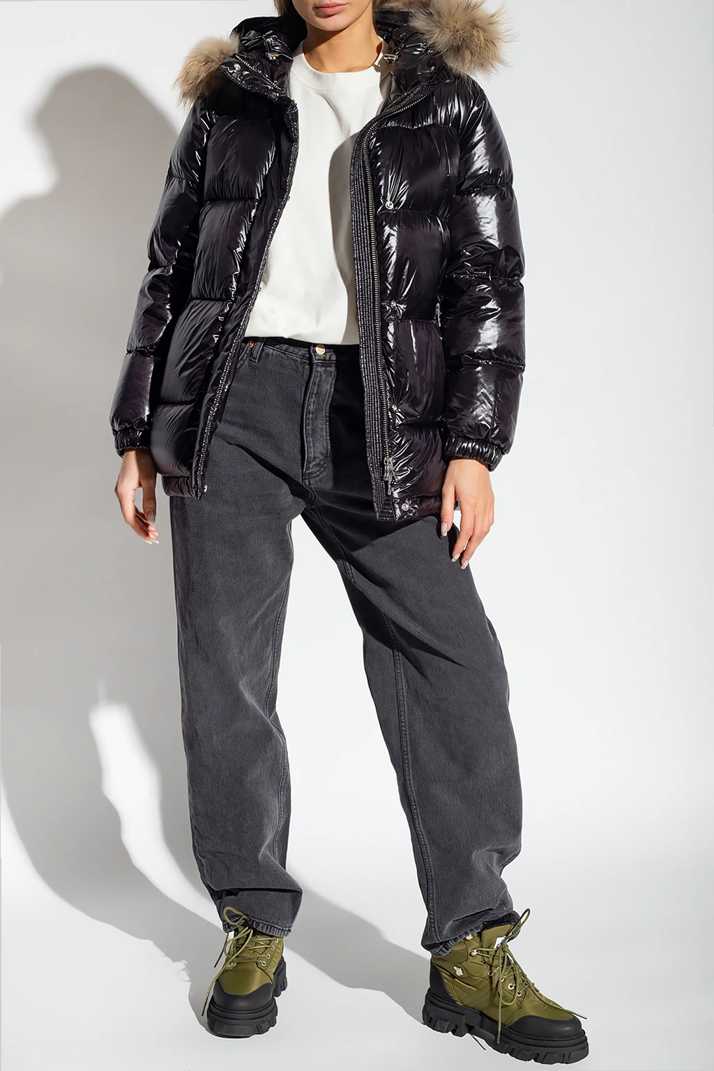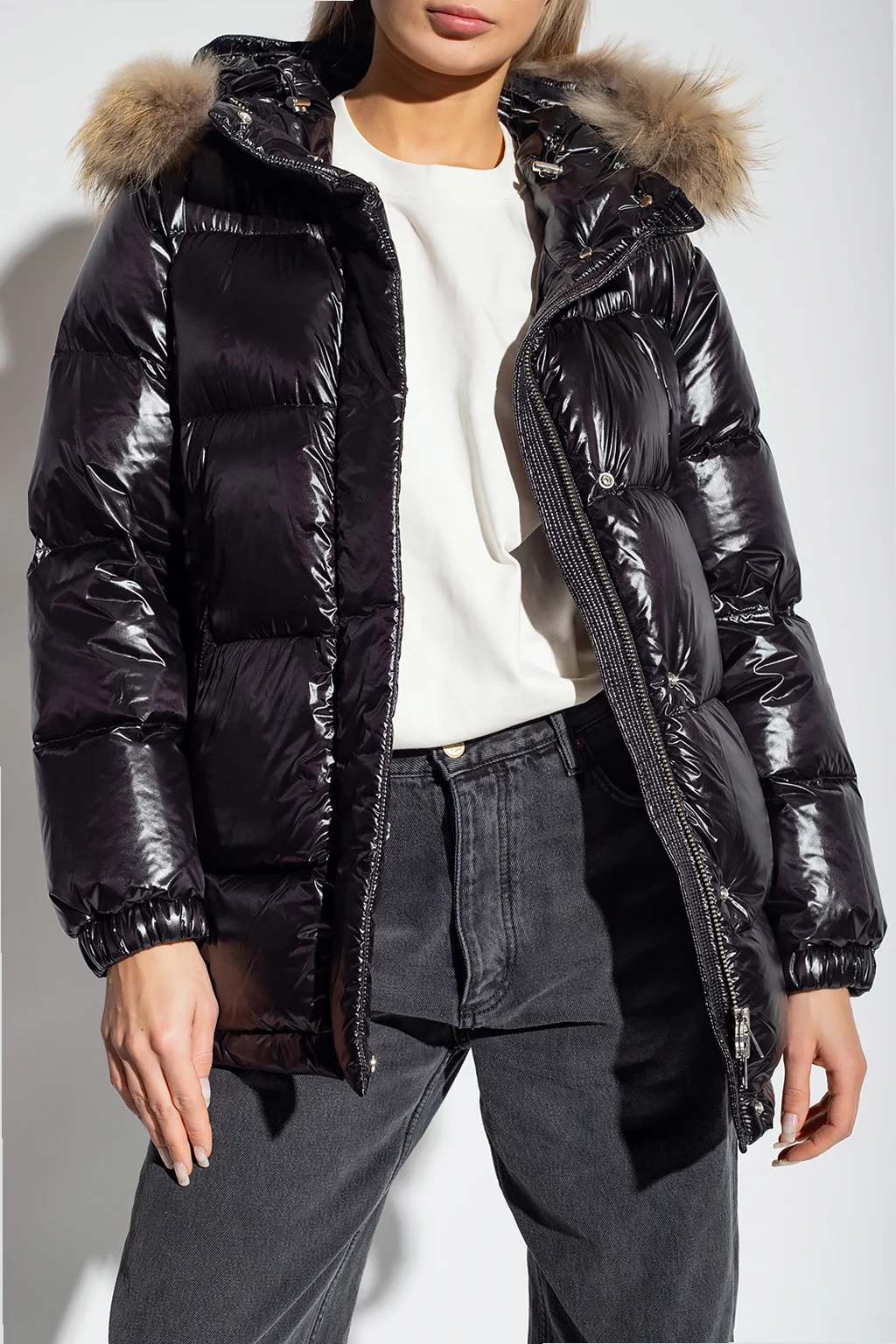 Black down jacket with a detachable hood from Woolrich. Fastened with a zipper and snaps, this style features two zip pockets, long sleeves, a logo patch on the side and elasticized trims on the bottom hem and cuffs.