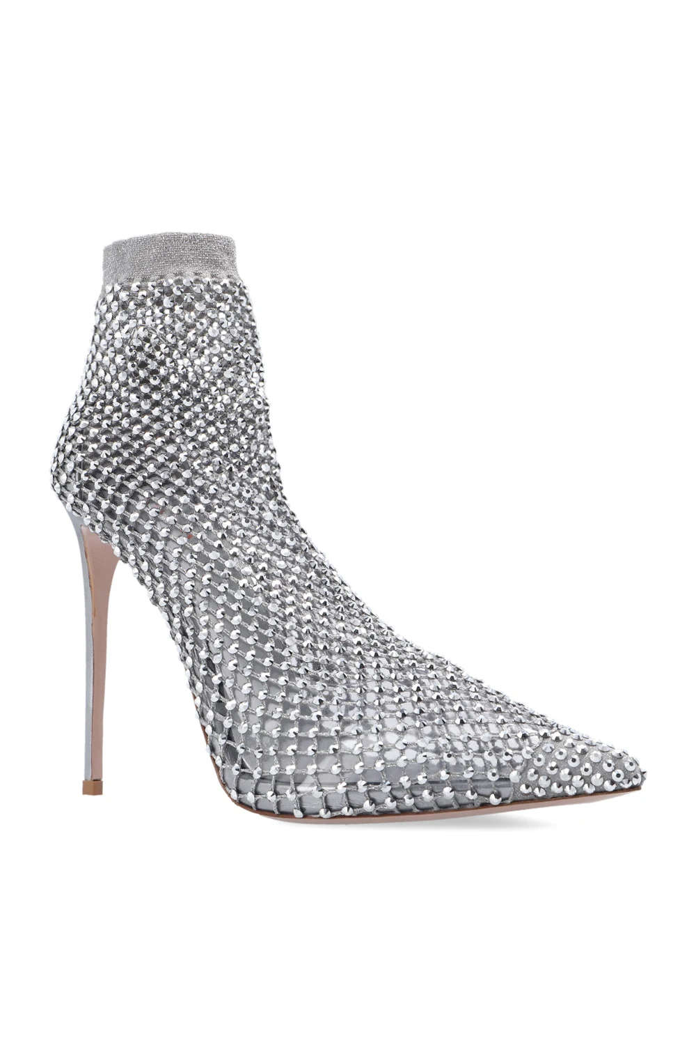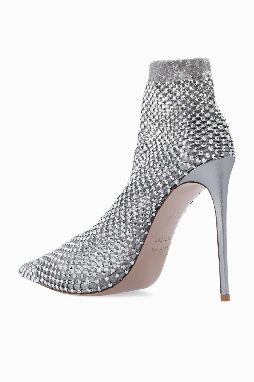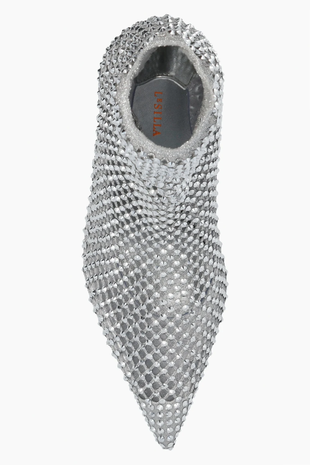 Silver-tone ‘Gilda’ sock pumps from Le Silla. Made of mesh embellished with crystals and lurex threads, this pointed toe design features ribbed trims and cream leather sole with rubber trims.