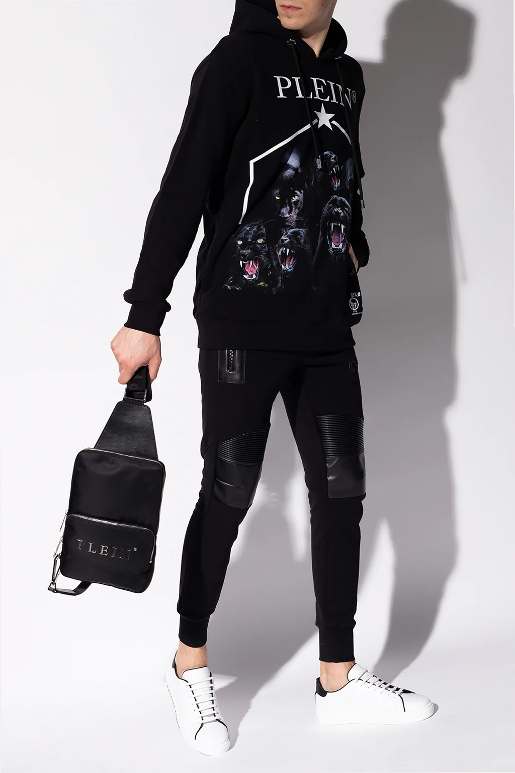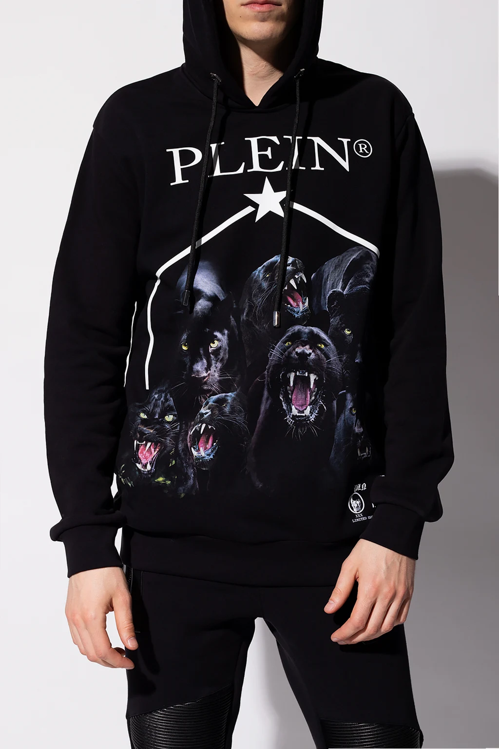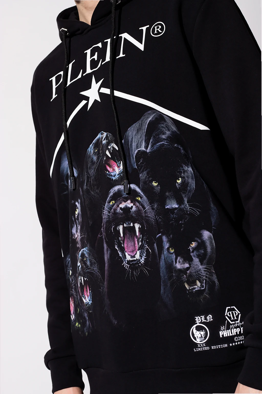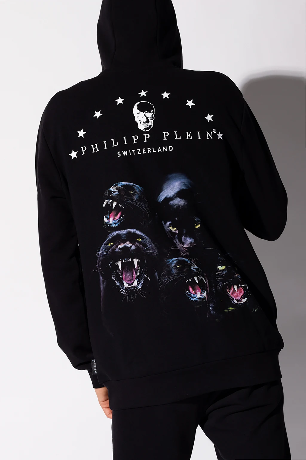 Black hoodie from Philipp Plein. Crafted from cotton, this design features a drawstring hood, multicolored logo pattern and two front slip pockets.