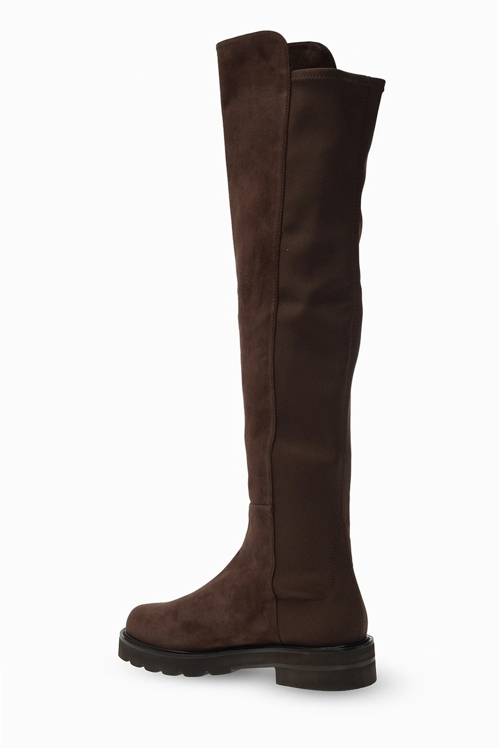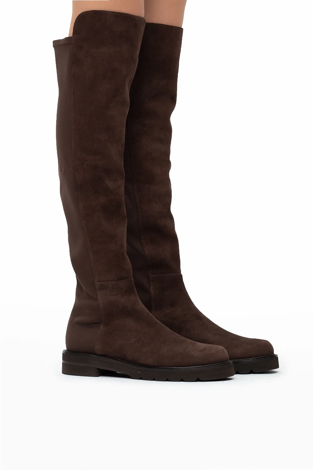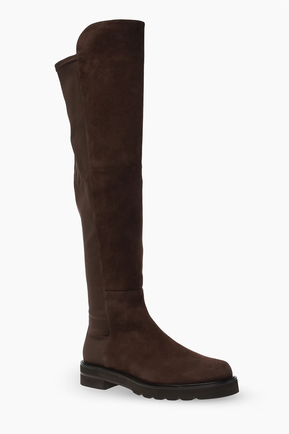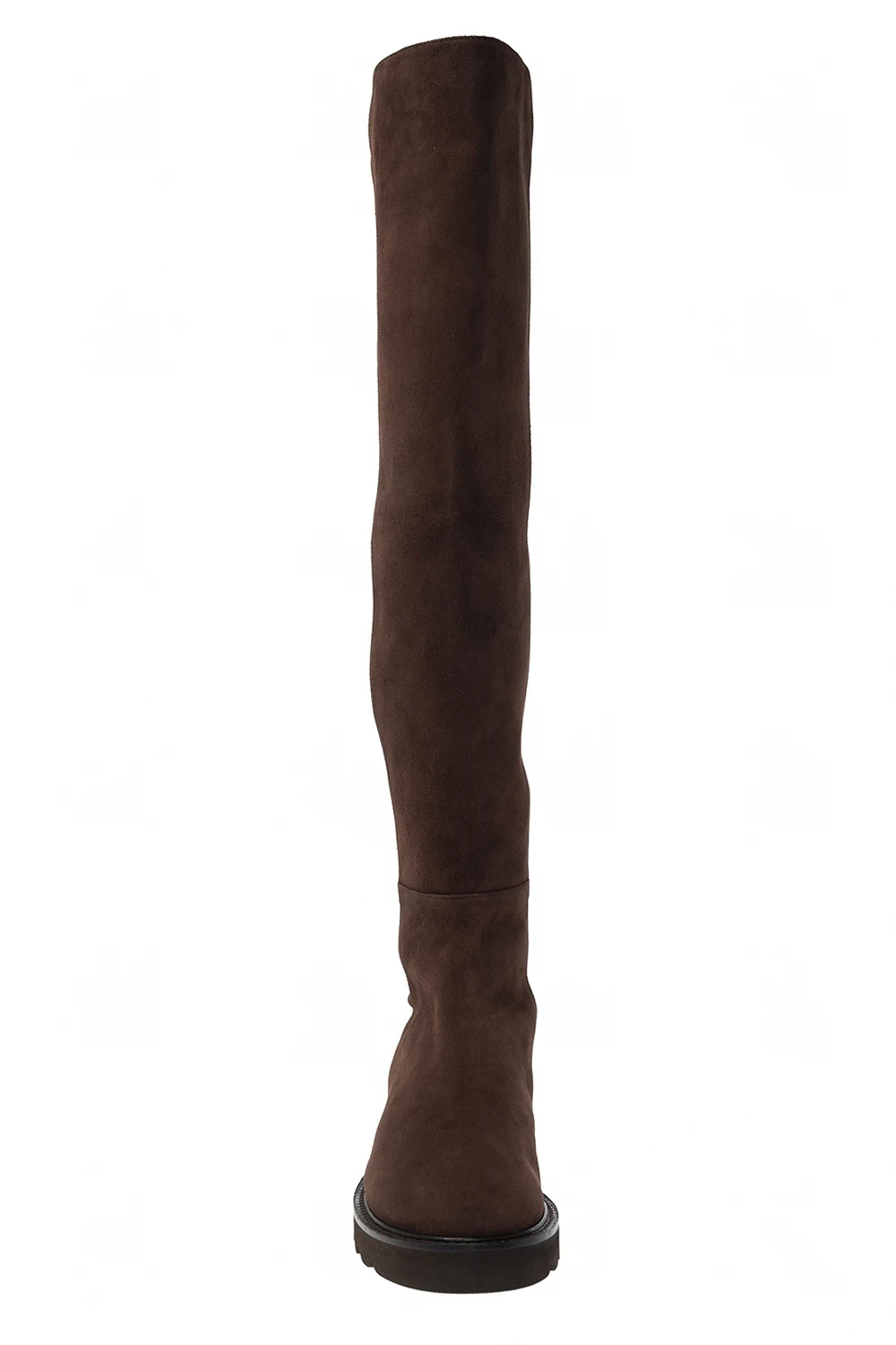 Brown ‘Lift’ boots from Stuart Weitzman. Made of suede, this pair rests on a black rubber sole.