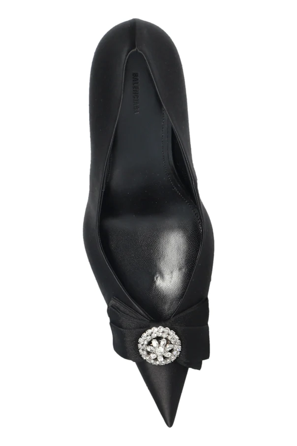 The outer finish, crafted from luminous black satin, is exquisitely complemented by a round, crystal-adorned buckle gracefully resting on a gently ruched satin ribbon. The understated design, free from extraneous stitching or patterns, lets the shoe’s artistry and opulent materials command attention.