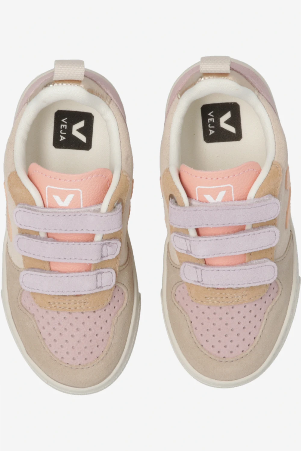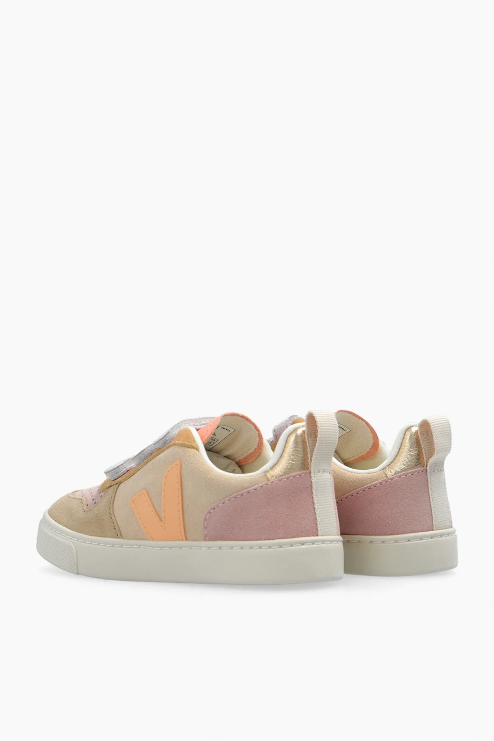 Beige, purple and orange ‘V-10’ sneakers from Veja Kids. Crafted from sustainable bovine suede, this model features a triple velcro closure, the brand's signature light orange V patch made of rubber and rice waste and a logo-printed tongue. The mesh inner lining made from recycled materials was developed to acquire a better resistance to friction. The organic-sourced and recycled insole consists of sugar cane, Amazon rubber, organic cotton and recycled EVA. It is set on a cream rubber sole made from organic and recycled materials and equipped with latex L-Foam cushioned technology.