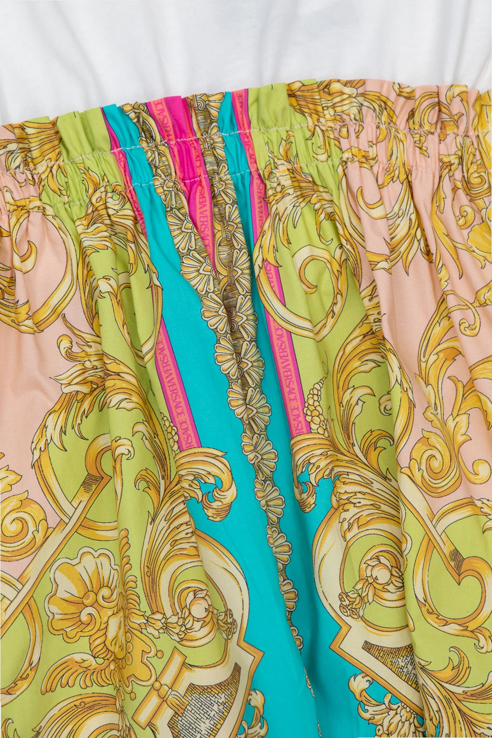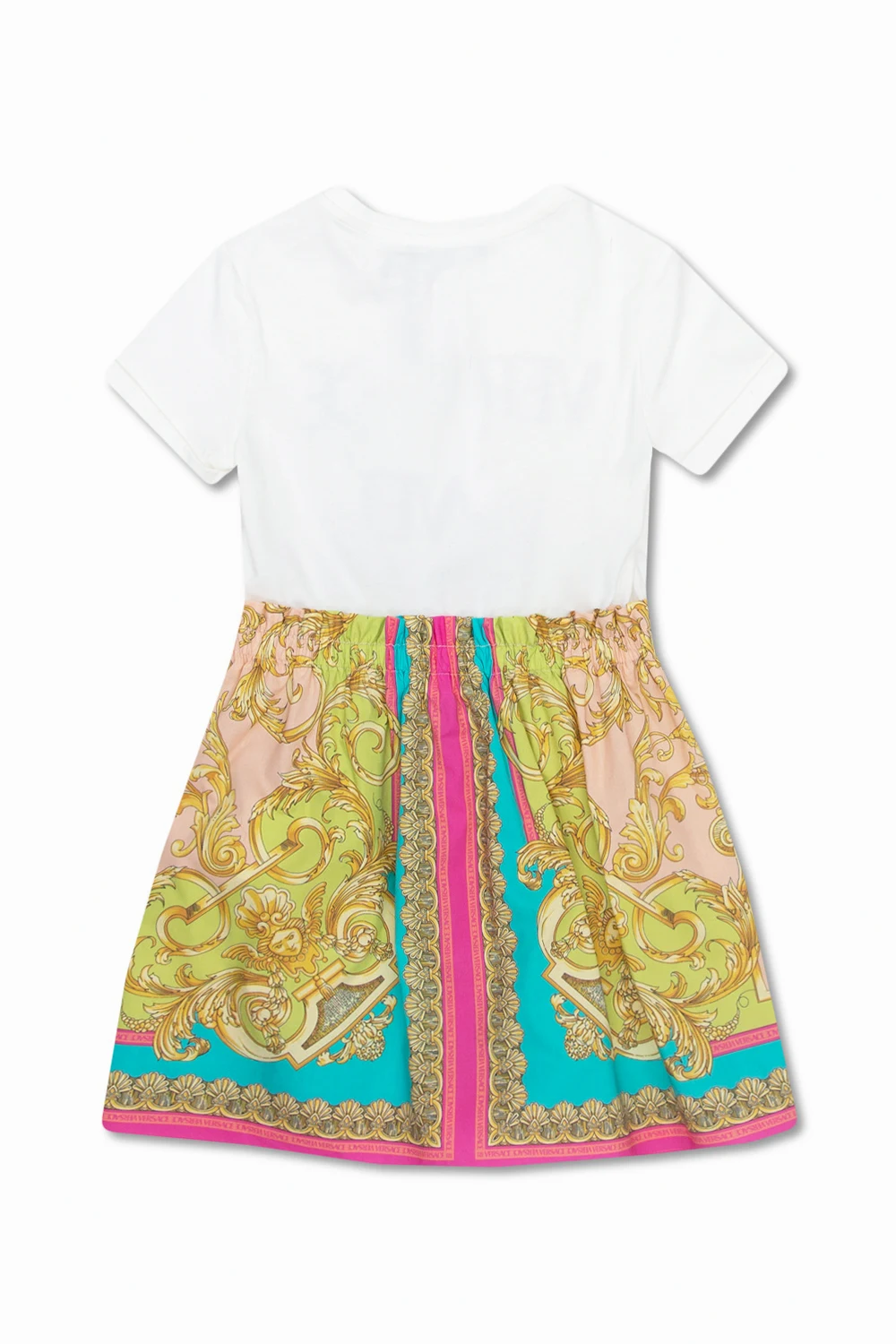 Multicolored dress from Versace Kid. Made of cotton, this design features a black logo print, multicolored skirt with the label’s signature Barocco Goddess pattern, ribbed crew neck and shorts sleeves with turn up cuffs.