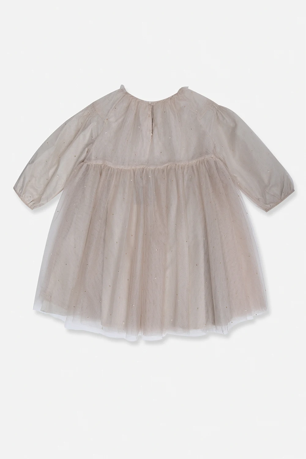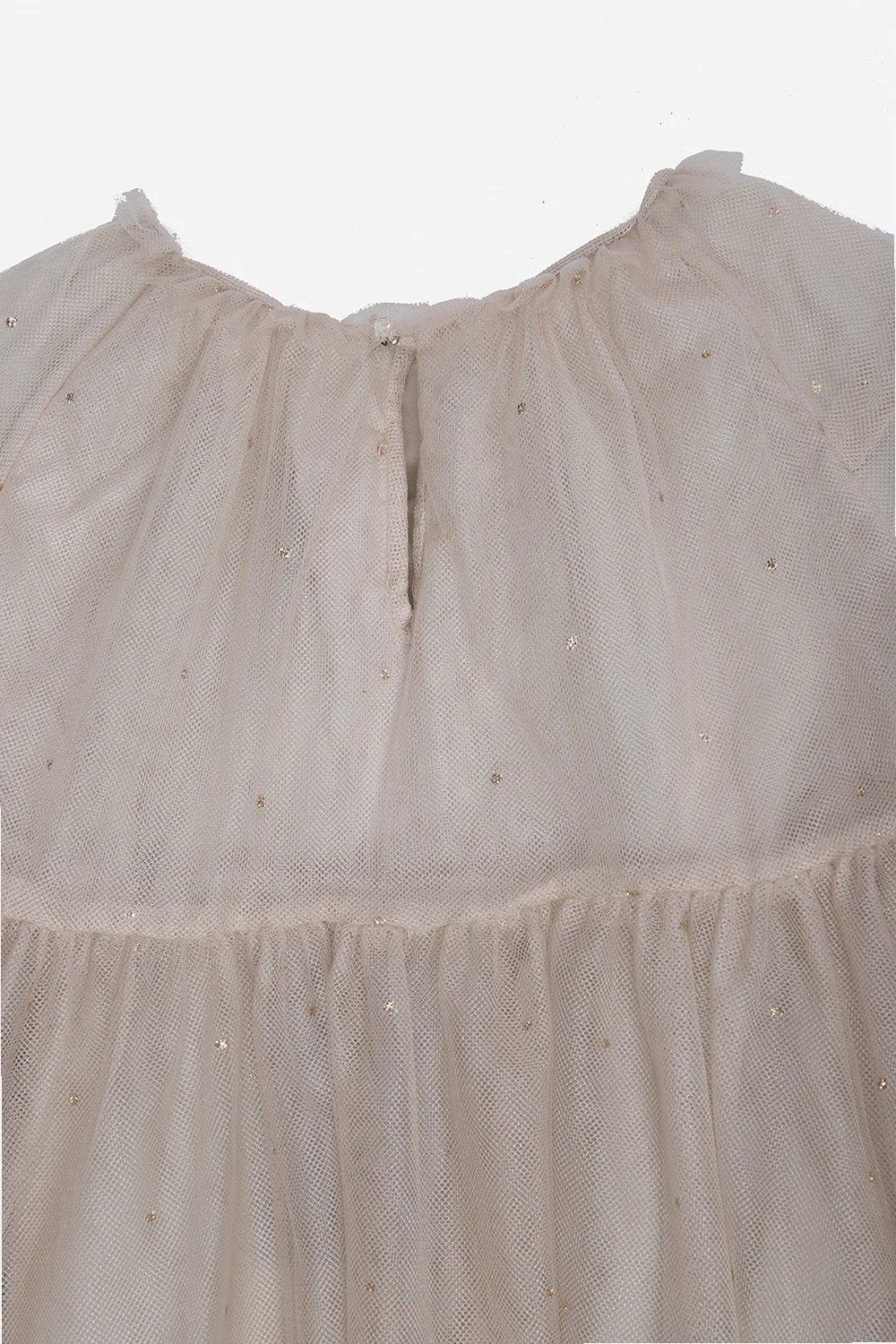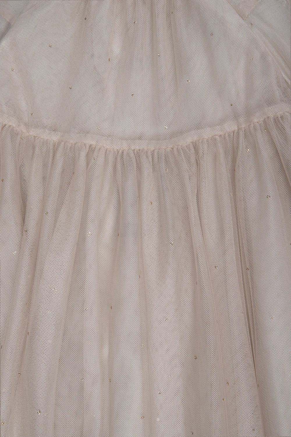Greyish beige tulle dress from Bonpoint. Fastened with a shiny button at the back, this flared design has long sleeves.