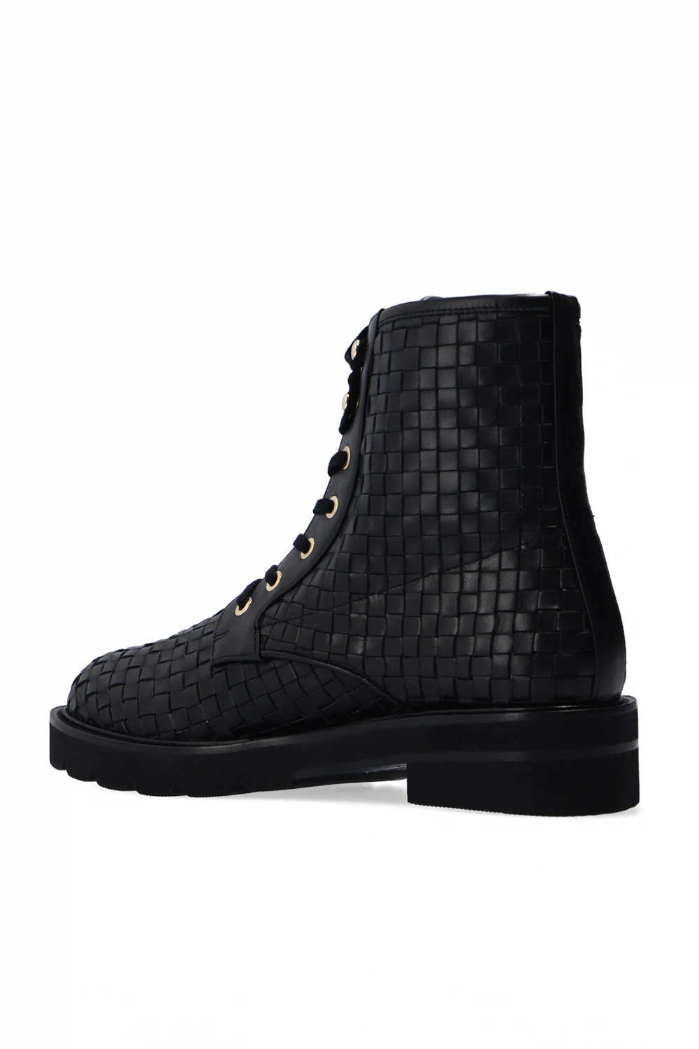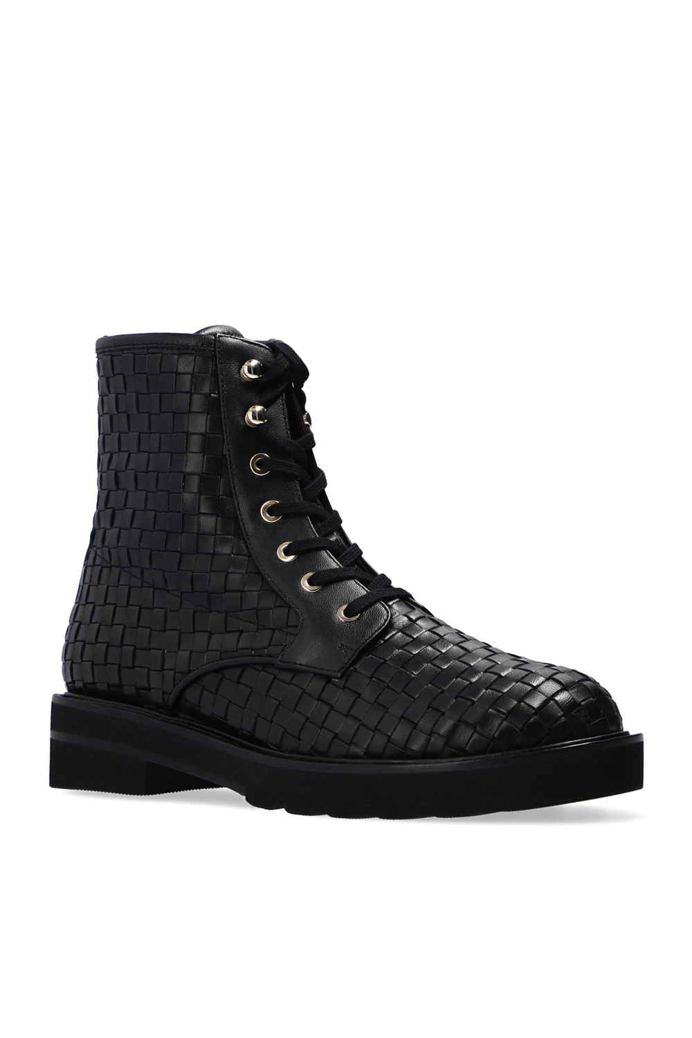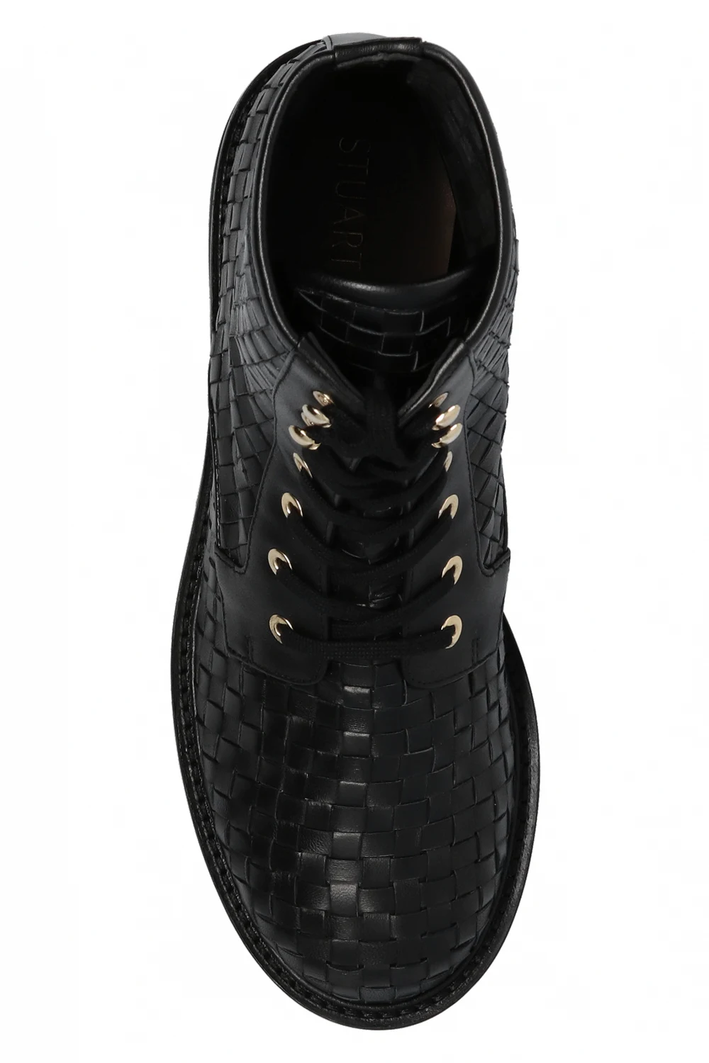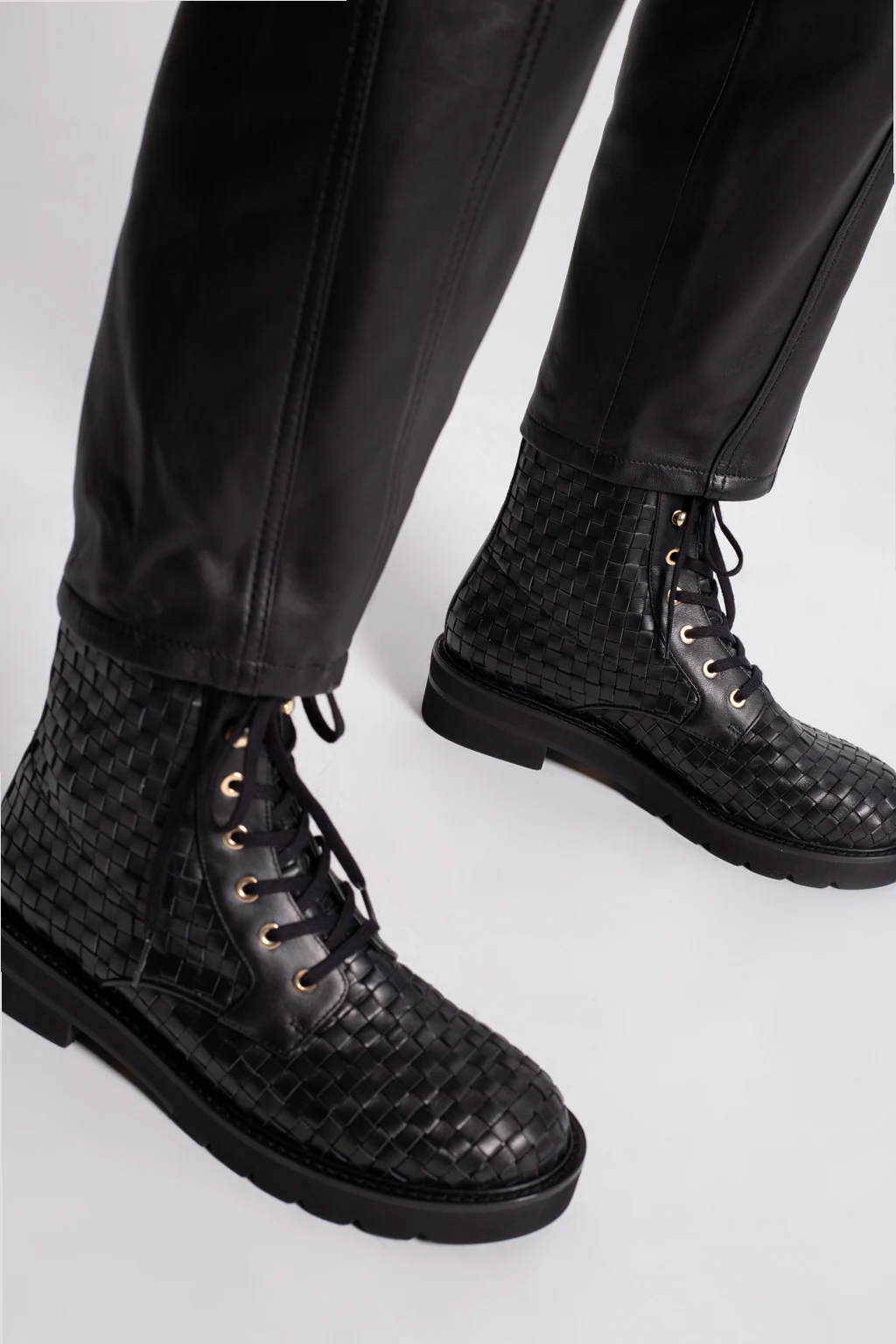 Black ‘Mila’ woven ankle boots from Stuart Weitzman. Made of leather, this lace-up pair features a black rubber sole and a gold-tone metal hardware.