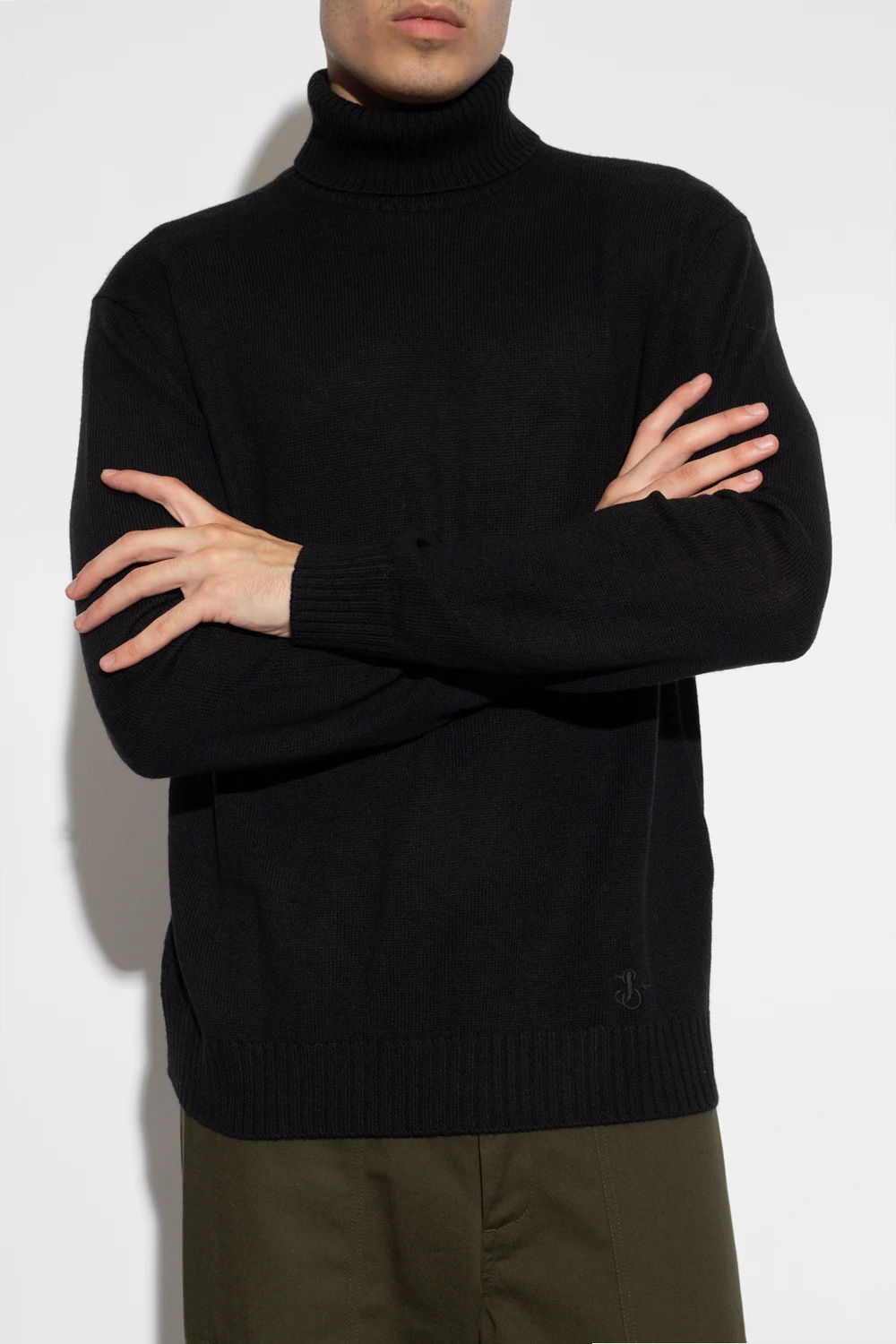 Black turtleneck sweater from Jil Sander+. Crafted from wool, this style features a snug collar, an embroidered logo on the front and a ribbed bottom hem and cuffs.