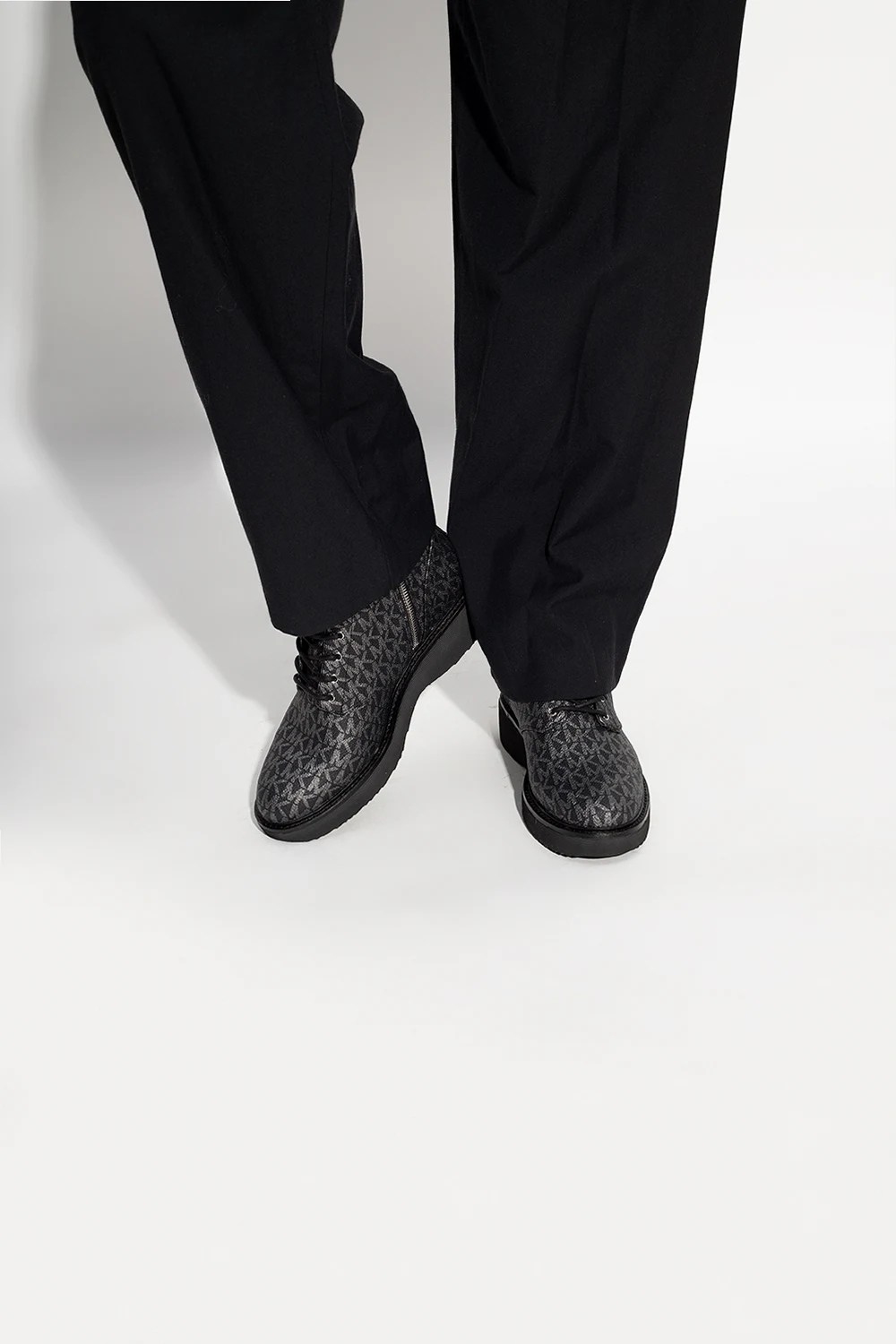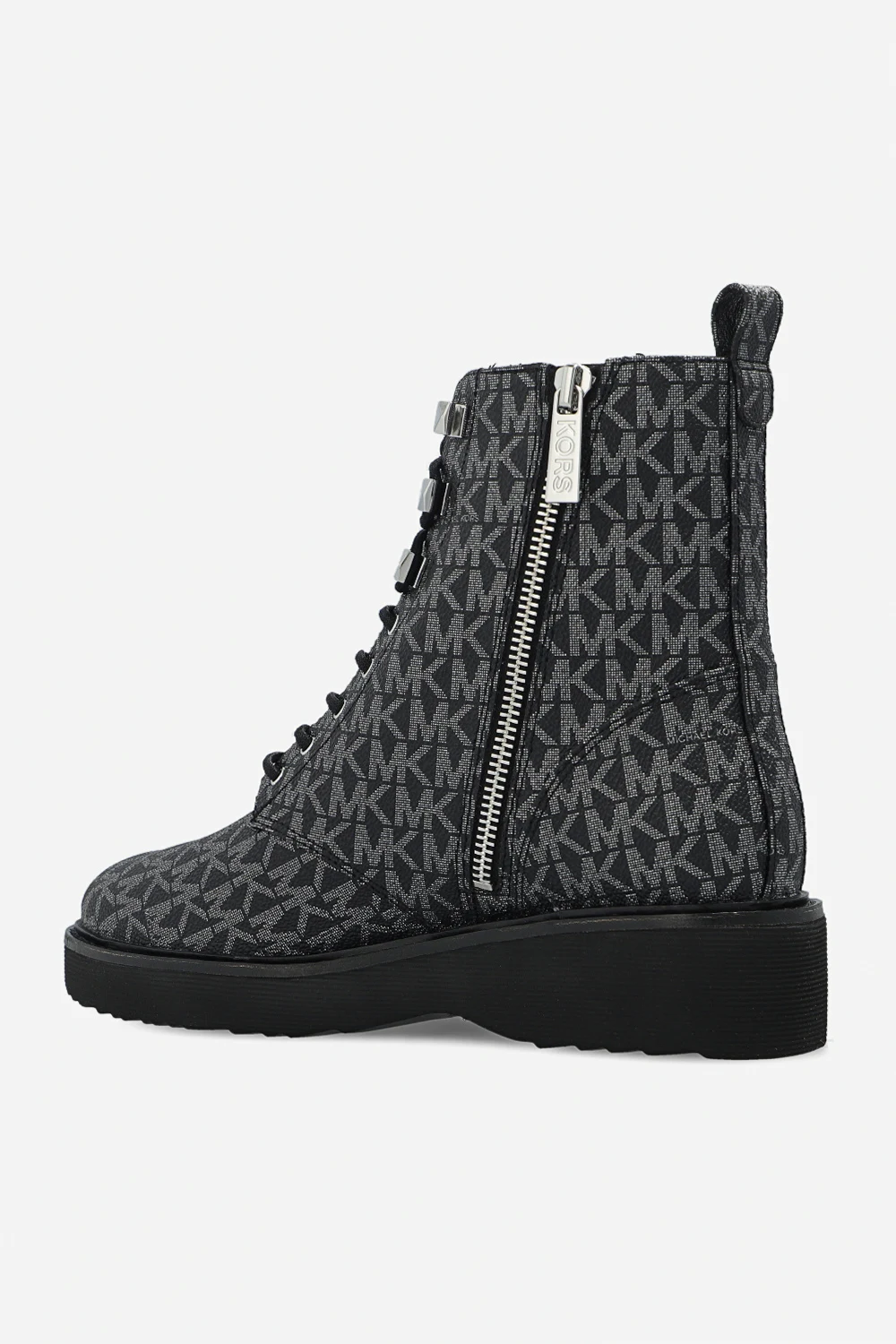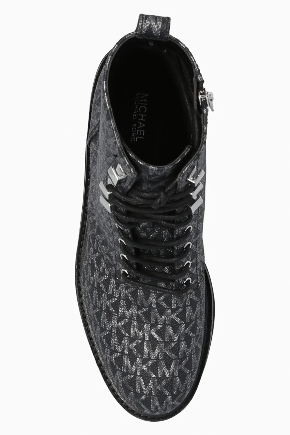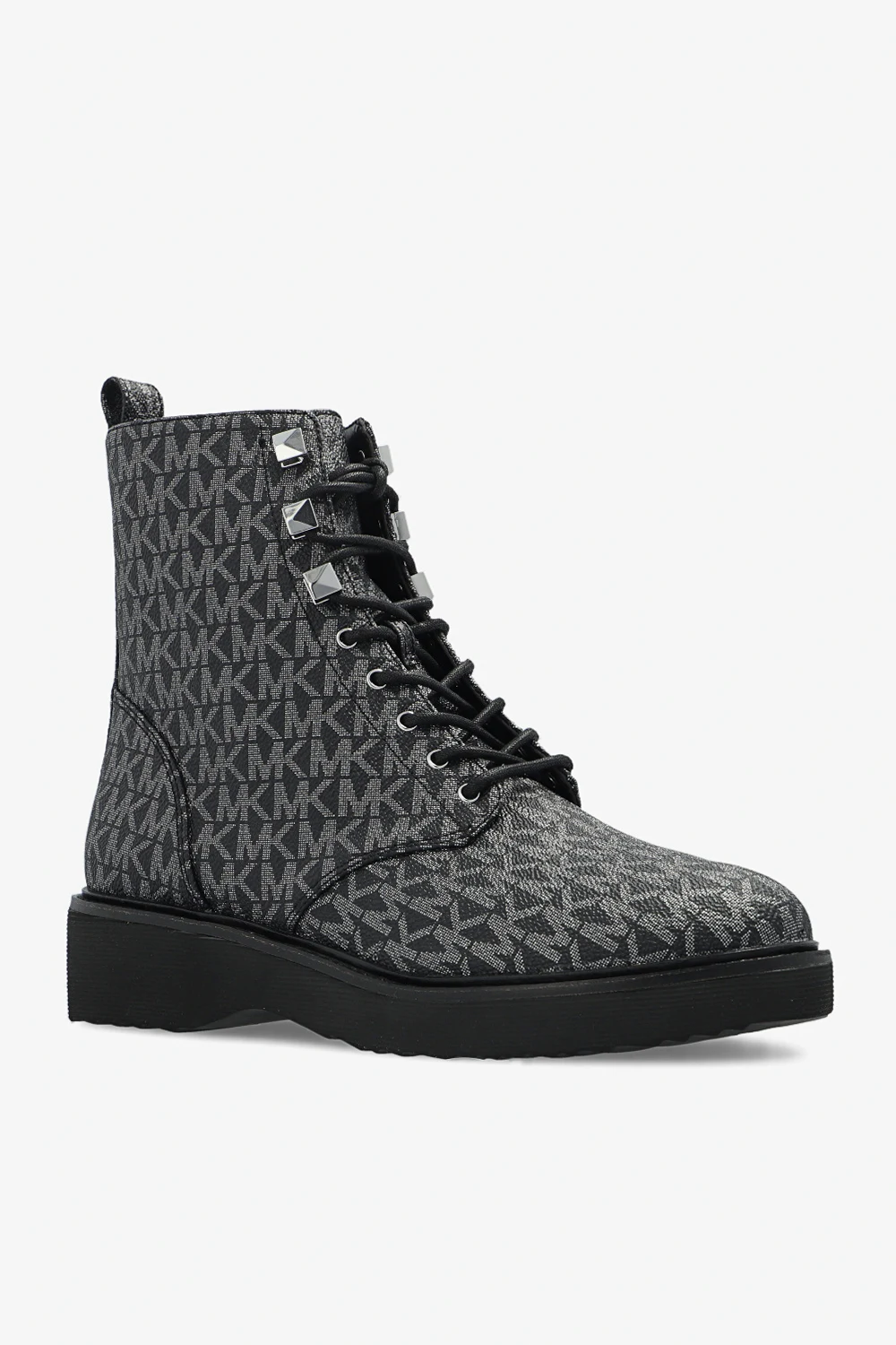 Black ‘Haskell’ ankle boots from Michael Michael Kors. Made of canvas, this lace-up pair features a zip fastening, monogram pattern, silver-tone metal hardware and black rubber sole.