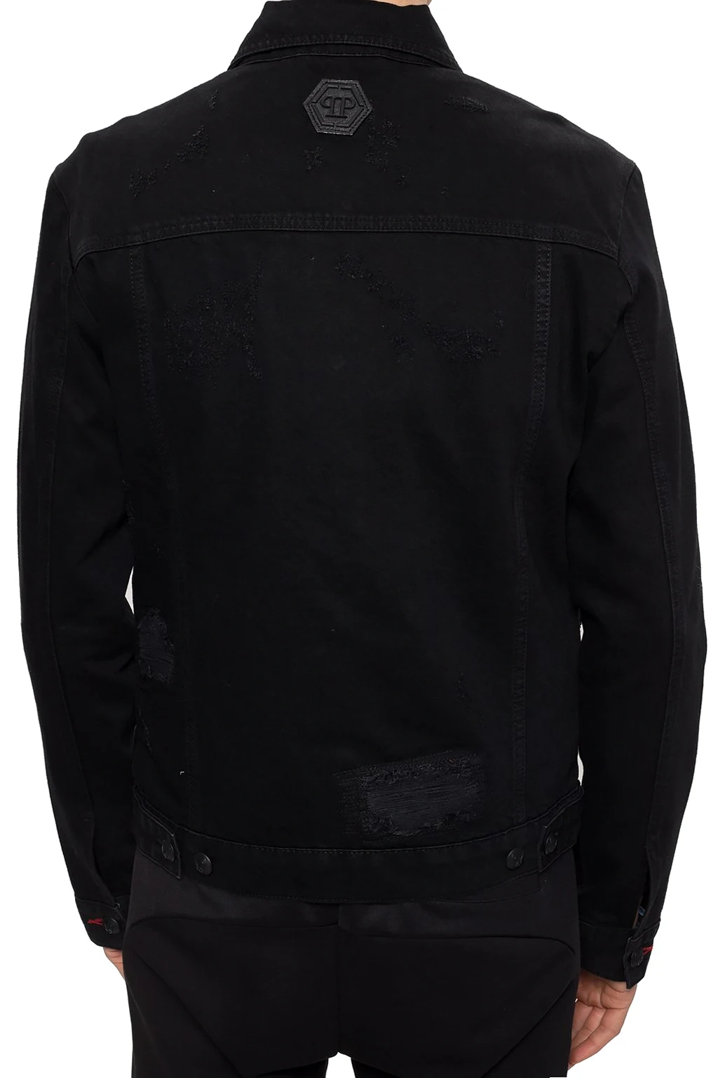Black distressed denim jacket from Philipp Plein. Sleeves decorated with silver-tone studs and buttons embossed with a pattern.