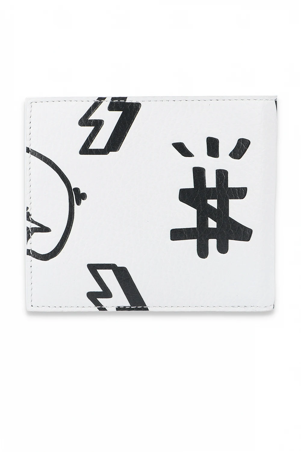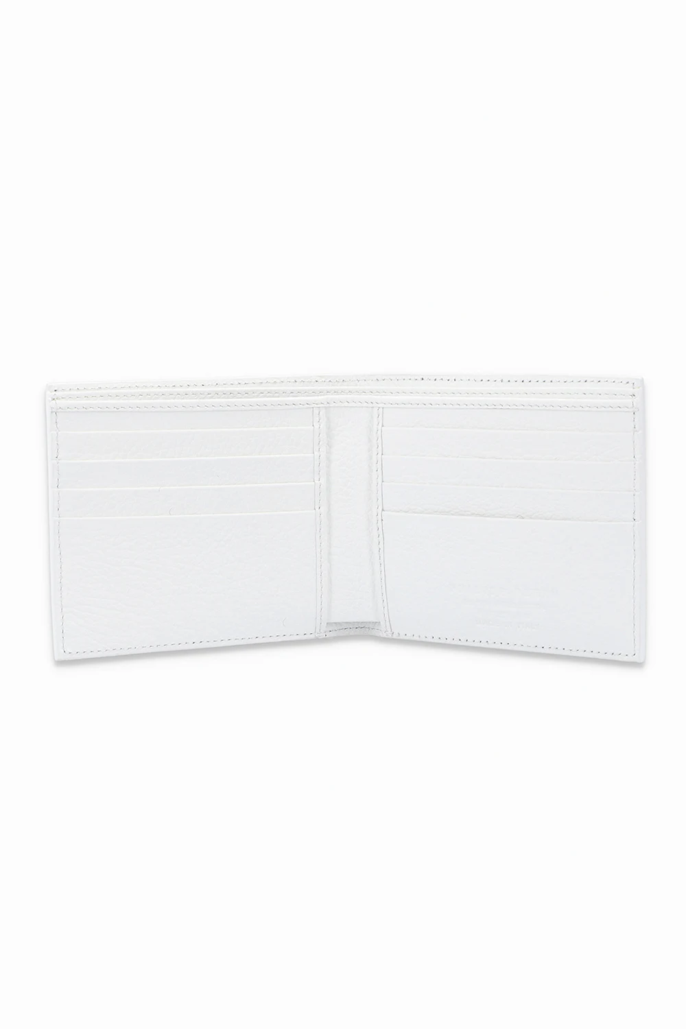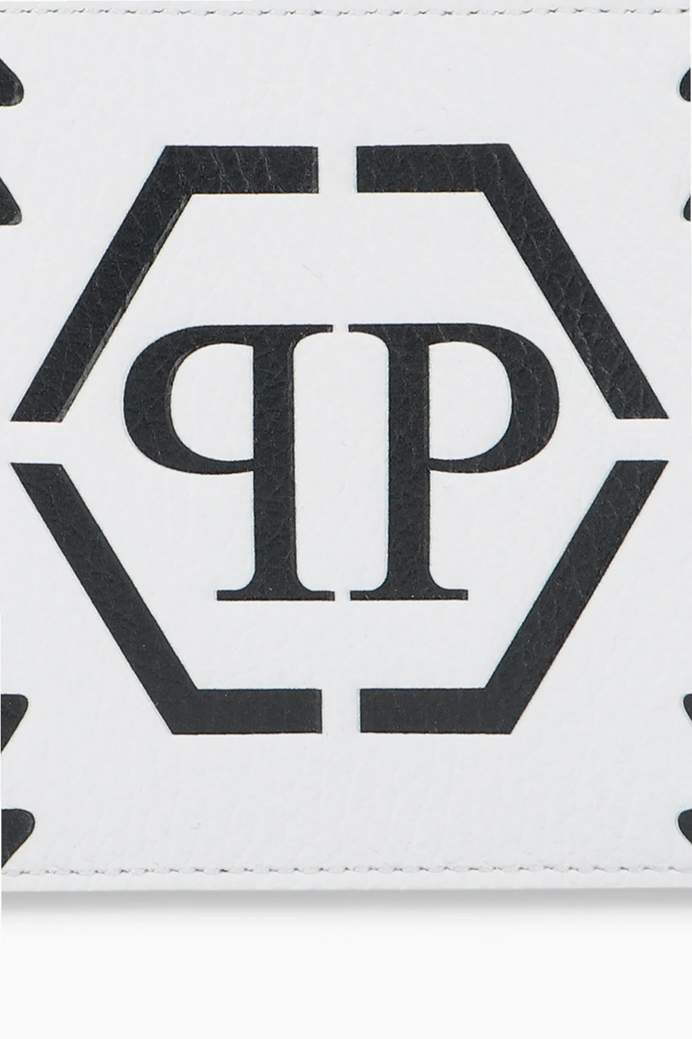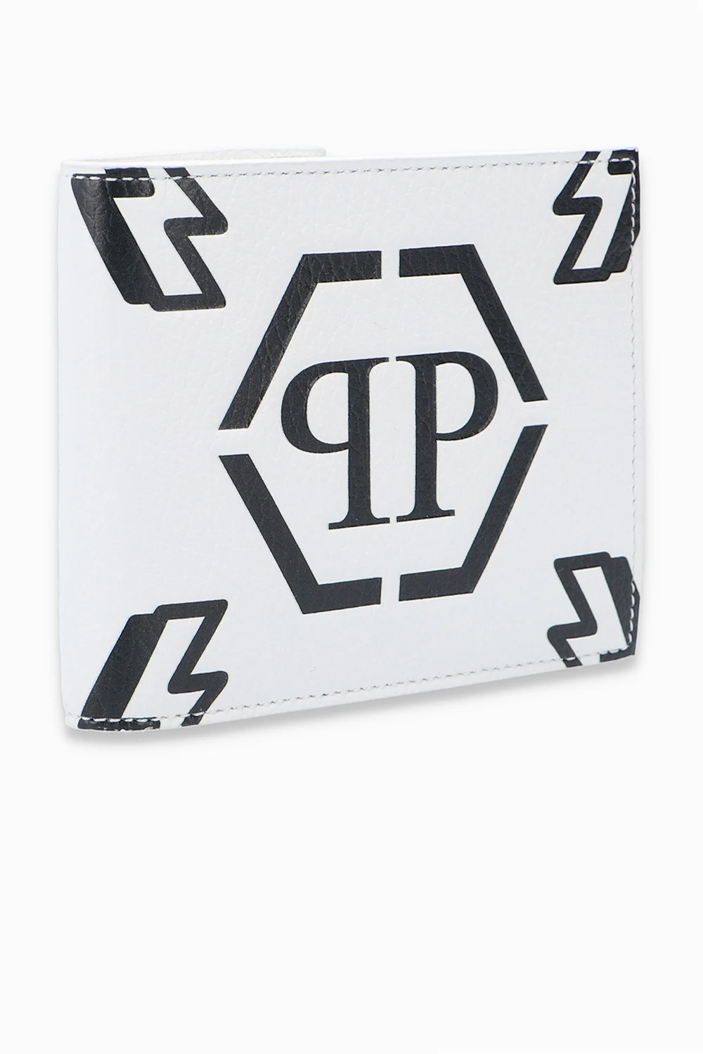 White bifold wallet from Philipp Plein. Crafted from textured leather, this design features a black logo print, two internal bill compartments and ten card slots.