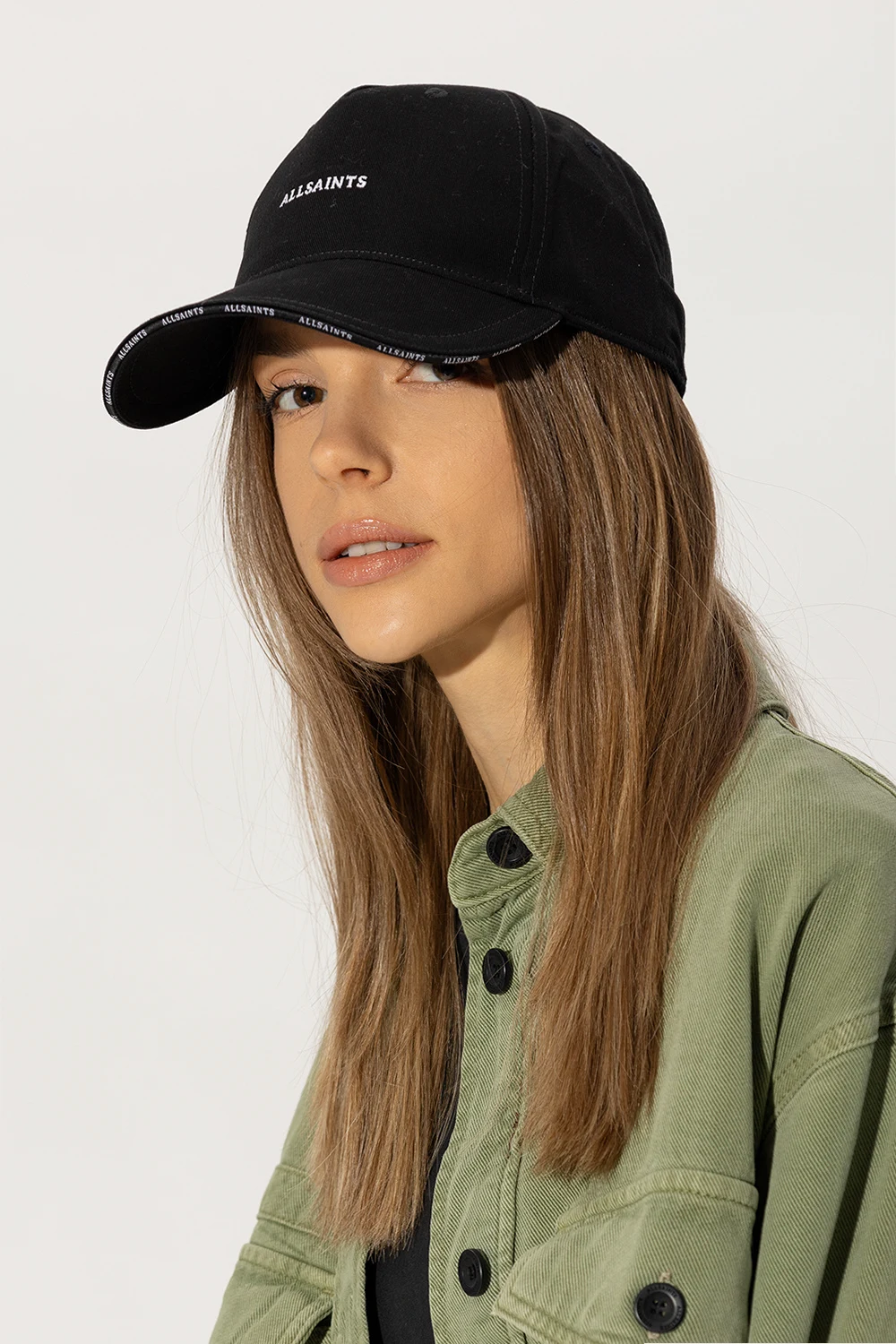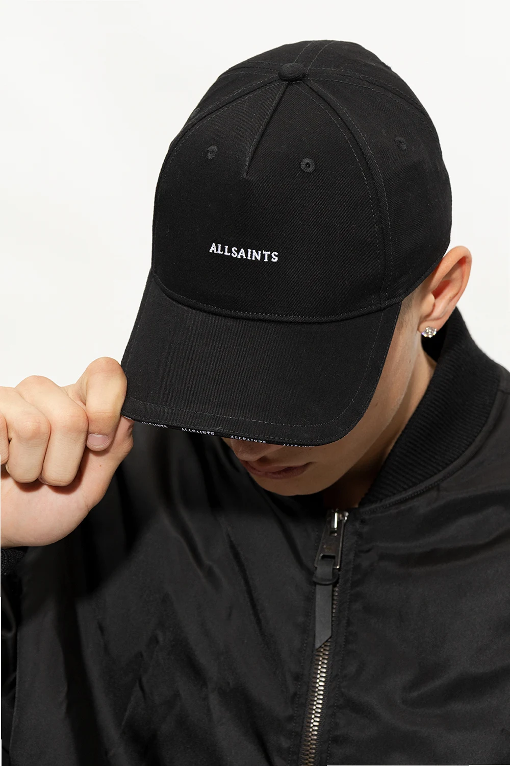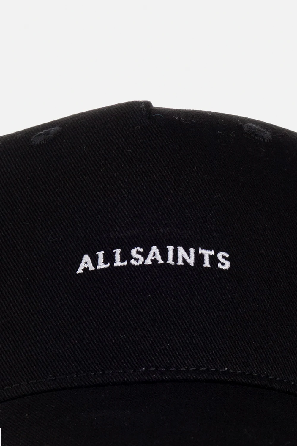 Black baseball cap from AllSaints. Made of cotton, this item features an embroidered logo pattern in white and adjustable buckle belt at the back.