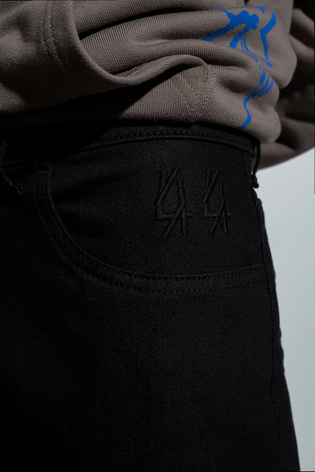 Black ‘Crude’ jeans from 44 Label Group. Fastened with buttons, this pair falls down with straight legs and is complete with a logo embroidery, light brown logo patch, three front pockets and two back pockets.