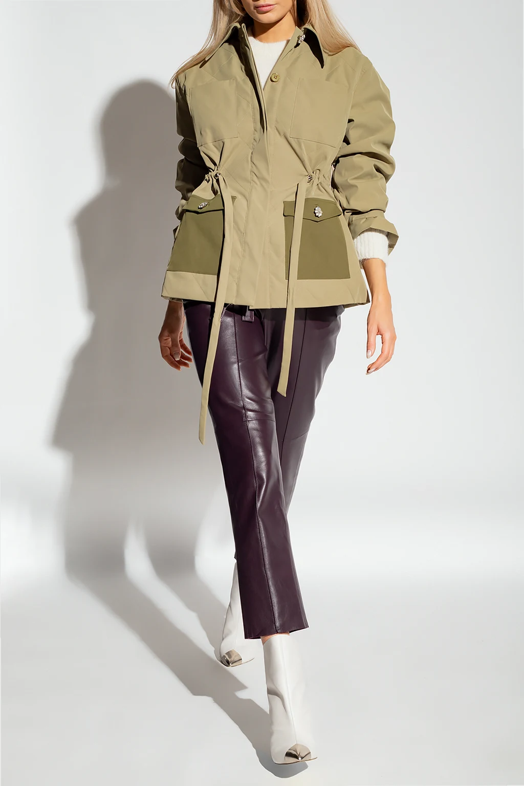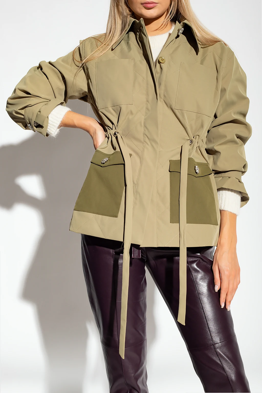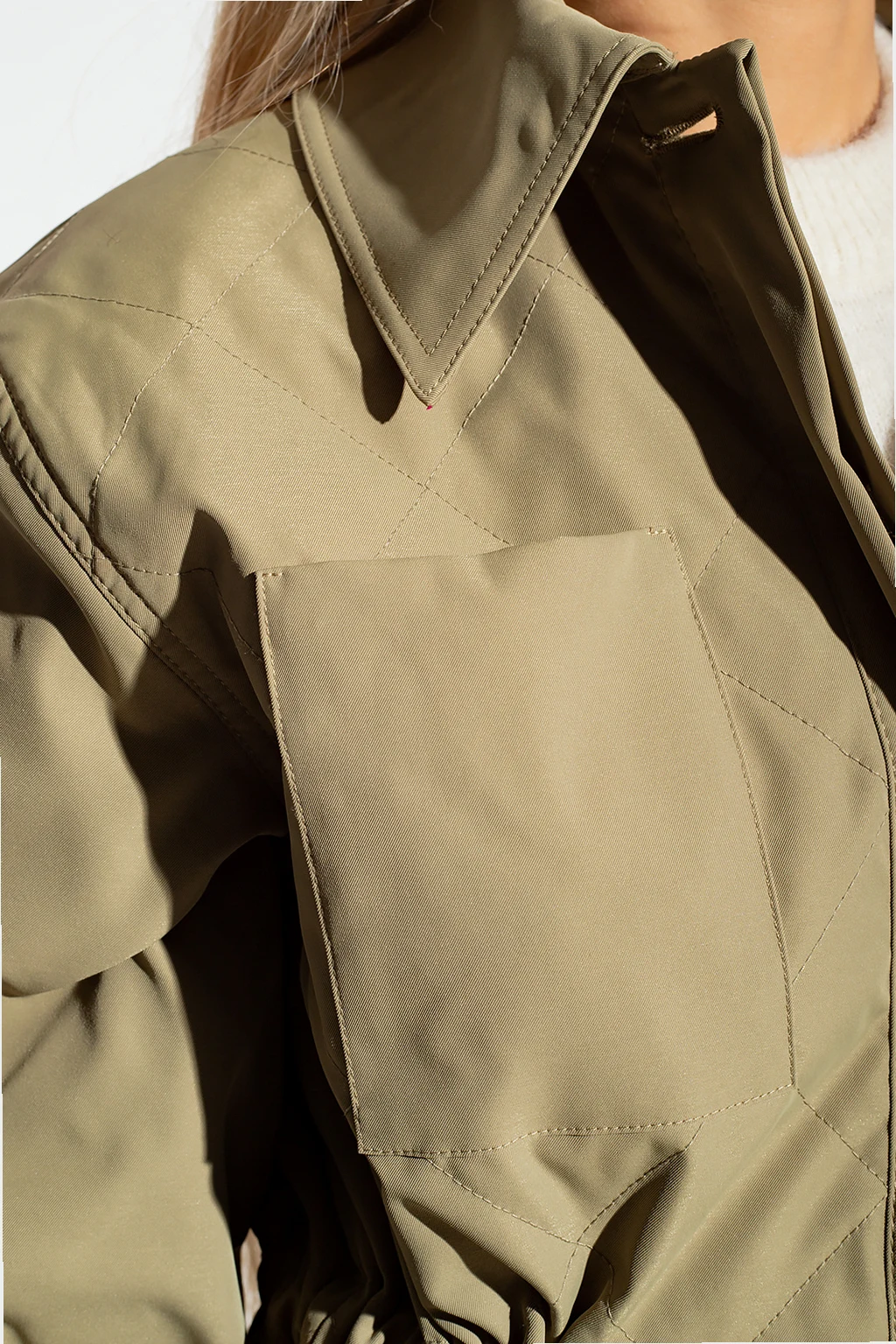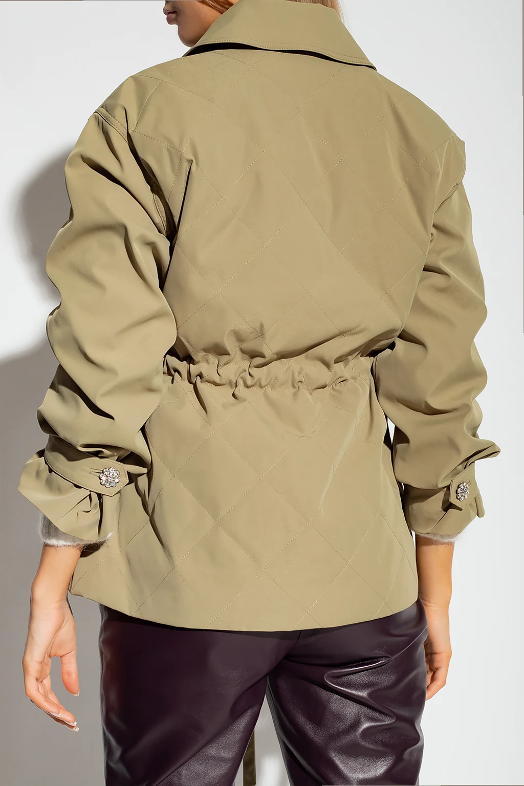 Green ‘Fiona’ quilted jacket from Custommade. Fastened with the brand's signature bejewelled buttons with a concealed placket, this style features a waist-cinching drawstring belt, two slip pockets, two flapped pockets with buttons and long sleeves with cuff adjusters.