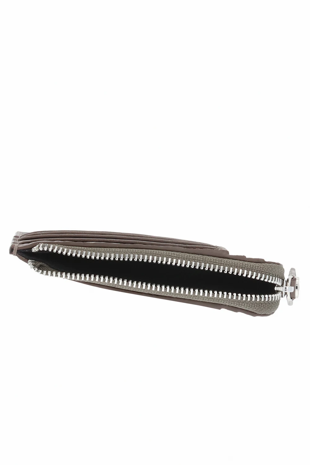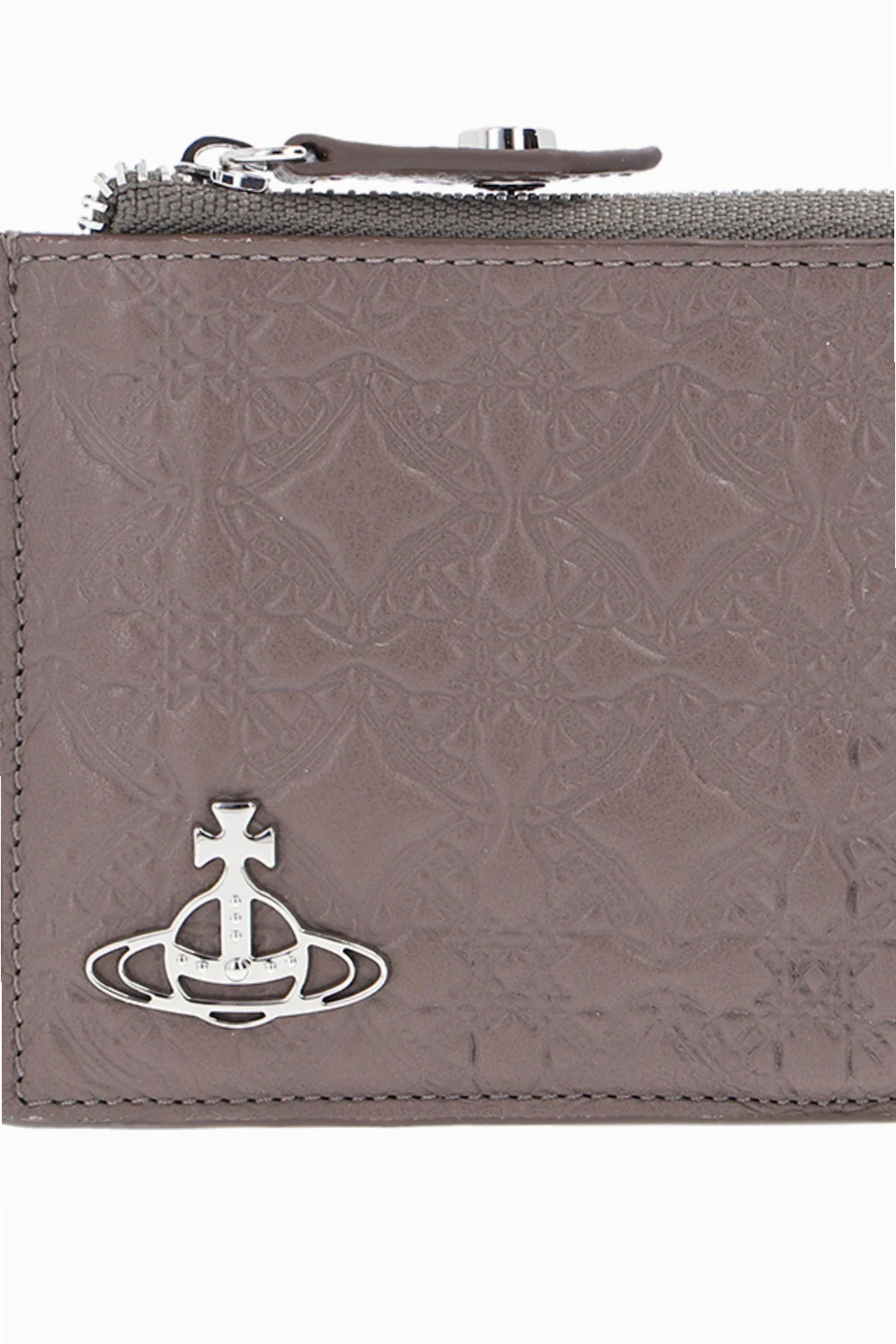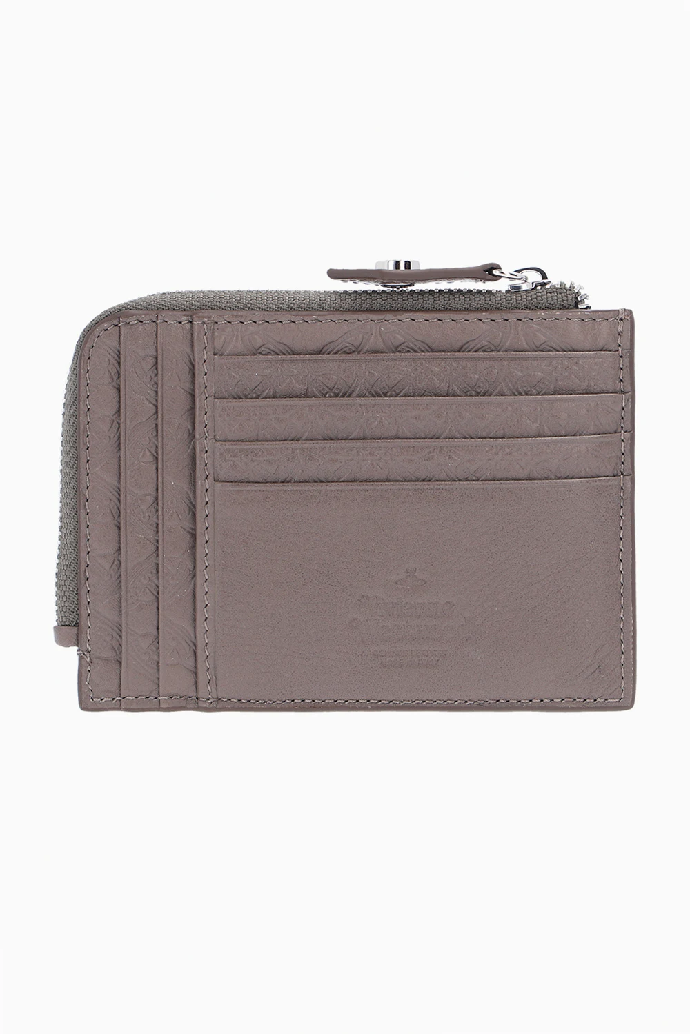 Brown card holder 'George' from Vivienne Westwood. Made of cow leather. Decorated with an embossed pattern and a logo. A ball-shaped application with a silver-colored logo. Zipped pocket. Ten card slots.