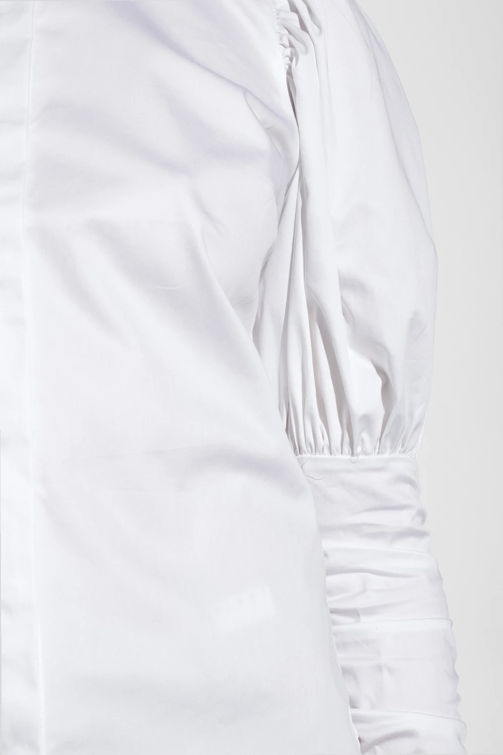 White 'Nila’ shirt a with standing collar from Notes Du Nord. Crafted from a cotton blend, this style features button fastenings with a concealed placket and long sleeves with gathers.