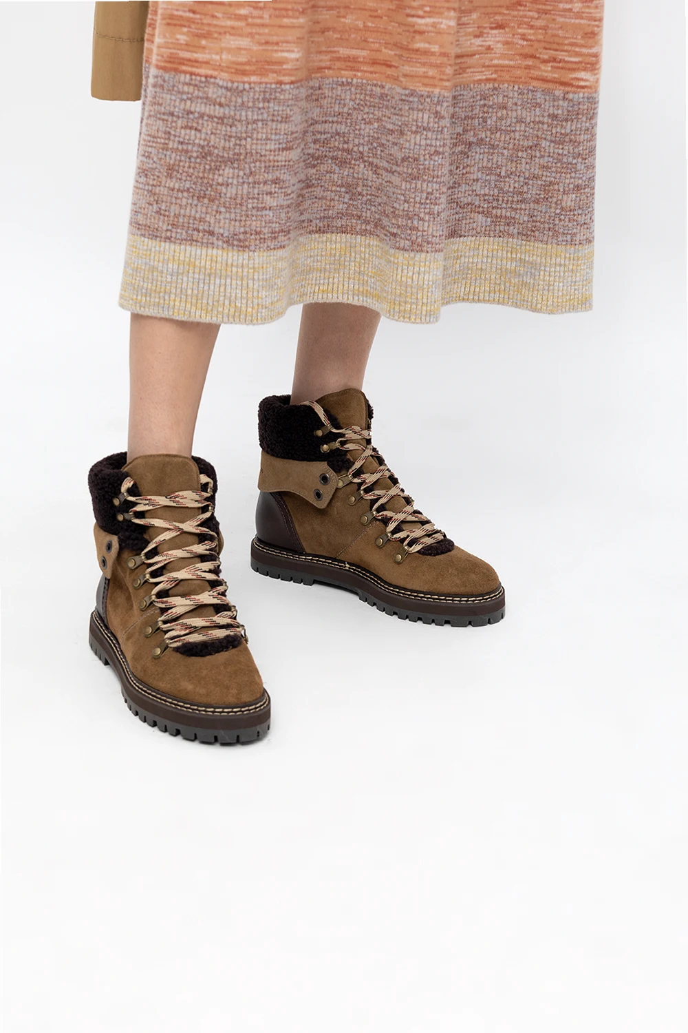 Brown ‘Eileen’ combat boots from See By Chloe. Made from suede and leather, this lace-up model sits on a brown rubber sole and features an embroidered logo at the back.